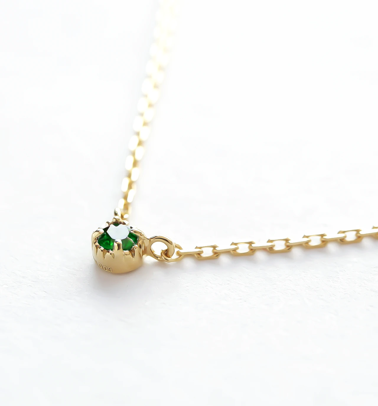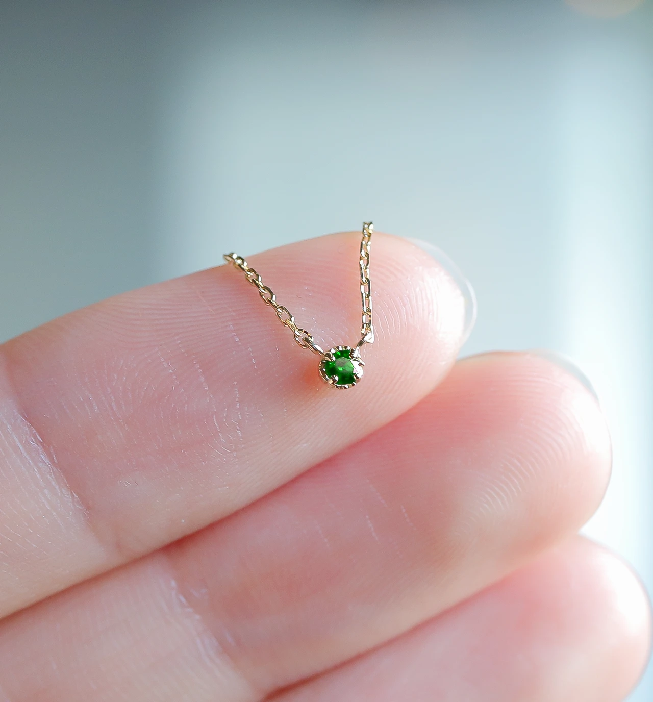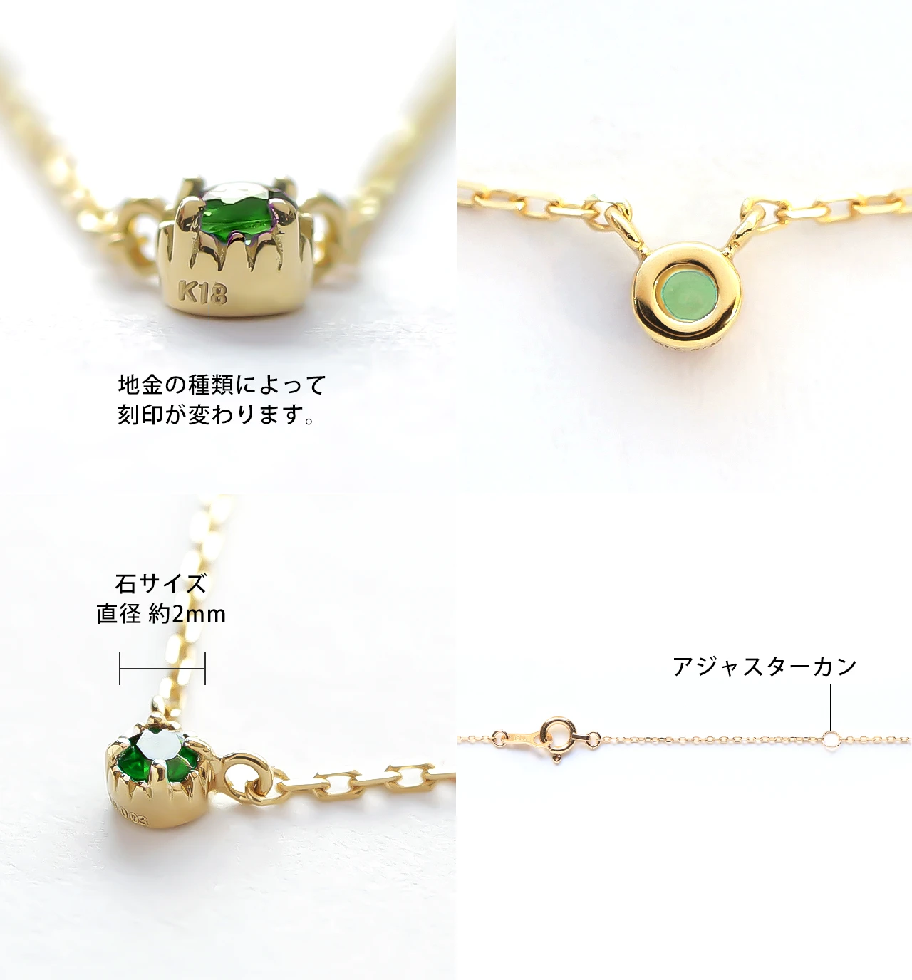 混じり気のない鮮やかなグリーンが美しい、ツァボライトを使用したK10(10金)のネックレスです。ツァボライトは独特な岩石の化学組成と特別な条件を必要とするため希少性が高く、その強く鮮やかな緑色はエメラルドを彷彿とさせるほどの魅力があります。ガーネットは1月の誕生石です。