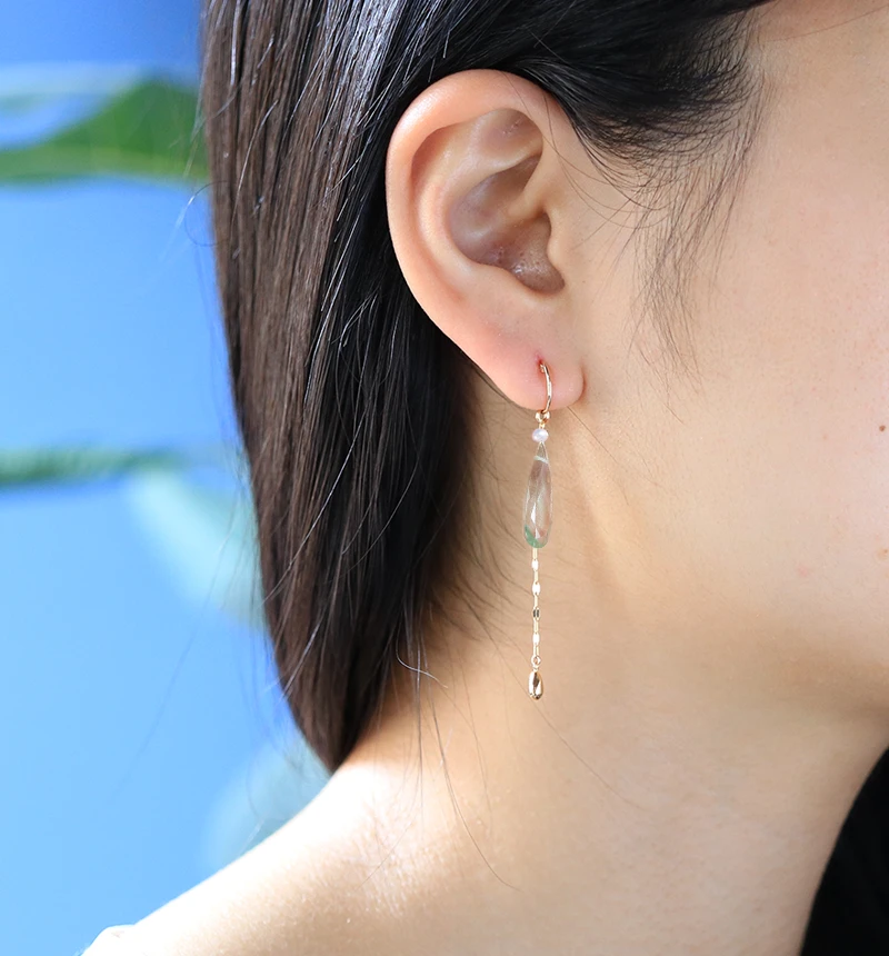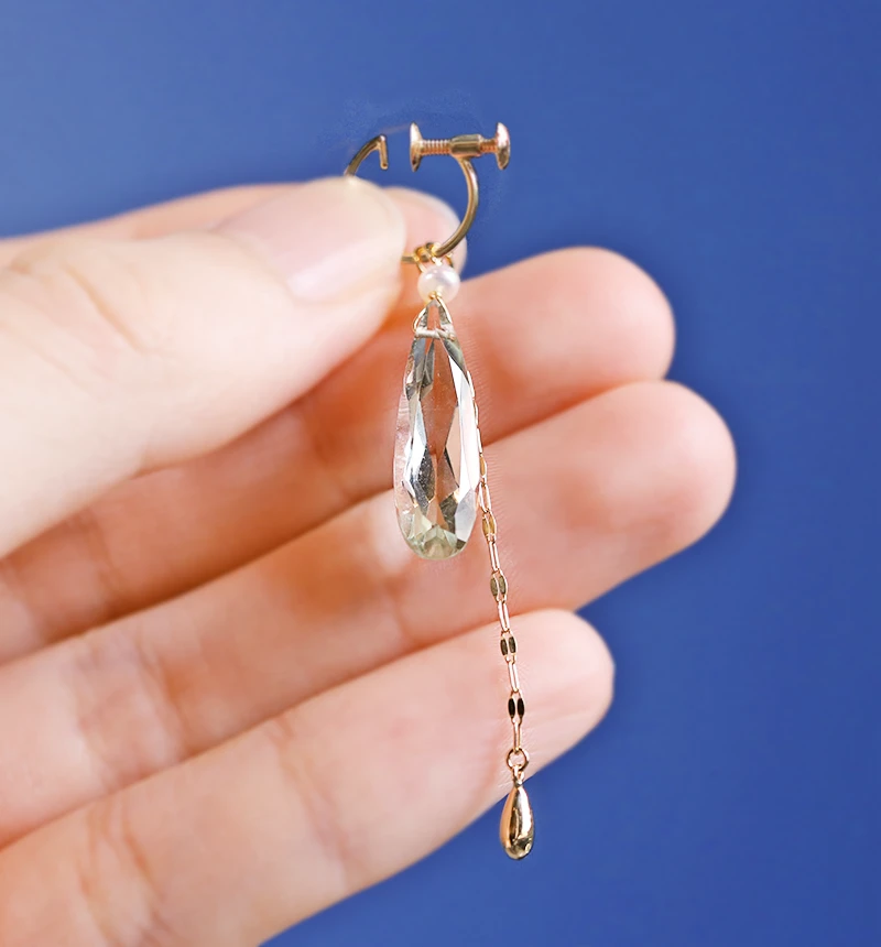 縦長のグリーンアメジストとチェーンが耳元で揺れるたびに軽やかに煌めきます。また、鮮やかなイエローゴールドと清々しい色のグリーンアメジスト、そしてさり気なくあしらわれた淡水パールは相性がよく、上品な可愛らしさを演出してくれます。