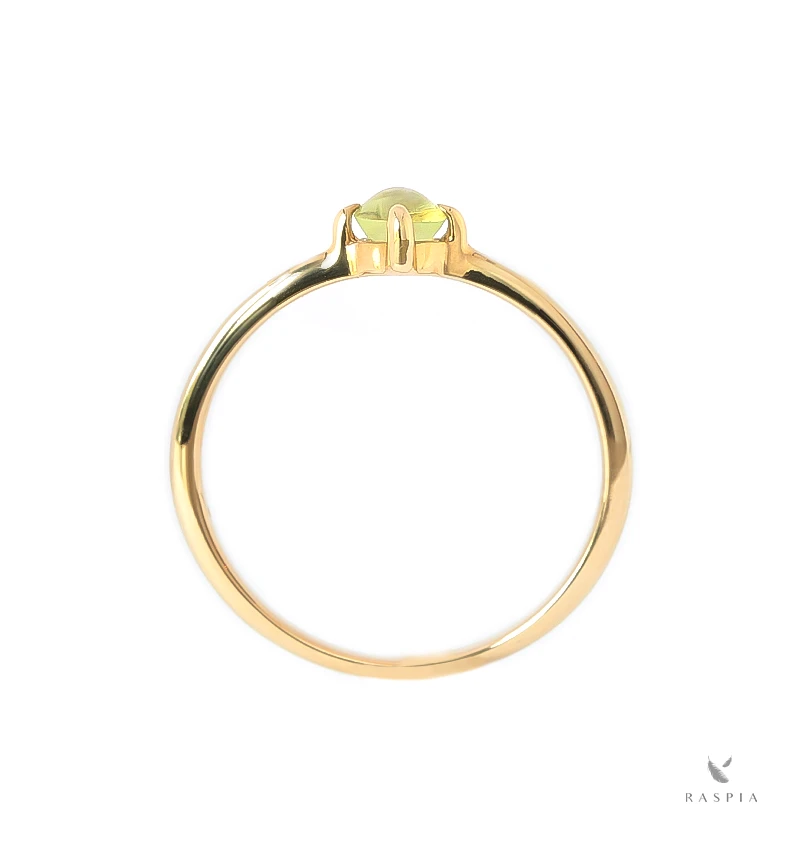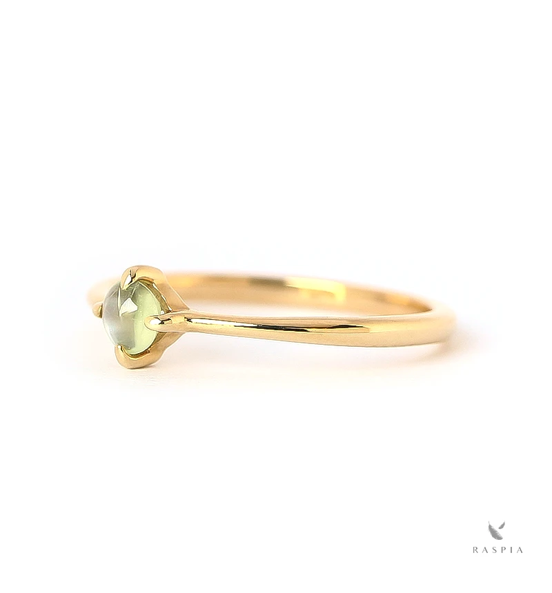 黄金の光をまとったような色味と表面の光沢が印象的な、カボションカットのクリソベリルキャッツアイを使用したK10ピンキーリングです。カボションカットはカット面がなく、丸みを帯びており、宝石本来の質感を味わうことができます。