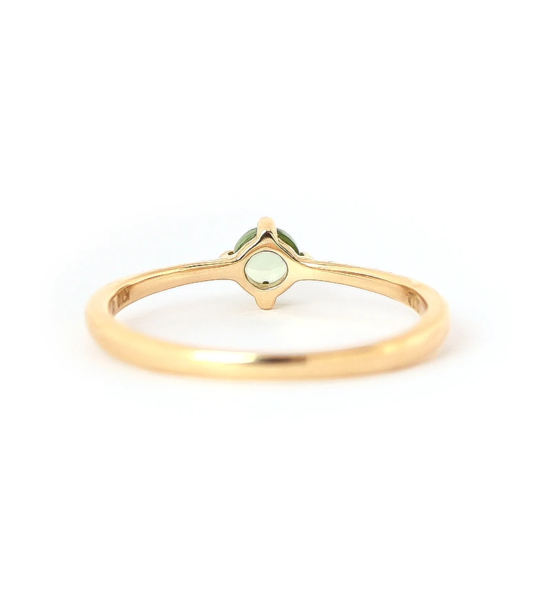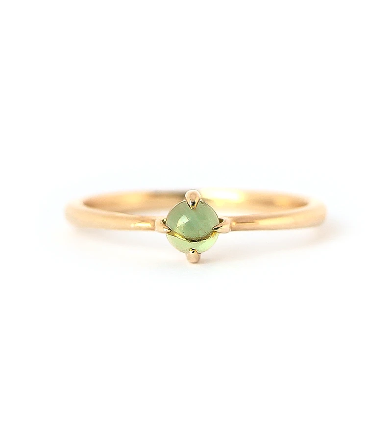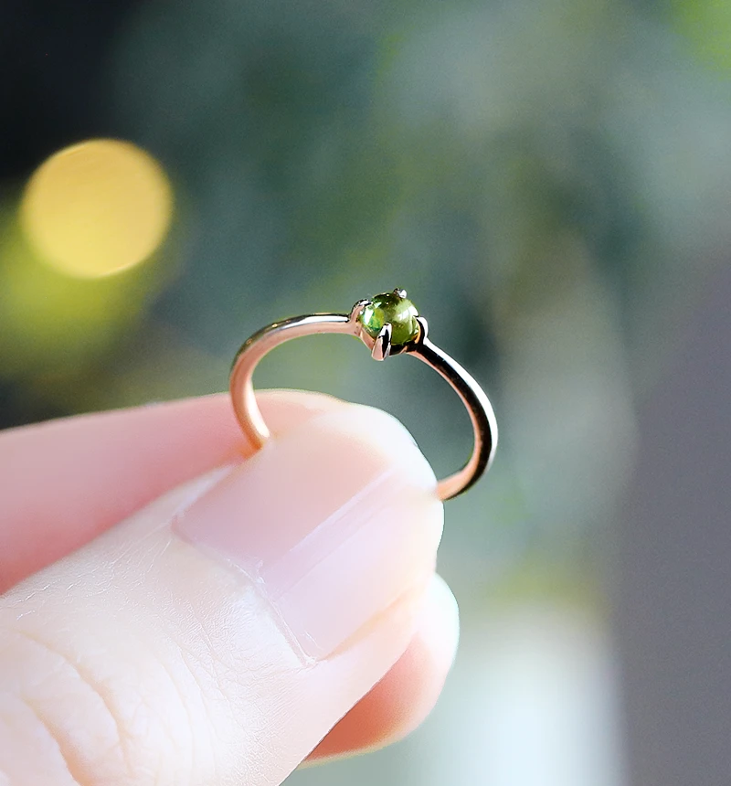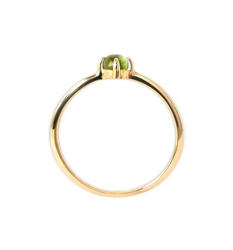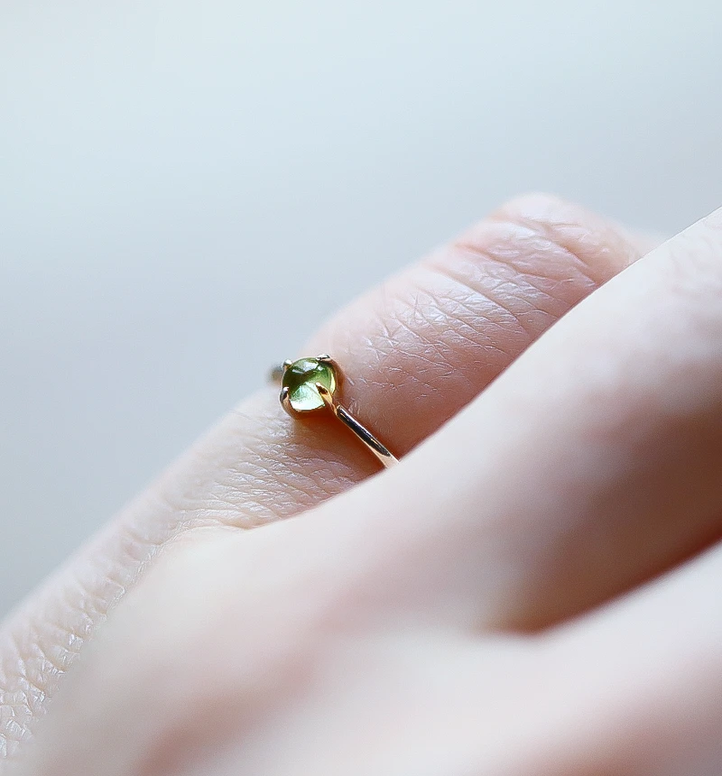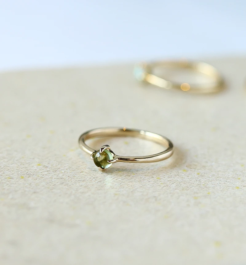 モルダウ川周辺でしか採れない、ガラス質の天然石。希少で価値が上がり続けている、カボションカットのモルダバイトを使用したK10ピンキーリングです。カボションカットはカット面がなく、丸みを帯びており、宝石本来の質感を味わうことができます。