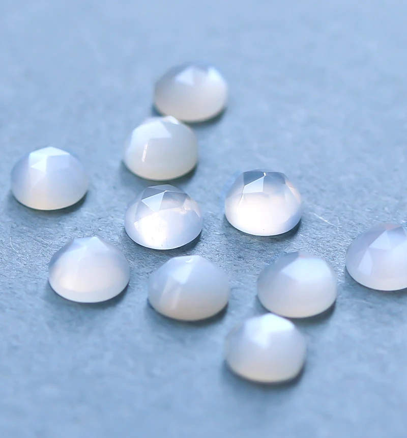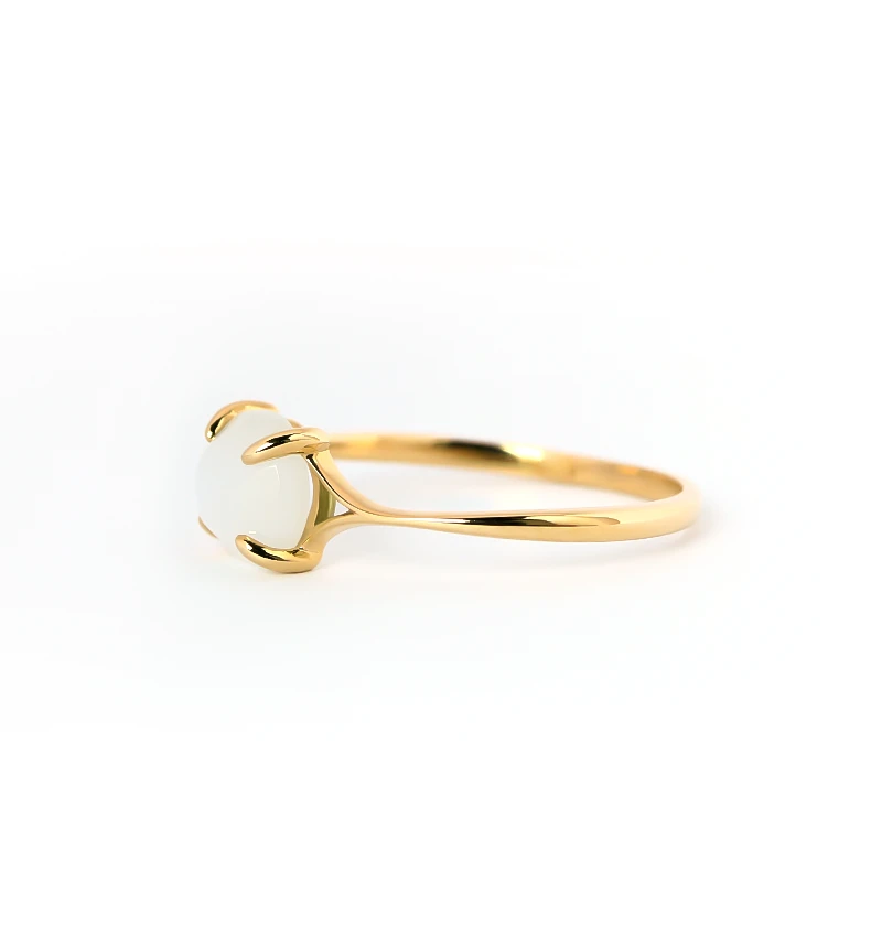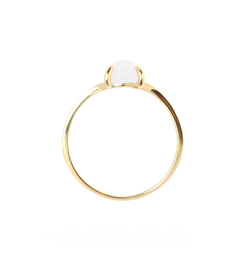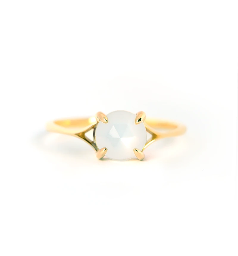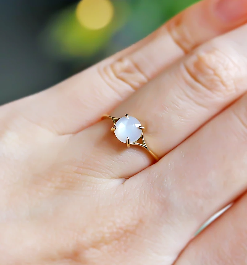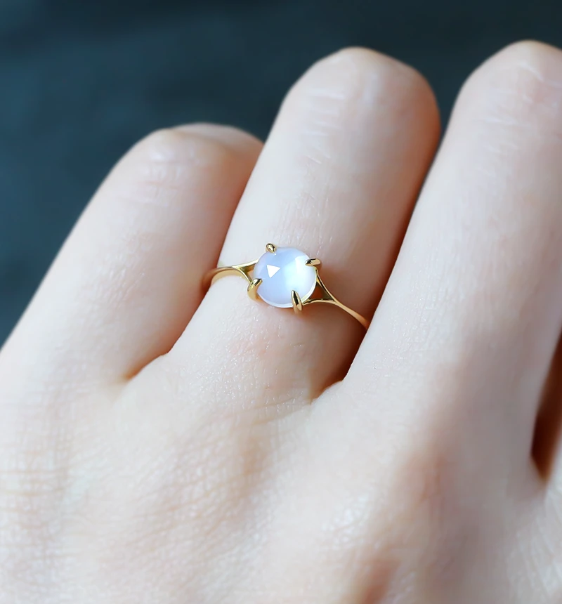 乳白色の中にほのかに光る青いシラーが美しい、ローズカットのホワイトムーンストーンを使用したK10リングです。ローズカットの表面に施された24面のカット面が光を反射し、キラキラと美しく輝きます。ムーンストーンは6月の誕生石です。