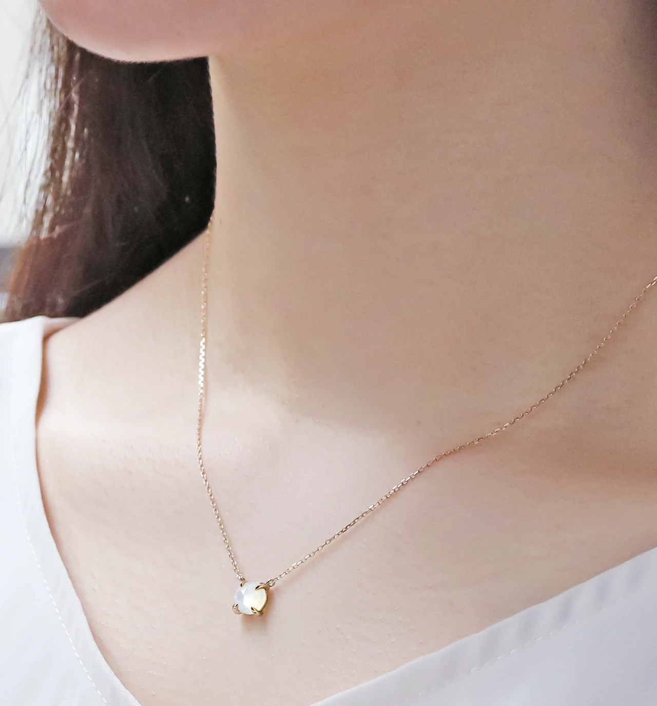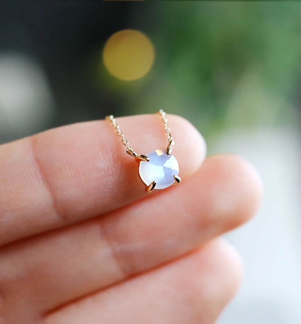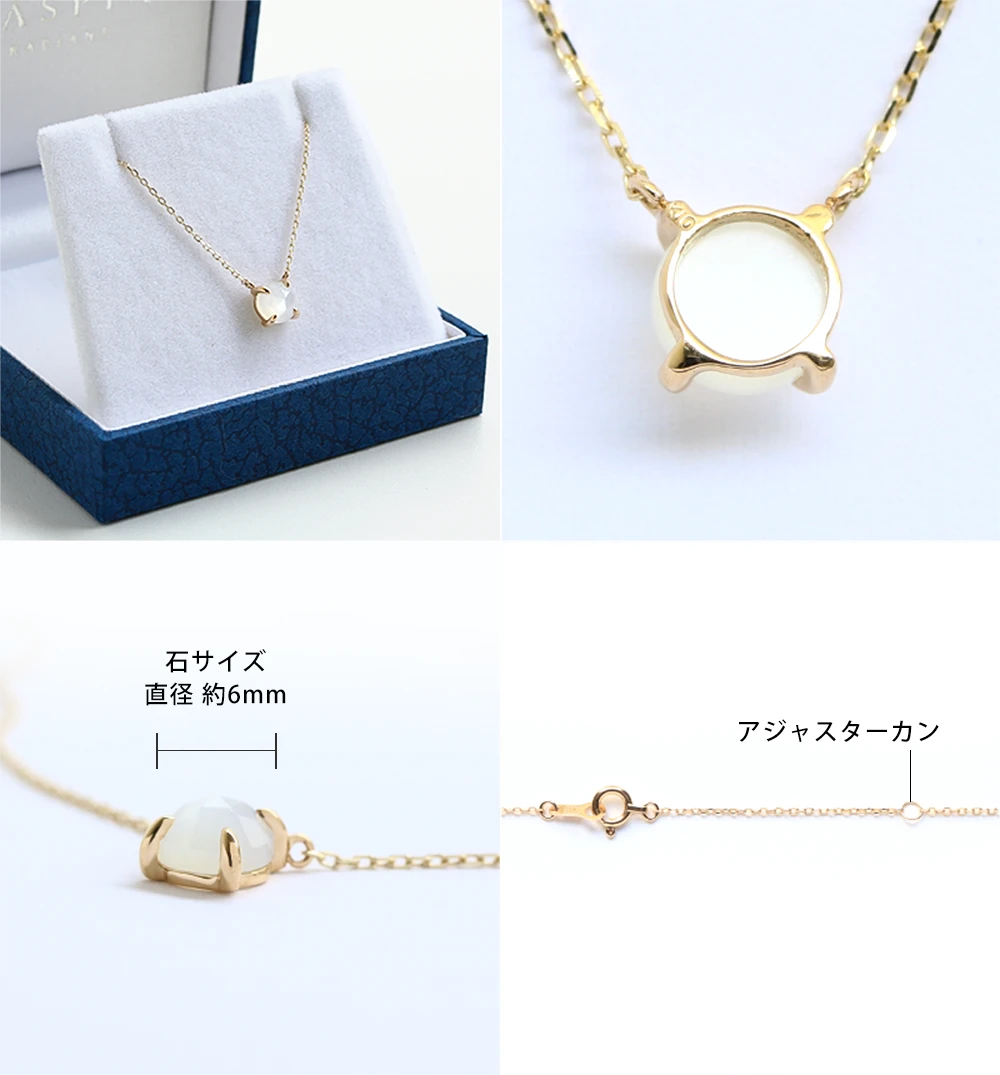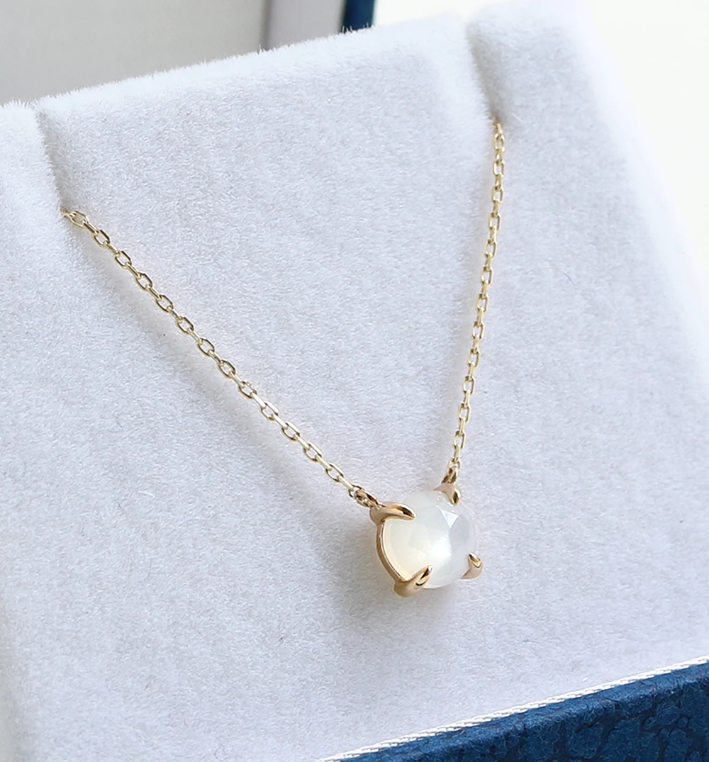クリアな純白のシラーが美しいローズカットのホワイトムーンストーンを使用したK10ネックレスです。ローズカットの表面に施された24面のカット面が光を反射し、キラキラと美しく輝きます。ムーンストーンは6月の誕生石です。
