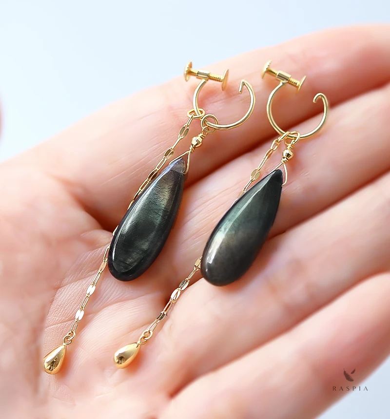 スペクトロライトの深い黒とのコントラストの美しさが最大限に引き立つようにしました。北極のオーロラを思わせるスペクトロライト、そしてさり気なくあしらわれたK18のカットビーズは相性がよく、上品で可愛く耳元で揺れます。