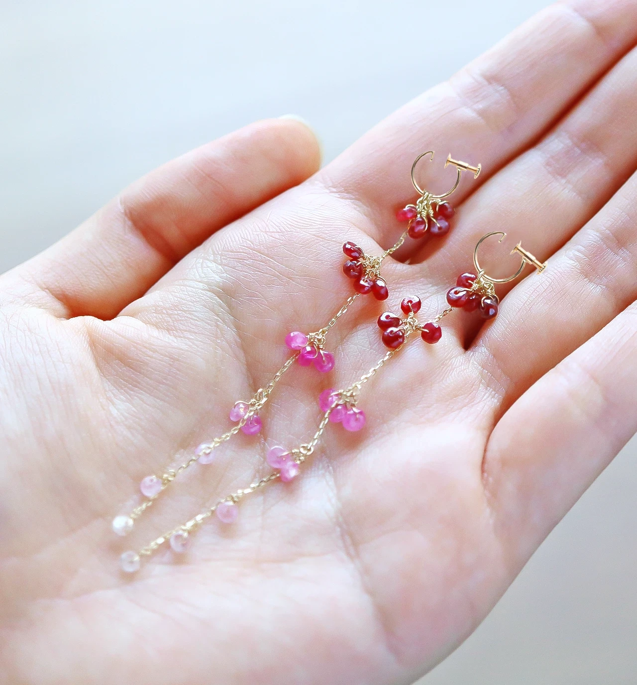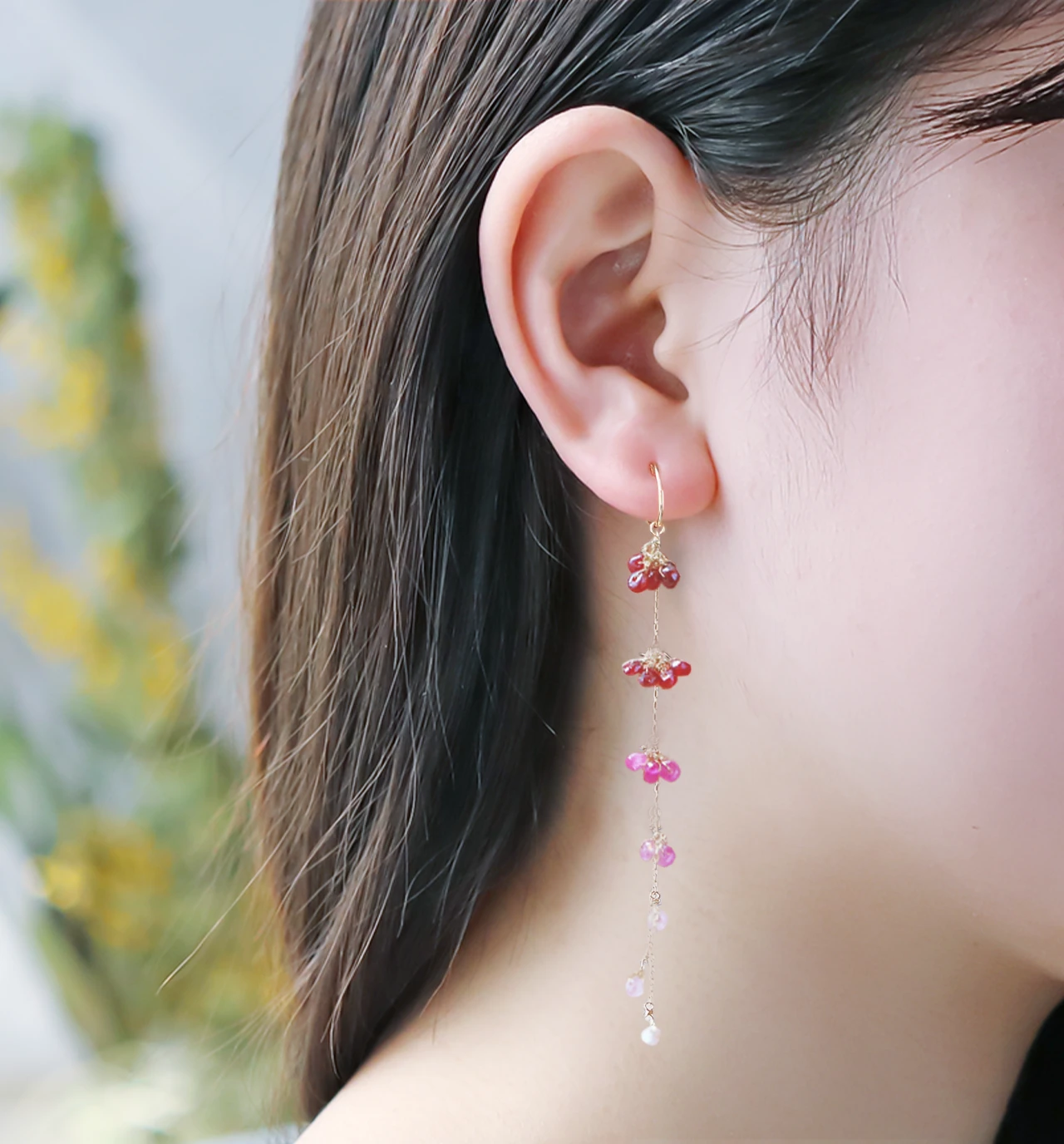 レッドカラーグラデーションのルビーを贅沢に使用した、ロングチェーンのK10イヤリングです。