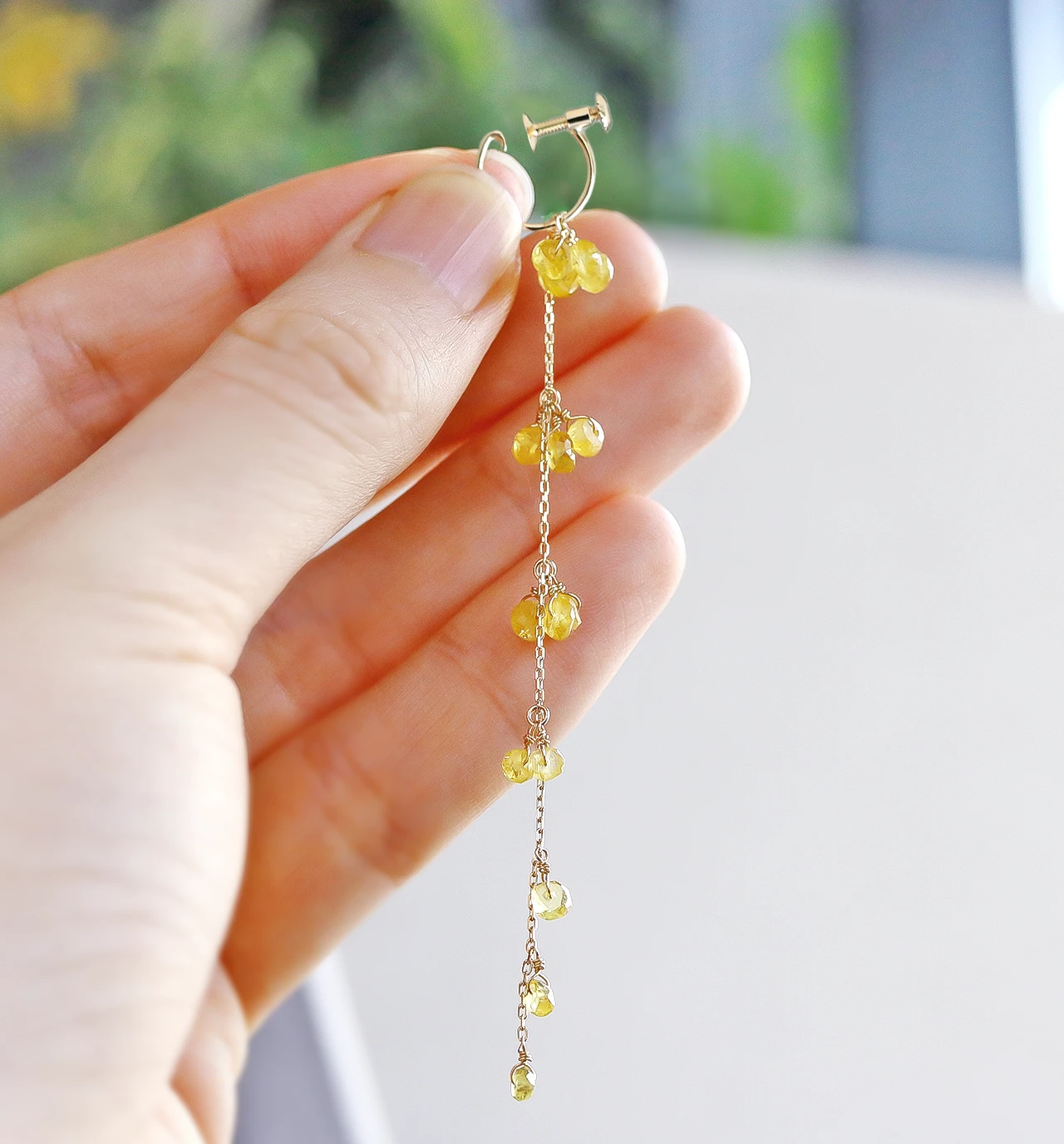 イエローカラーのサファイアを贅沢に使用した、ロングチェーンのK10イヤリングです。