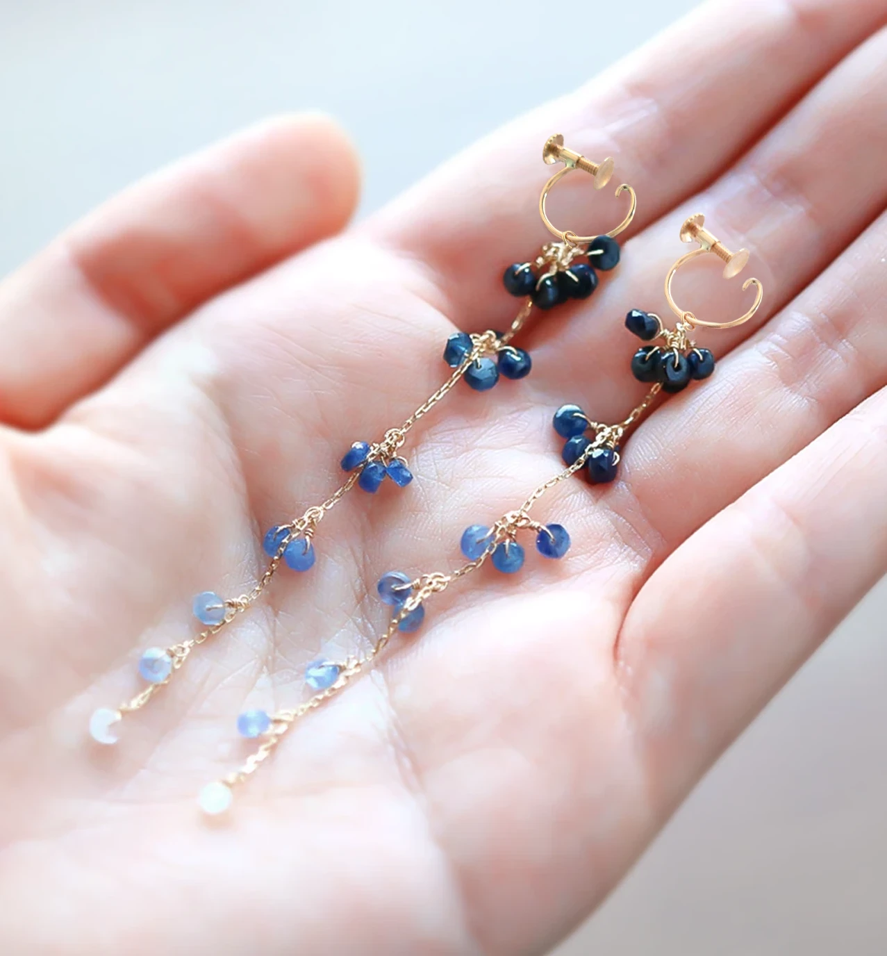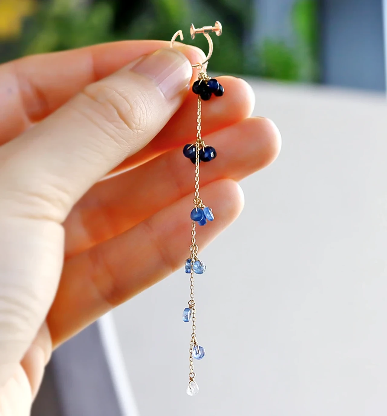 ブルーカラーグラデーションのサファイアを贅沢に使用した、ロングチェーンのK10イヤリングです。