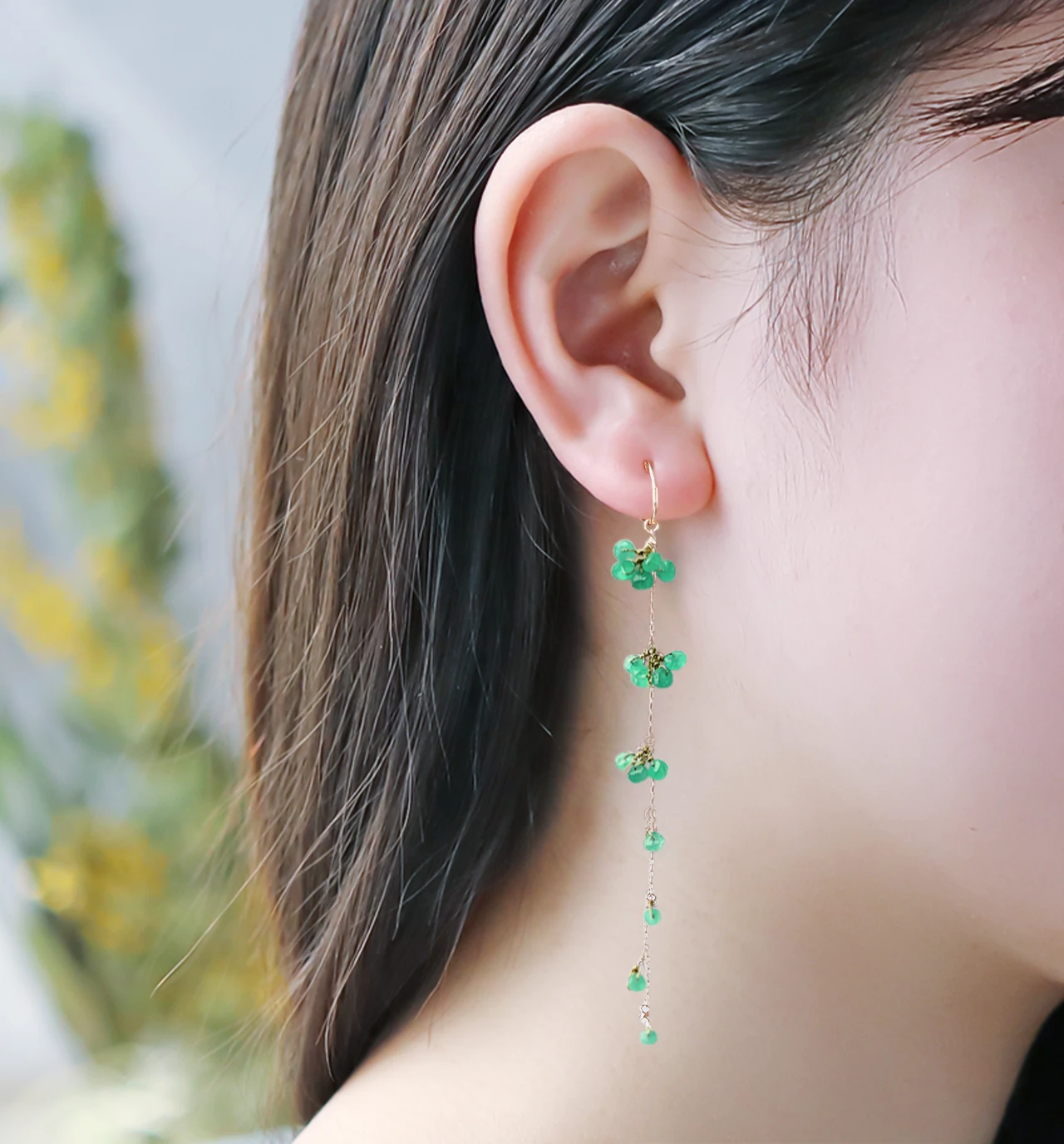 ロングチェーンに多くの美しいエメラルドがついたデザインは、顔まわりを華やかにしつつも、縦のラインが強調されフェイスラインをすっきりと見せてくれます。