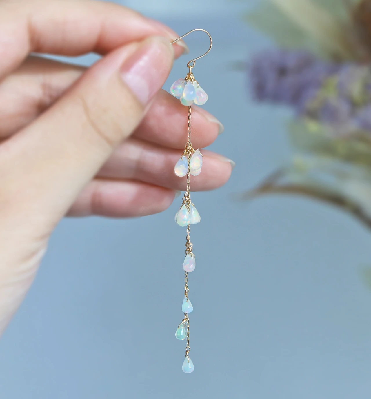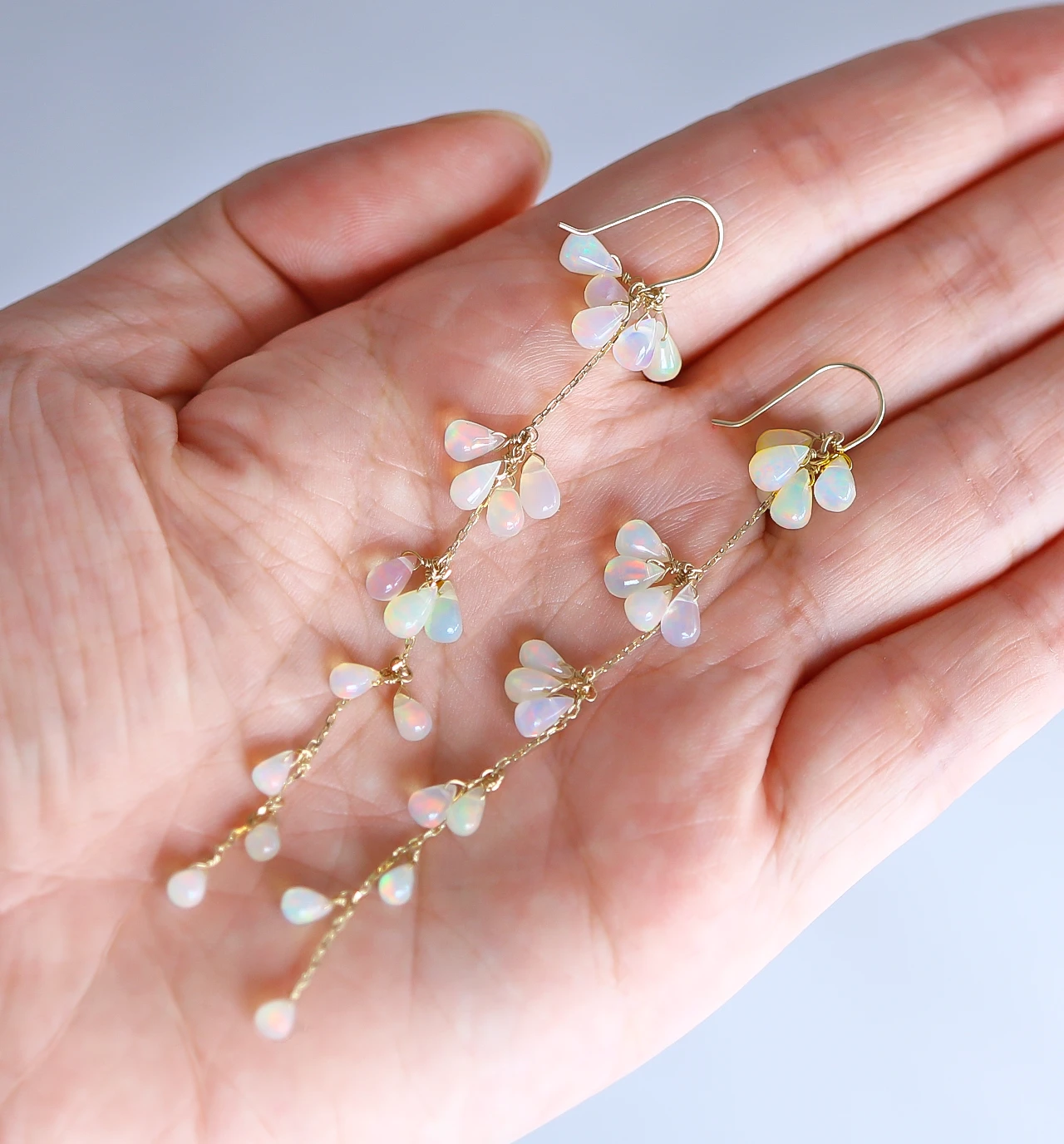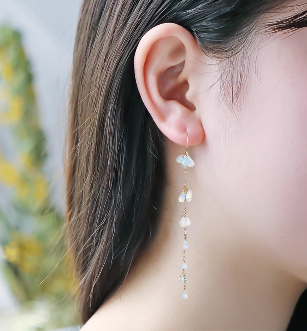 エチオピア産の高品質な「プレシャスオパール」を贅沢に使用した、ロングチェーンのK10フックピアスです。ドロップカットのプレシャスオパールを34粒使用。動きに合わせて耳元で柔らかく揺れるたびに、つるんとした透き通るホワイトのきらめきと、鮮やかな虹色の遊色が全体から楽しめるデザインです。