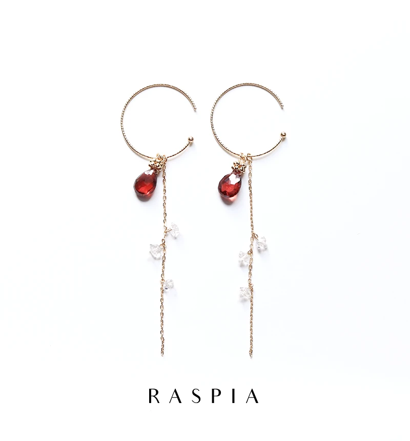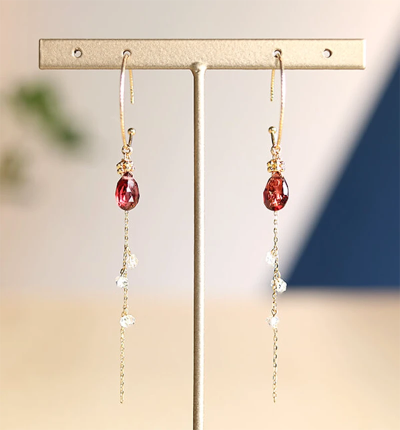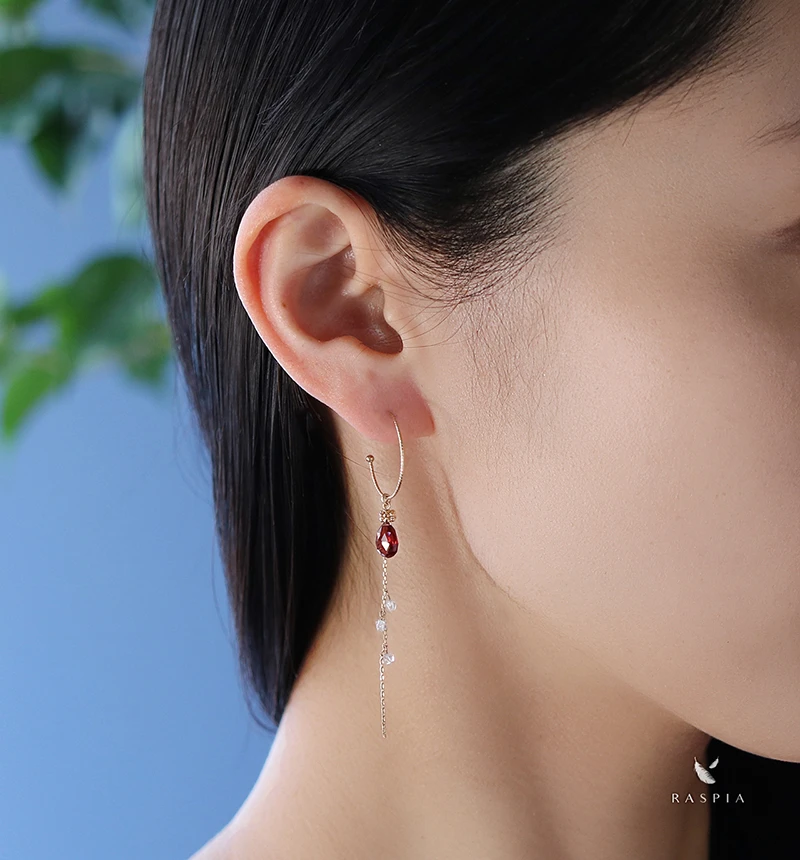 シックな赤のアルマンディンガーネットに透明のハーキマーダイヤモンドを使用したピアス。深い赤色は大人の女性の魅力をより引き立たせ、アクセントの透明の輝きでピュア感もプラス。