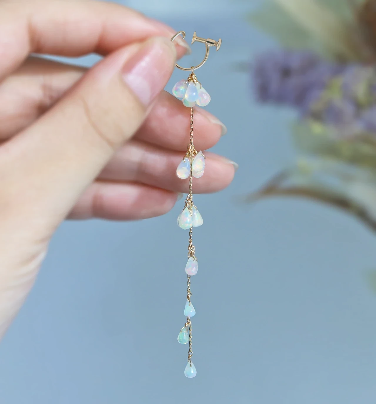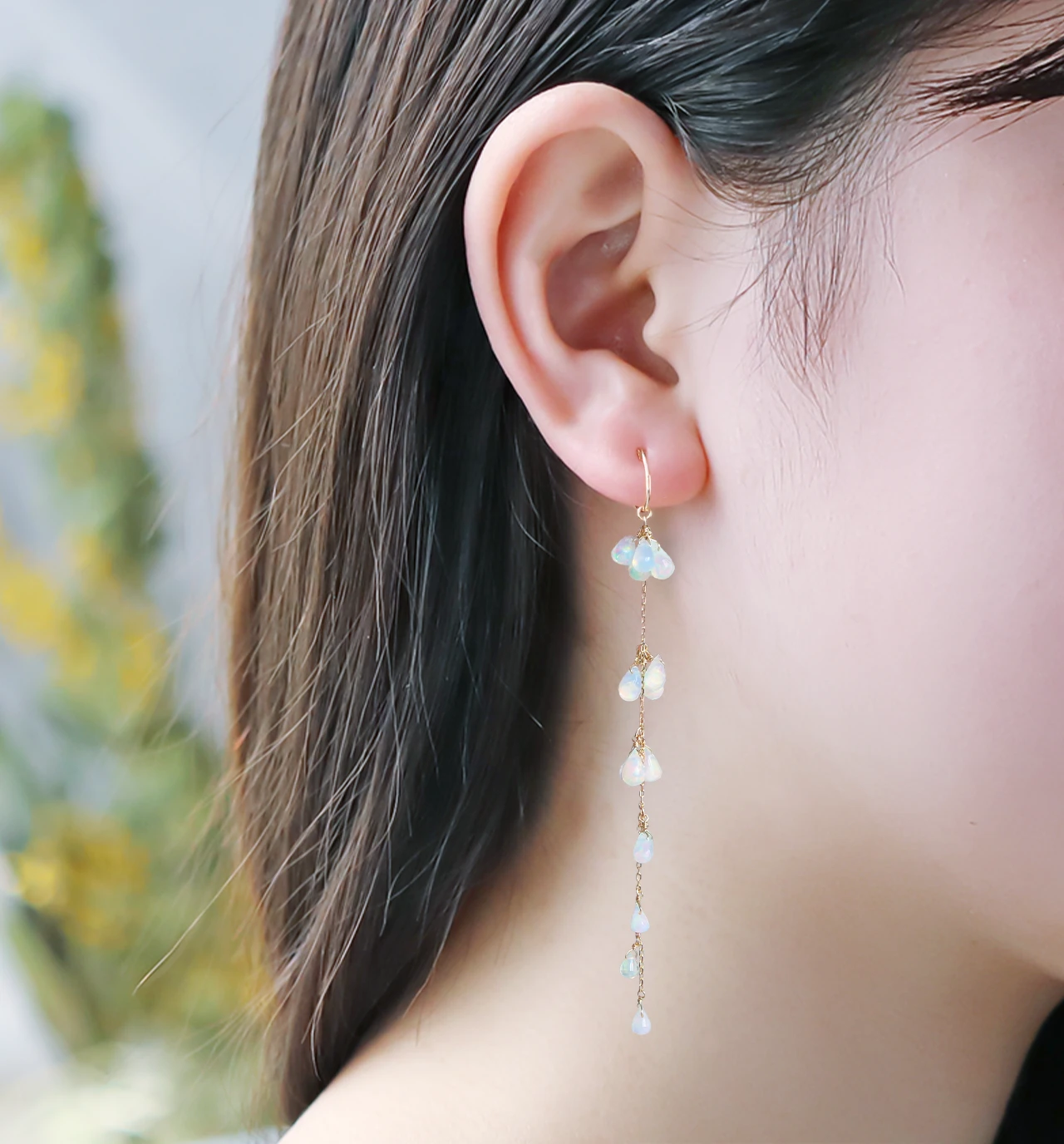 ロングチェーンに多くの美しいプレシャスオパールがついたデザインは、顔まわりを華やかにしつつも、縦のラインが強調されフェイスラインをすっきりと見せてくれます。
