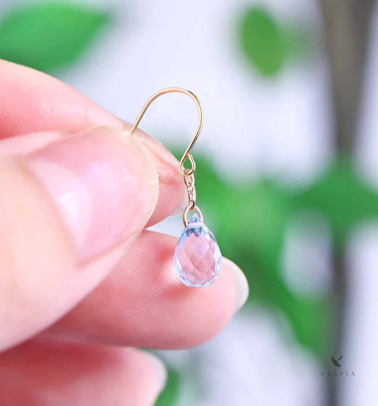 春の海の水面のような淡く澄んだブルーが輝く、アクアマリンのK10フックピアスです。透明感たっぷりの淡いブルーは日本人の肌馴染みもよく、職人が丁寧にカットしたブリオレットカットによって、耳元でキラキラと光が反射し、清楚な華やかさを与えてくれます。