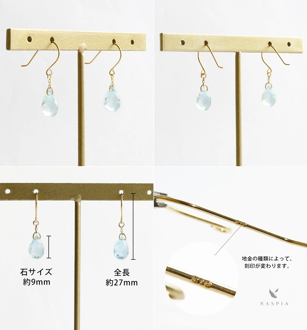 | サイズ | 【ピアス】サイズ:縦 約14mm×横 約10mm フックの太さ 0.5mm【石】アクアマリン(ブリオレットカット):約9mm×6mm | ||