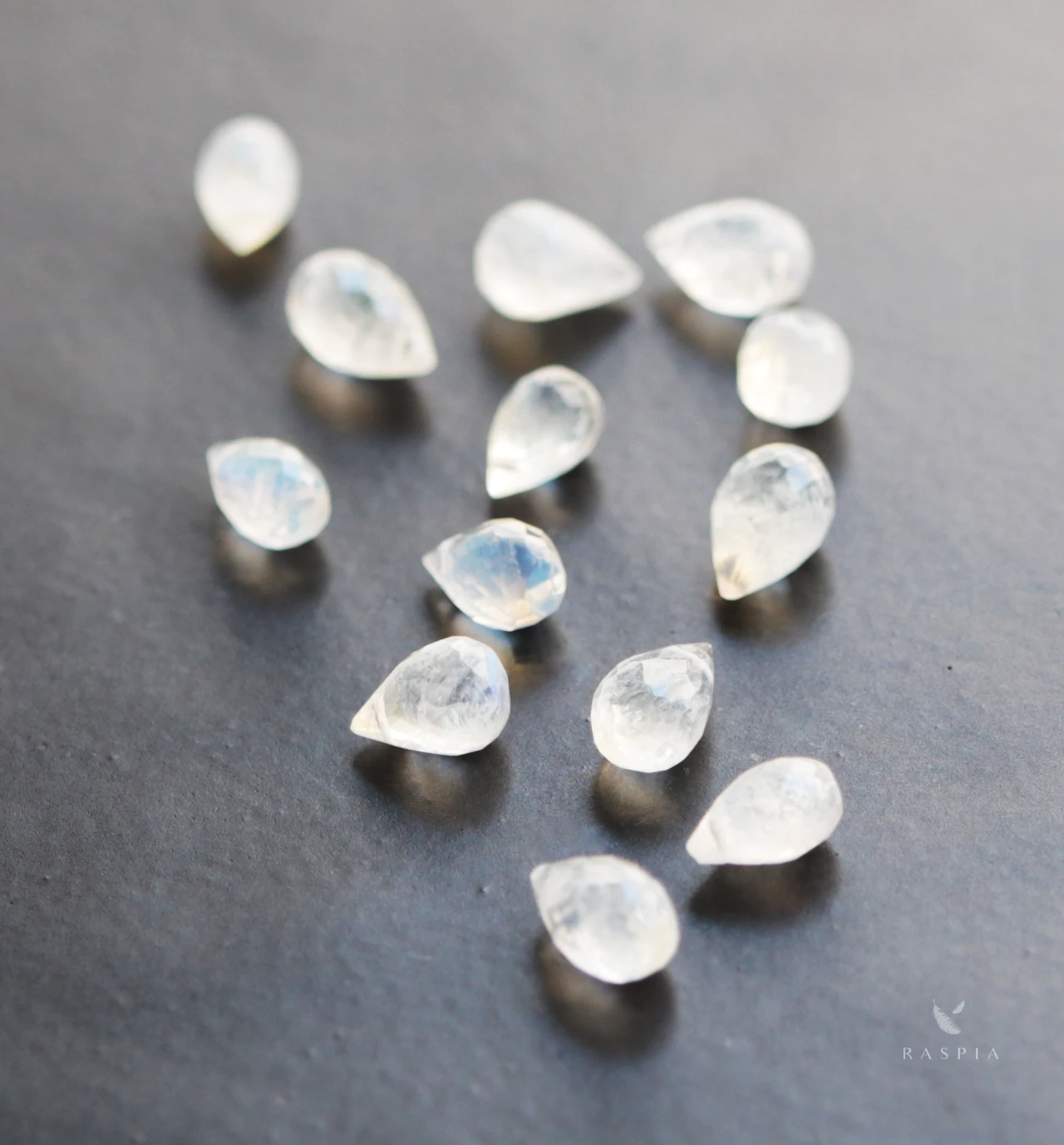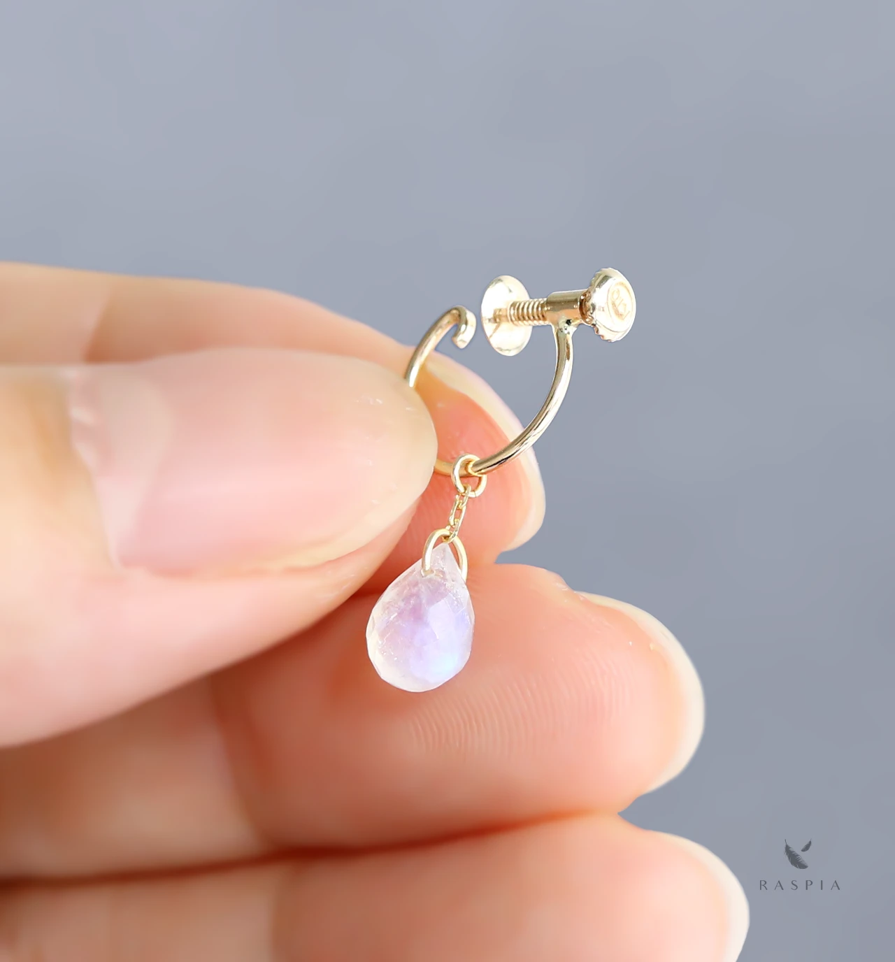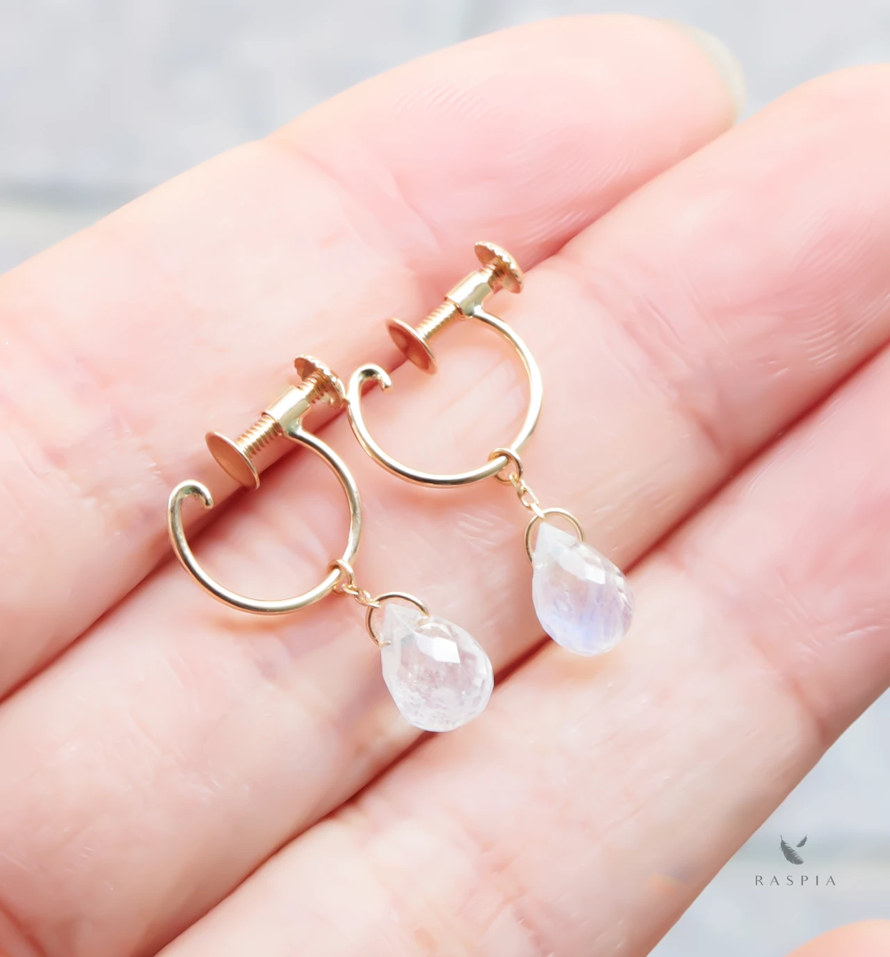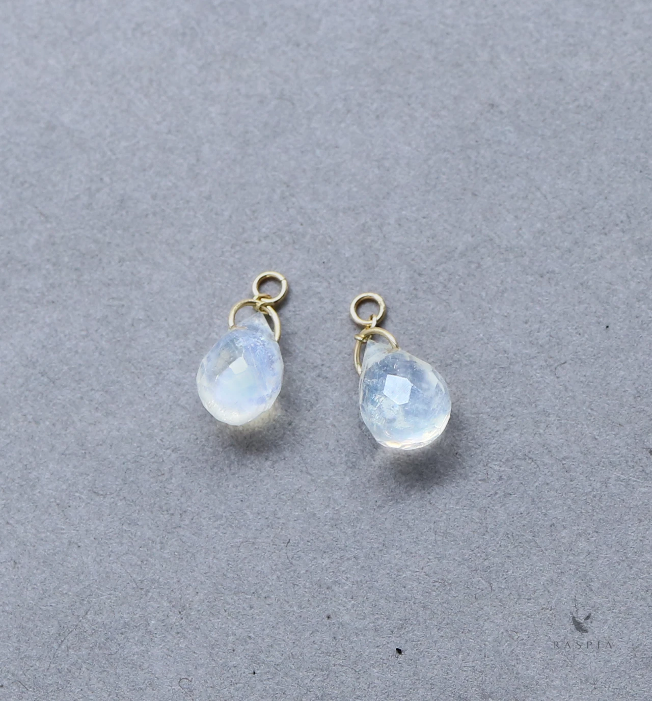 ブリオレットカットのコロンとしたフォルム。その中に石それぞれのクラックや内包物が複雑な乳白色を表現し、可愛らしくもどこか儚げな印象のあるアイテム。石の上質感を引き立たせるシンプルなデザインと、ムーンストーンのやさしい輝きが、いつものコーディネートを上品な印象に仕上げてくれます。