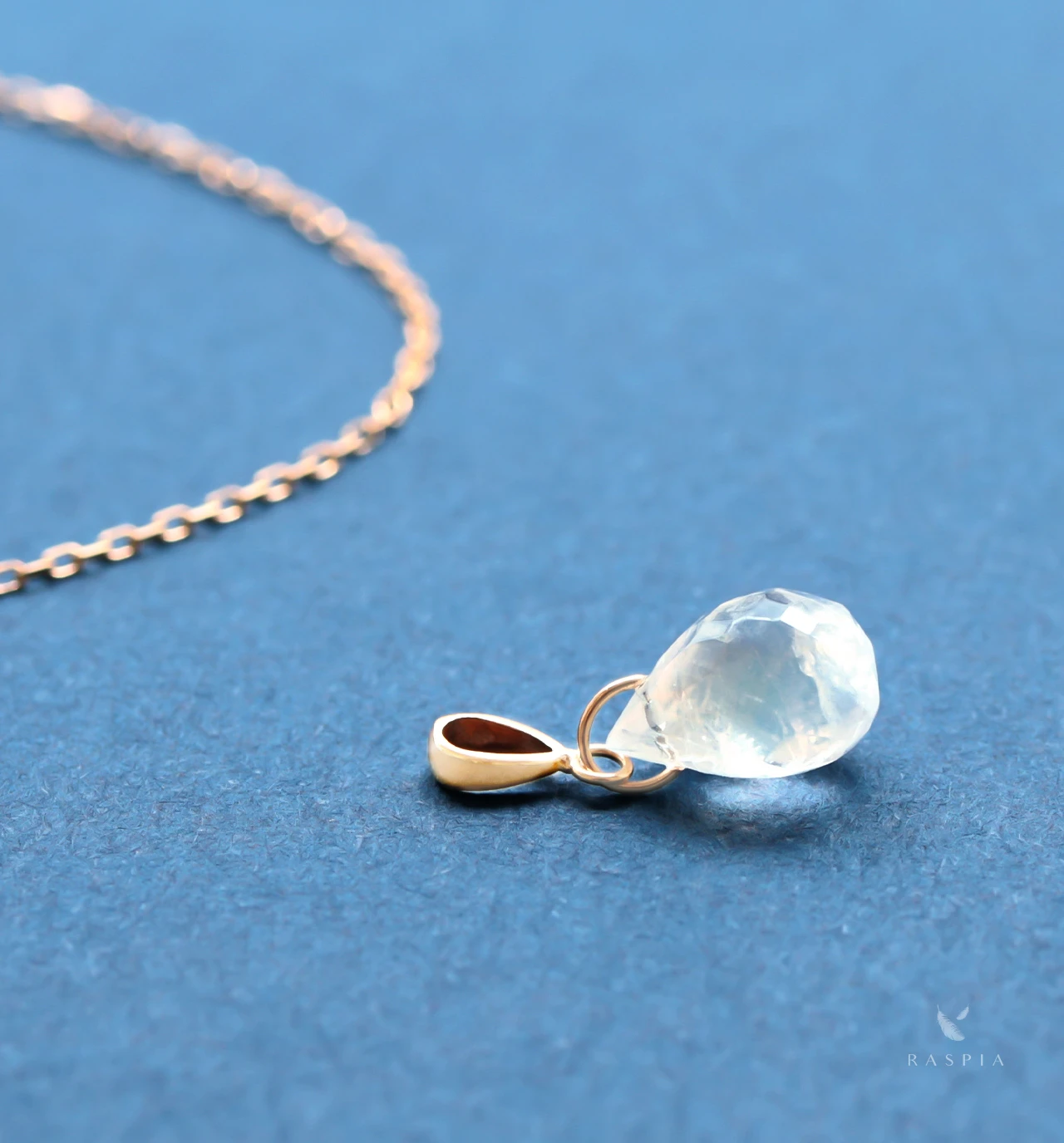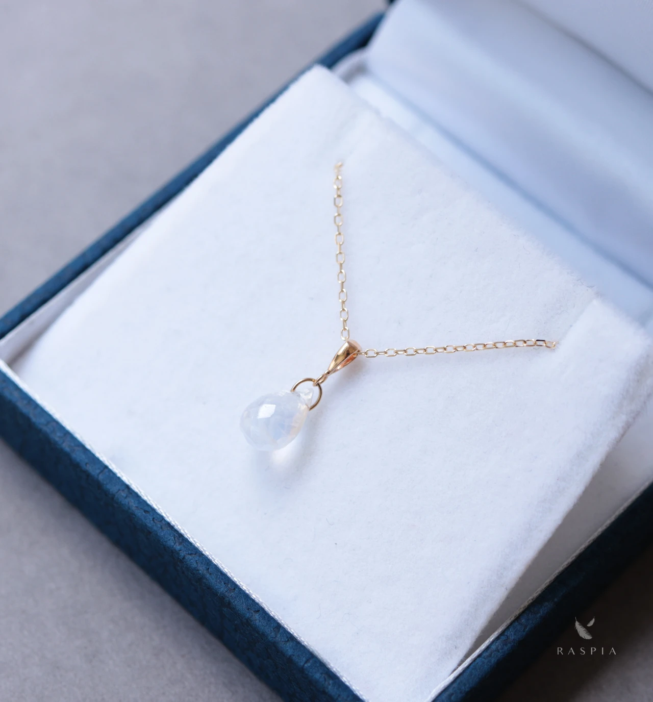 ブリオレットカットのムーンストーンが胸元で確かな存在感を放つ、ネックレスチャームです。金具は石の存在を引き立てるサイズ感にこだわりました。また、身体の動きに合わせ石が揺れてきらめき、それでいて石がいつも正面を向くように絶妙なバランス調整を施しています。