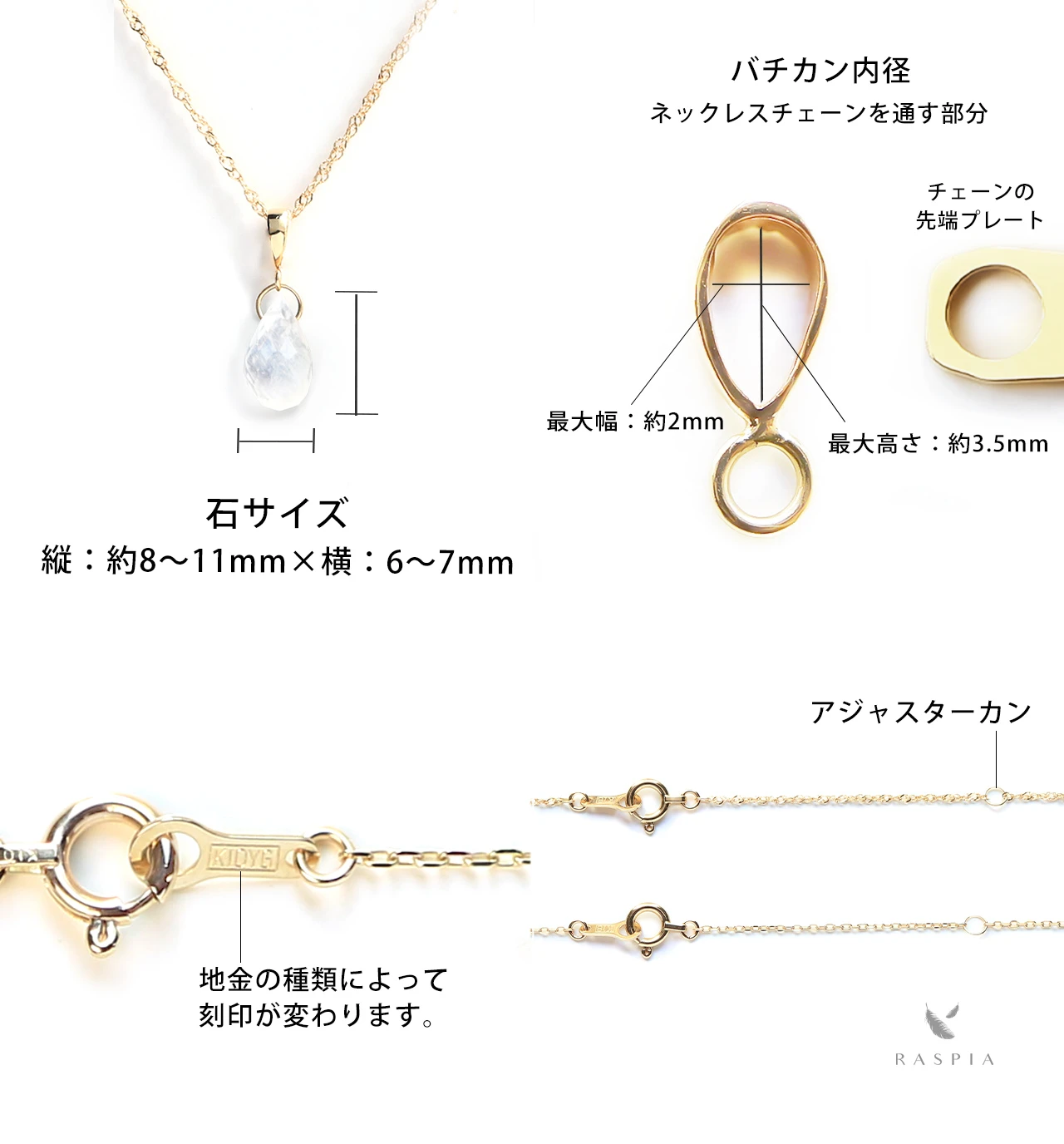 | サイズ | ムーンストーン:縦 約8〜11mm × 横 約6〜7mm バチカン内径:高さ 最大(約)3.5mm/幅 最大(約)2mm チェーン全長は40cm・45cm・50cmよりお選びいただけます。 | ||