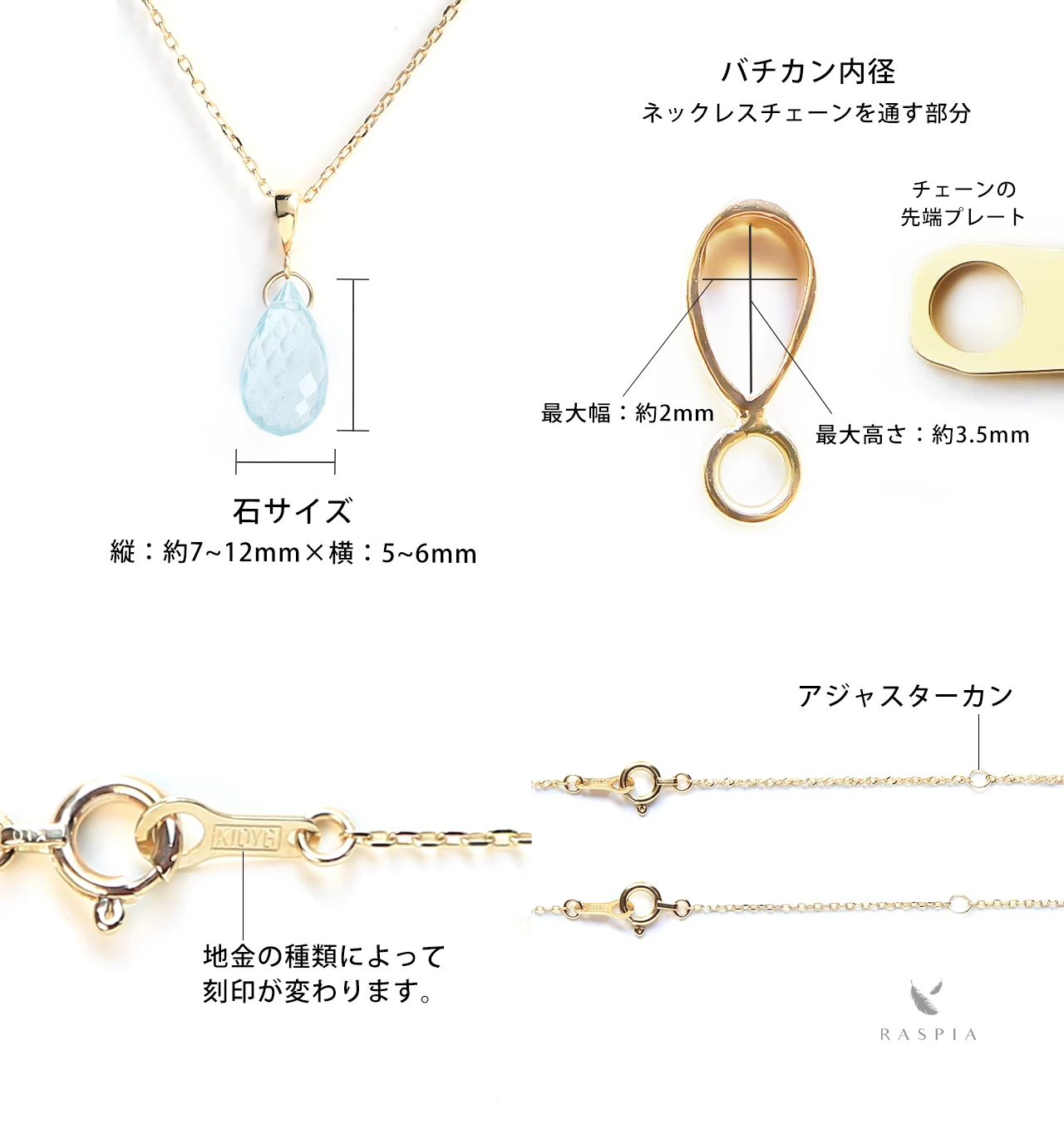RASPIA(ラスピア)は、シンプルで大人可愛いデザインをイメージし、カラーストーン/天然石とK10(10金)/K18(18金)の本物のゴールド素材を使って手作りしています。