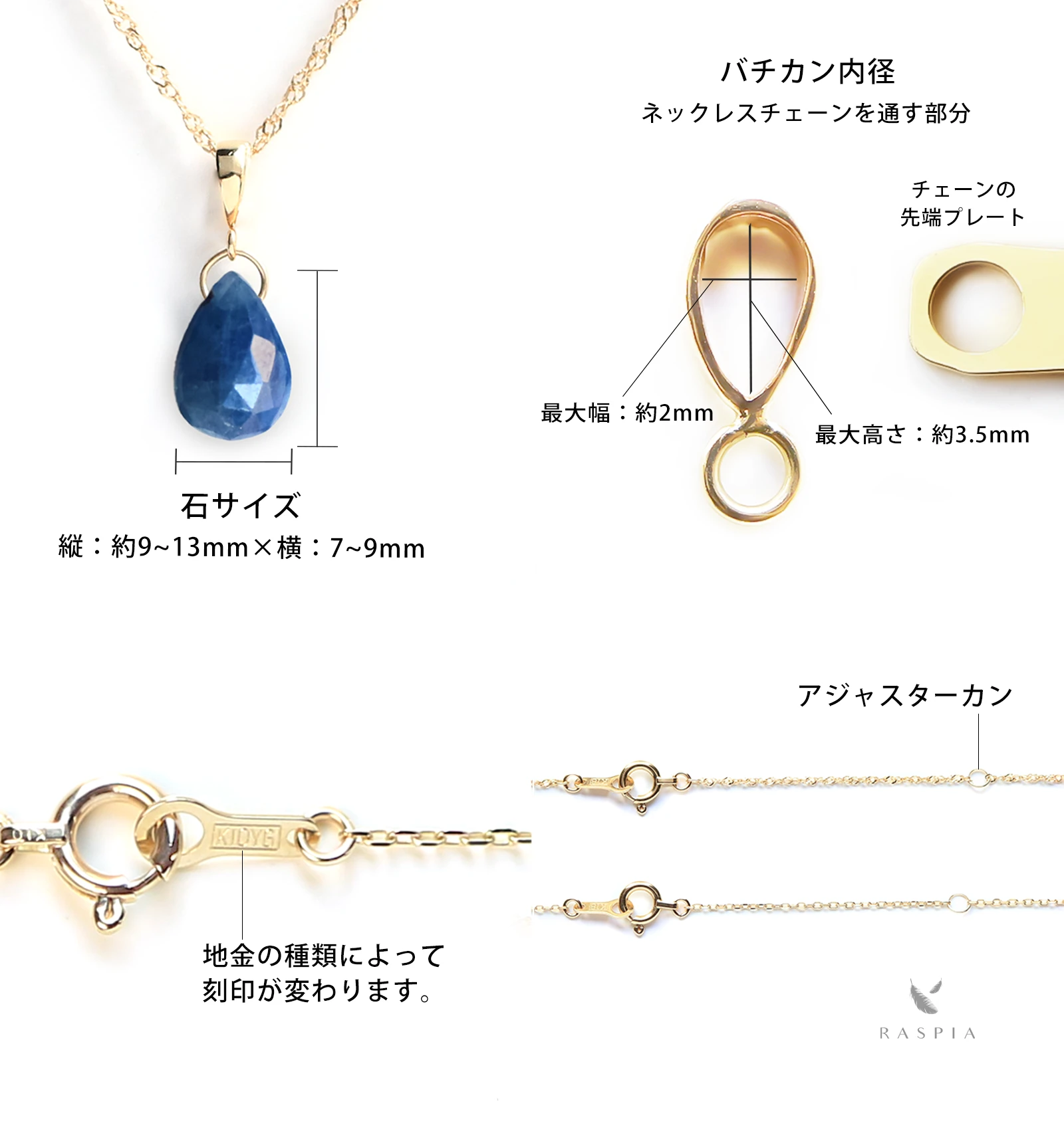 | サイズ | サファイア:約9〜13mm×約7〜9mm バチカン内径:高さ 最大(約)3.5mm/幅 最大(約)2mm チェーン全長は40cm・45cm・50cmよりお選びいただけます。 | ||