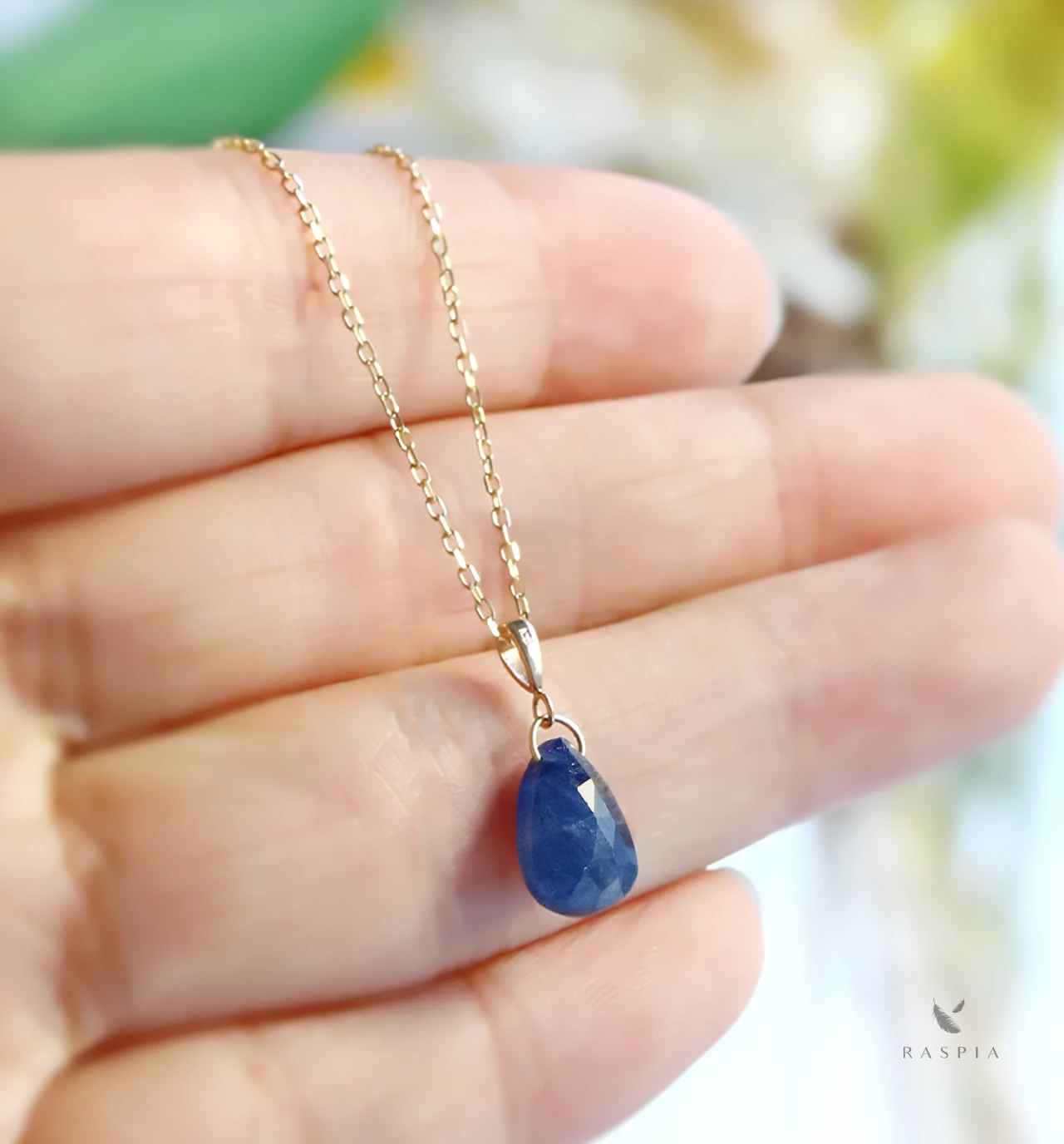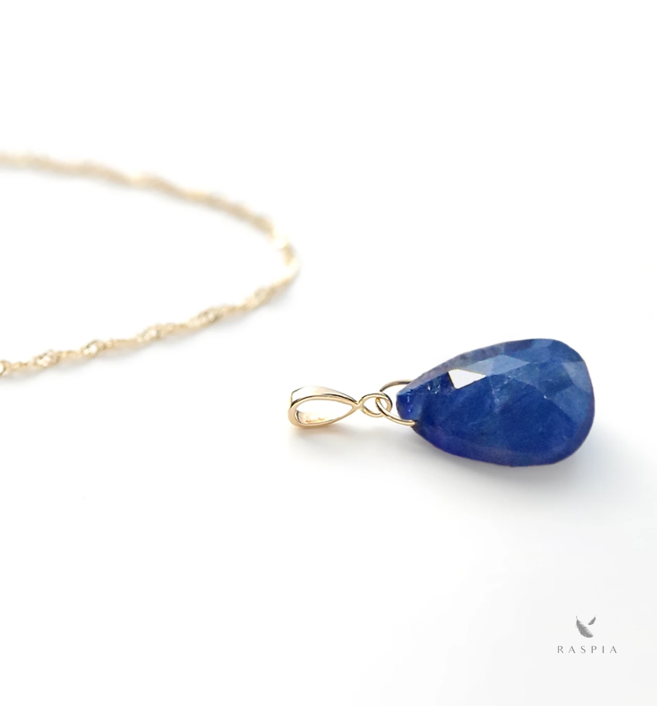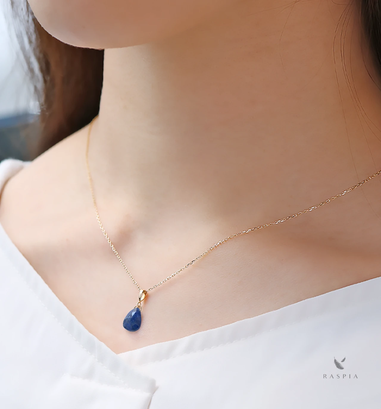 深みのある落ち着いたネイビーブルーが美しい、サファイアを使用したネックレスチャーム。サファイアは9月の誕生石です。