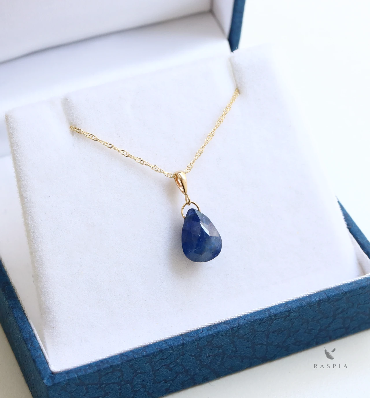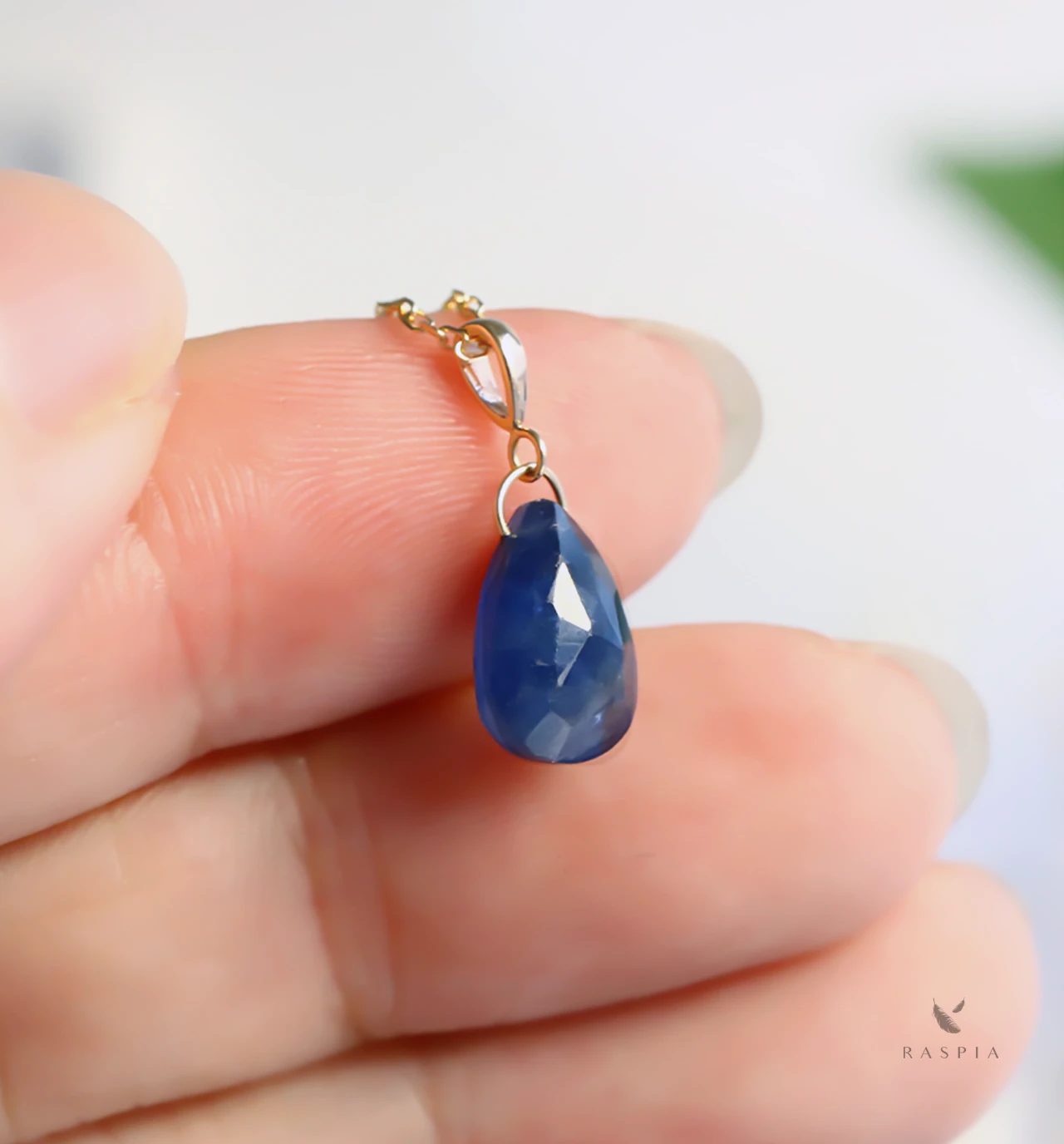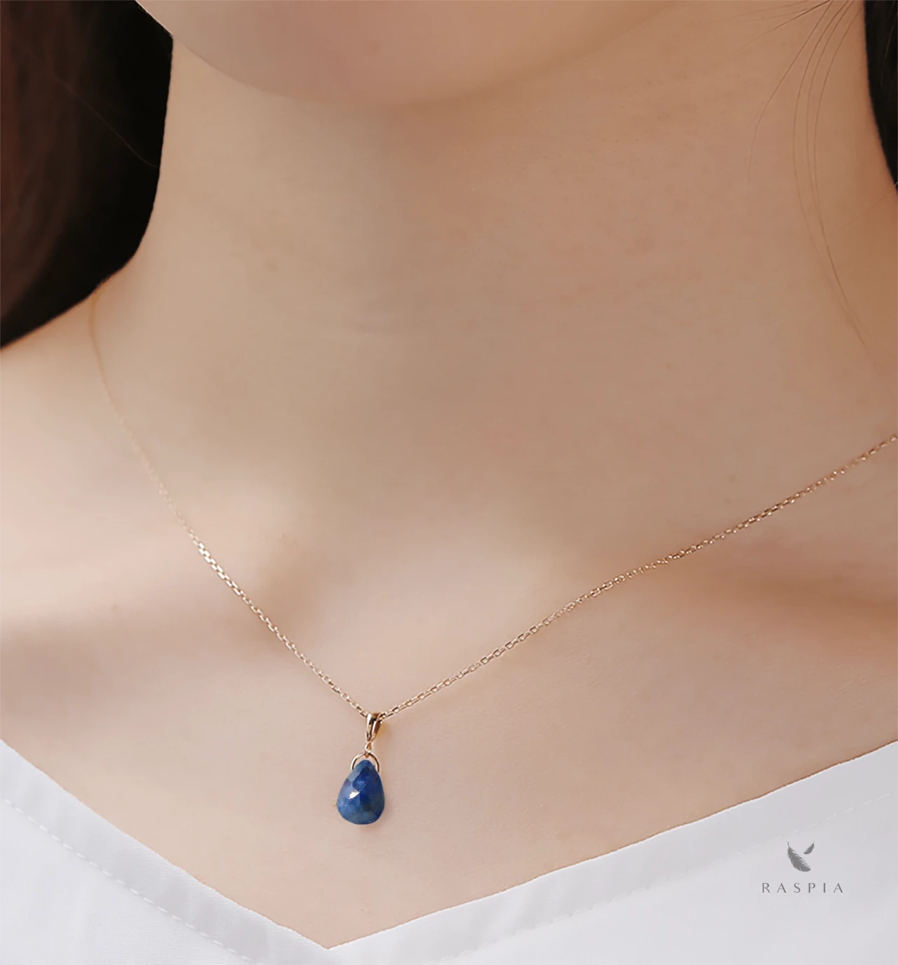 深みのある落ち着いたネイビーブルーが美しい、サファイアを使用したネックレスチャーム。サファイアは9月の誕生石です。