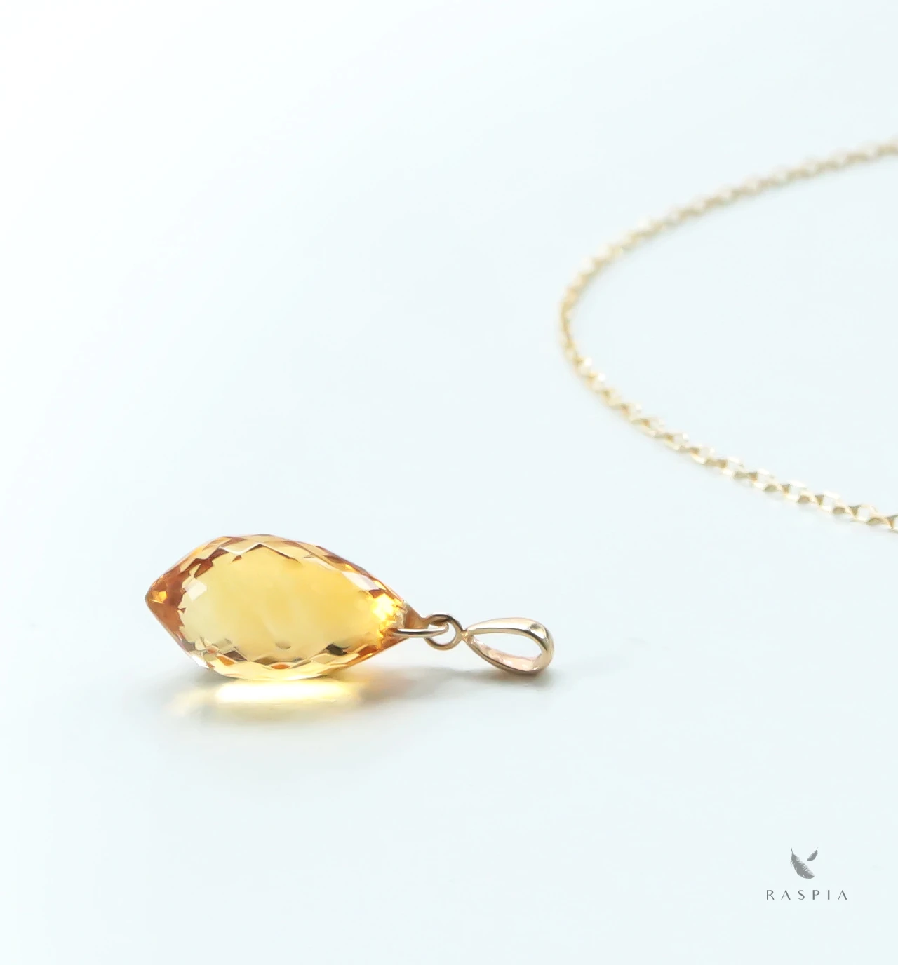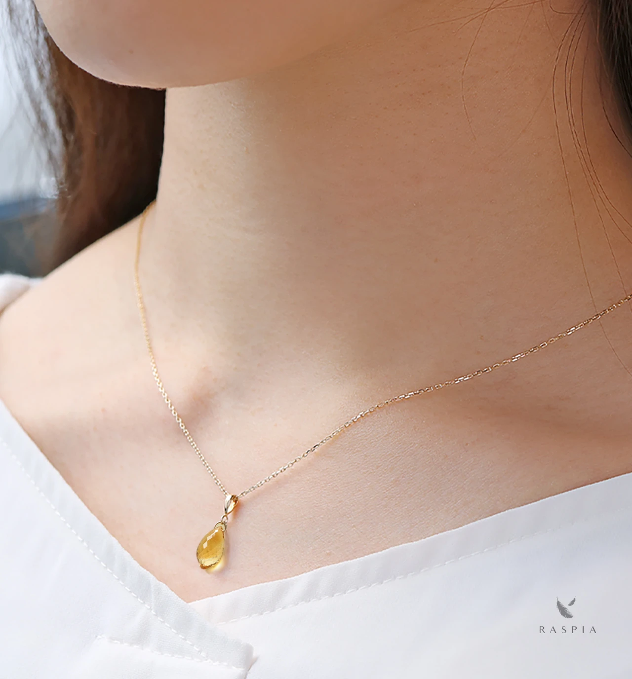 シャンデリアカットのシトリンが胸元で確かな存在感を放つ、ネックレスチャームです。金具は石の存在を引き立てるサイズ感にこだわりました。また、身体の動きに合わせ石が揺れてきらめき、それでいて石がいつも正面を向くように絶妙なバランス調整を施しています。