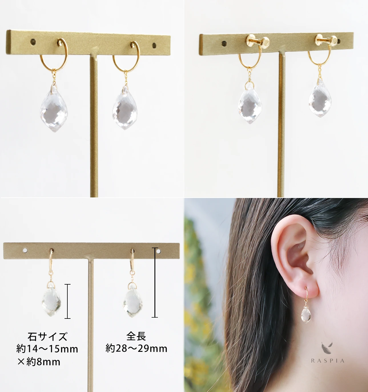 | サイズ | 【イヤリング】サイズ:直径10mm×太さ0.7mm【石】ロッククリスタル:縦 約14〜15mm × 横 約8mm【チャーム丸カン内径】約1.4mm | ||