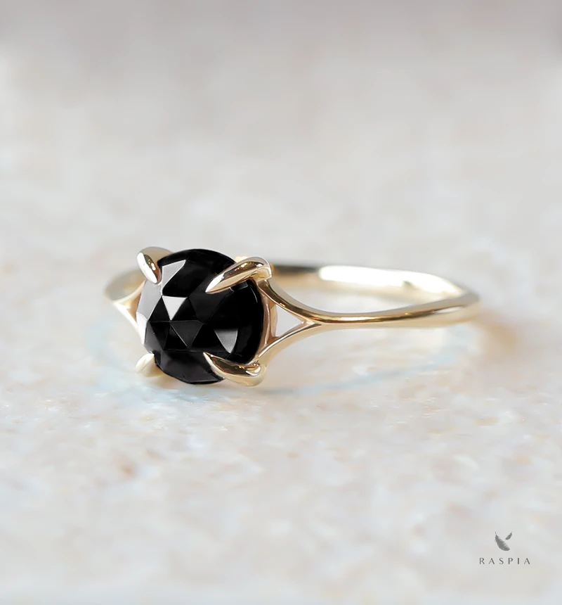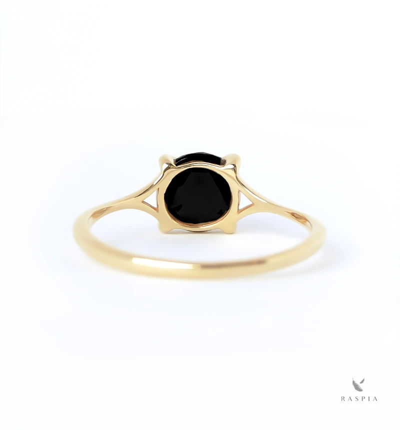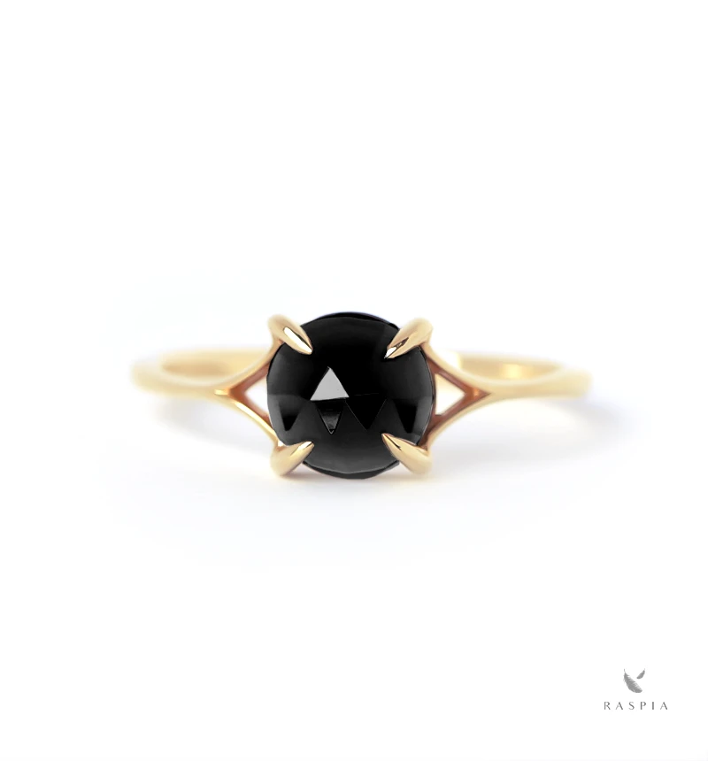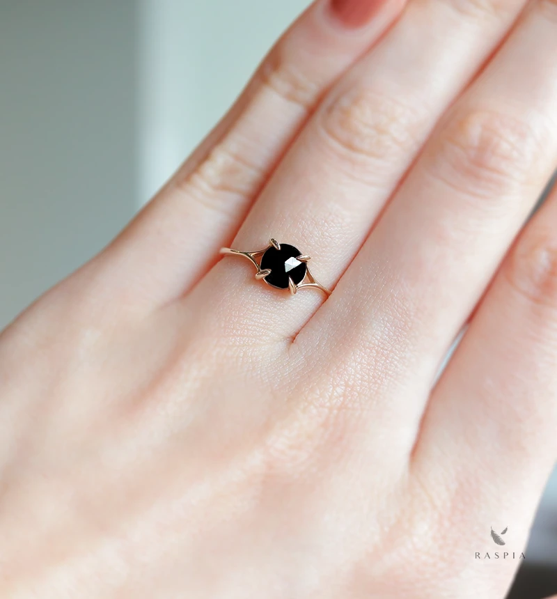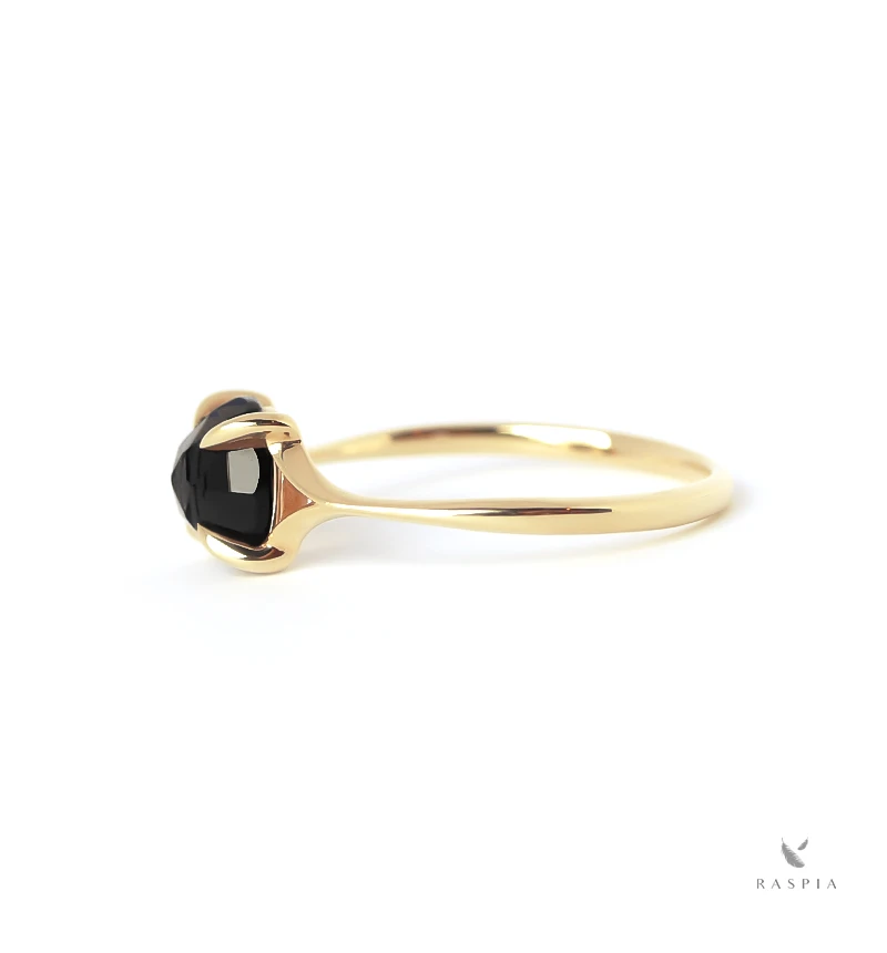 大人な印象のブラックスピネルを使用したK10リングです。ローズカットの表面に施された24面のカット面が光を反射し、キラキラと美しく輝きます。スピネルは8月の誕生石です。