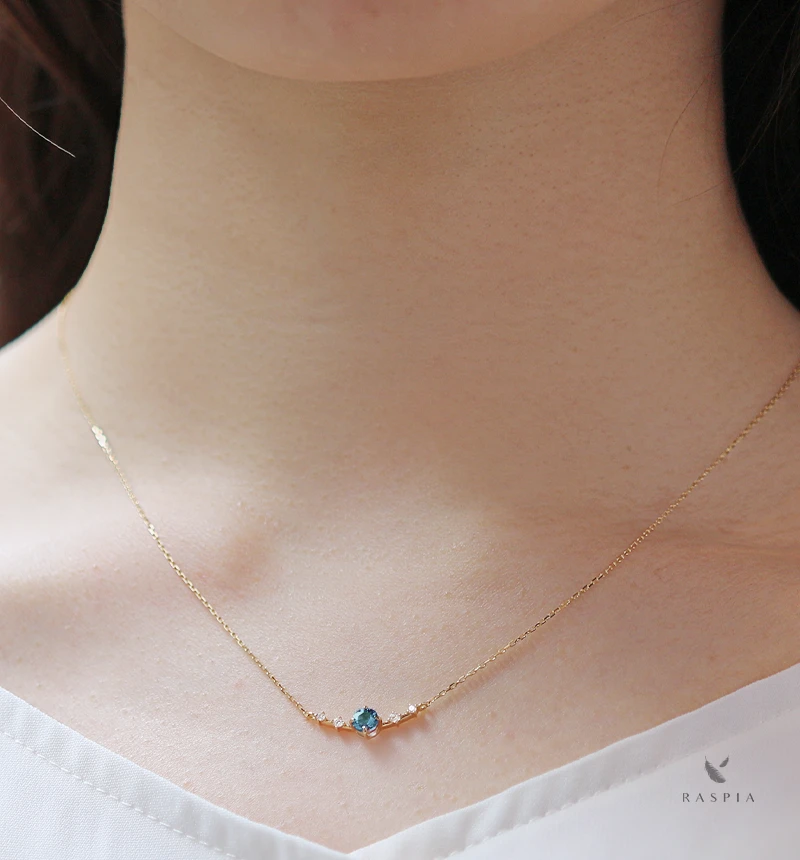 ロンドンブルートパーズのラウンドカットをメインに、4つのメレダイヤを配したK18ネックレスです。 トパーズは11月の誕生石です。