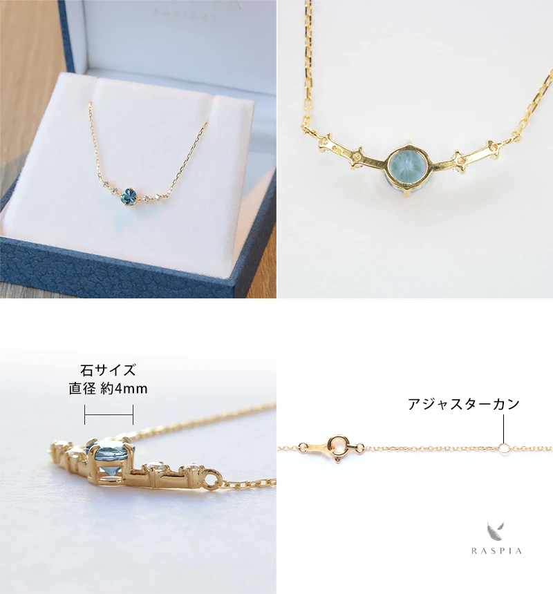 RASPIA(ラスピア)は、シンプルで大人可愛いデザインをイメージし、カラーストーン/天然石とK10(10金)/K18(18金)の本物のゴールド素材を使って手作りしています。