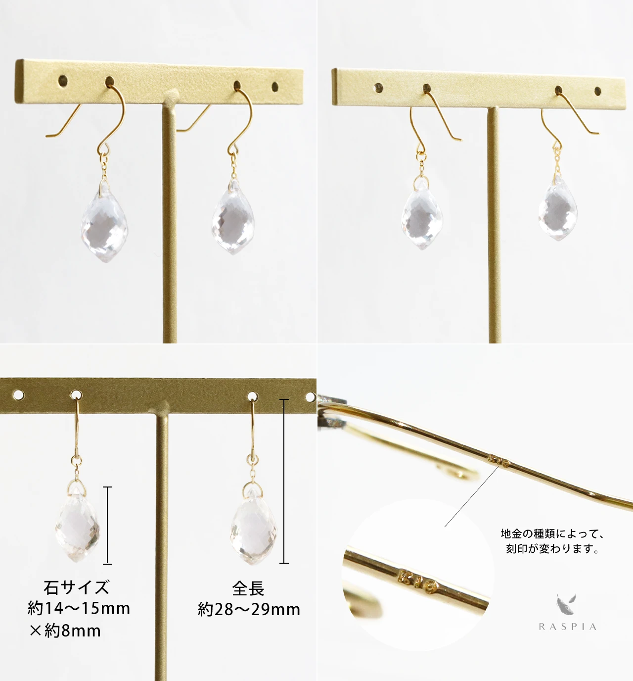| サイズ | 【ピアス】サイズ:縦 約14mm×横 約10mm フックの太さ 0.5mm 【石】ロッククリスタル:縦 約14〜15mm × 横 約8mm | ||