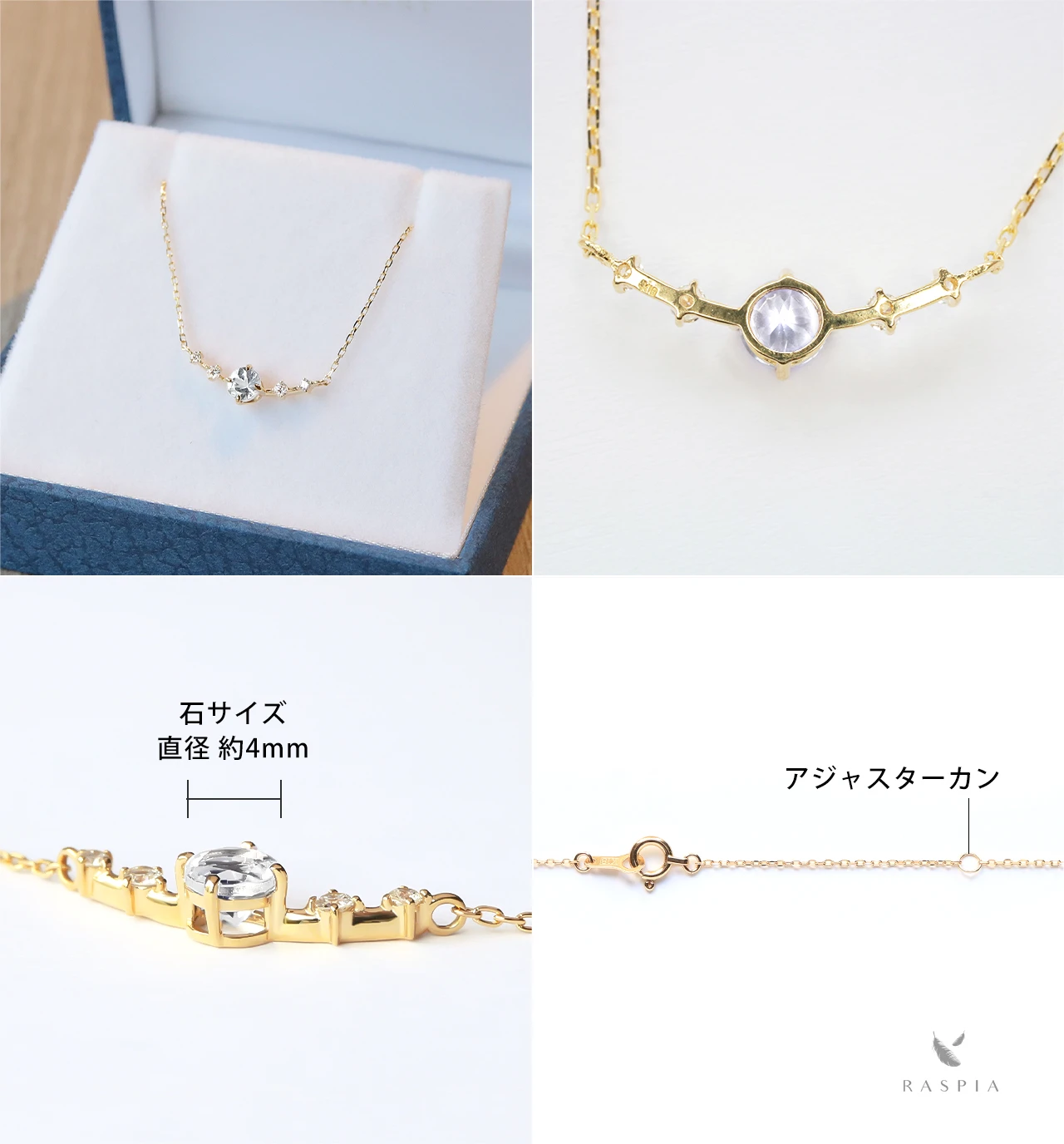 RASPIA(ラスピア)は、シンプルで大人可愛いデザインをイメージし、カラーストーン/天然石とK10(10金)/K18(18金)の本物のゴールド素材を使って手作りしています。