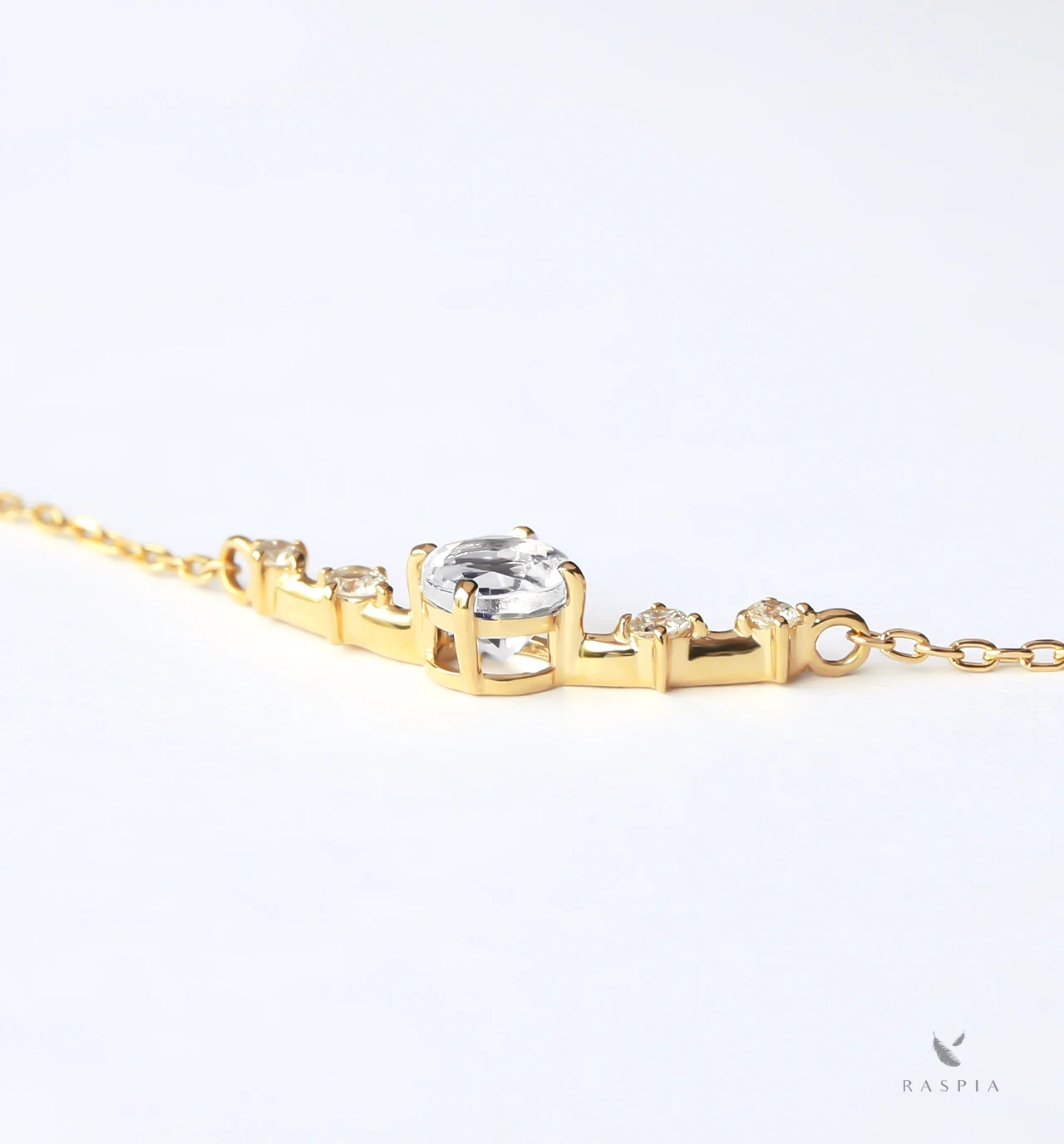 ピュアなきらめきが美しいホワイトサファイアのラウンドカットをメインに、4つのメレダイヤを配したK18ネックレスです。カラーバリエーションが豊富なサファイアの中でも、無色透明でピュアな印象のホワイトサファイアを上品なネックレスに仕立てました。