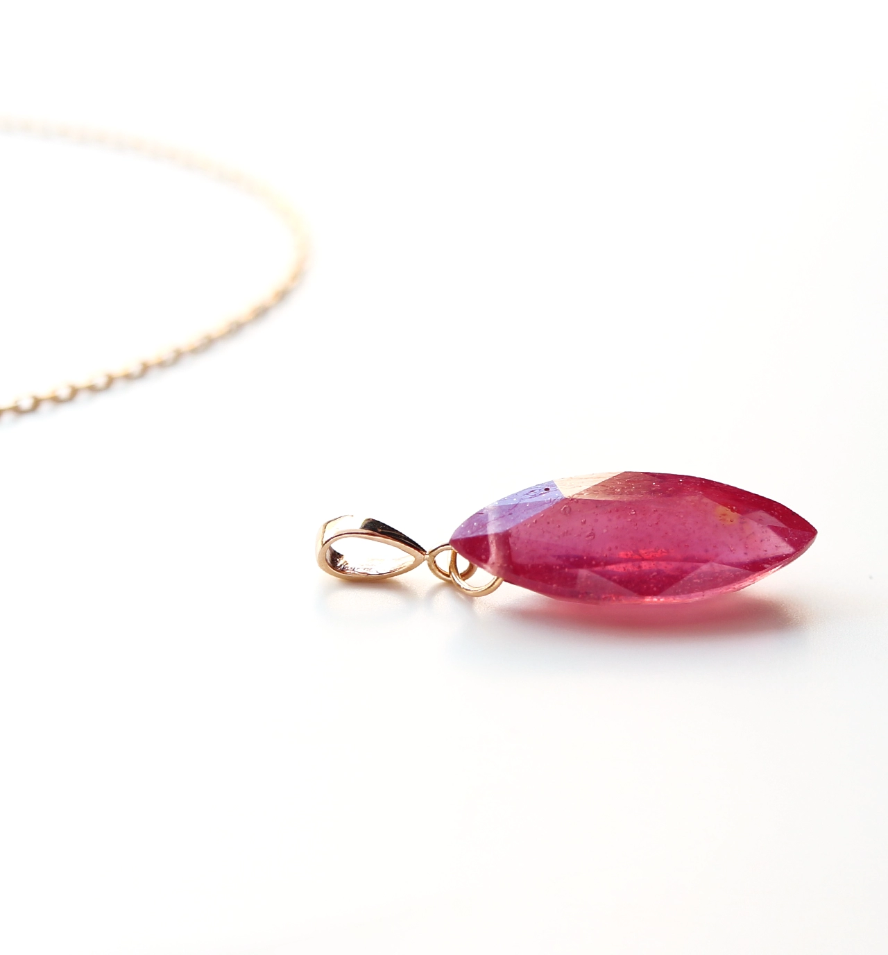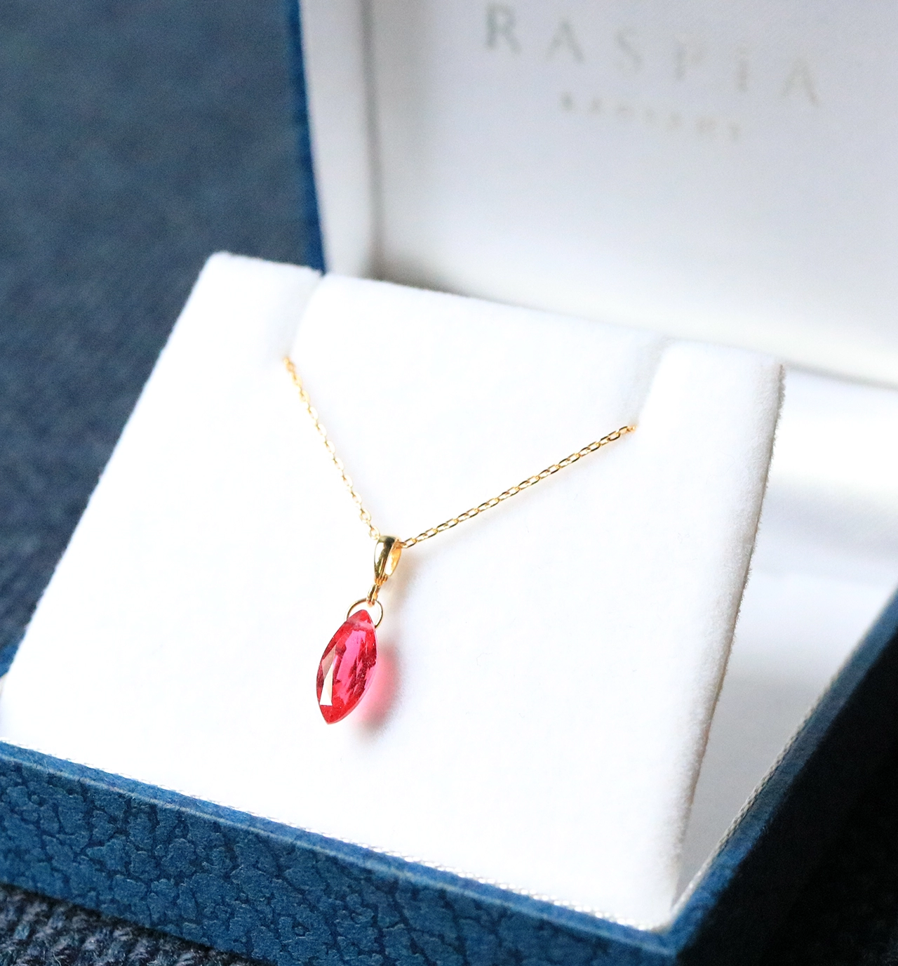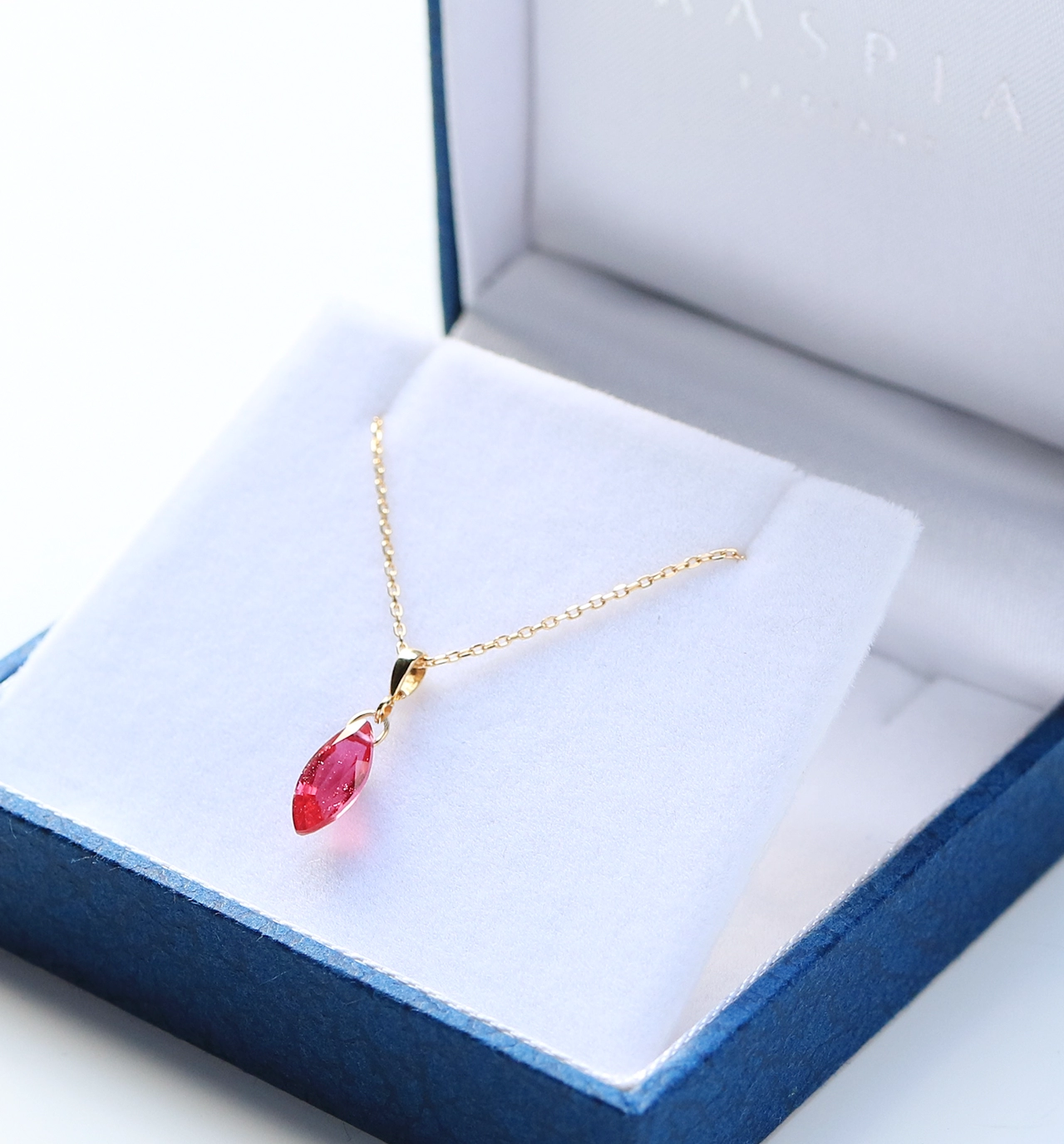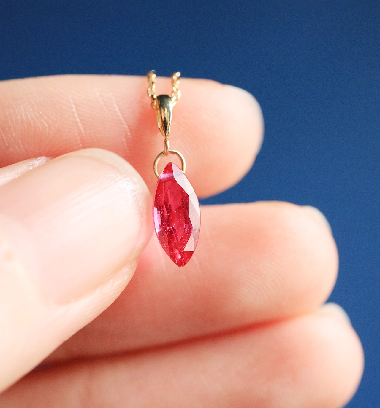 マーキスシェイプのルビーが胸元で確かな存在感を放ちます。金具は石の存在を引き立てるサイズ感にこだわりました。また、身体の動きに合わせ石が揺れてきらめき、それでいて石がいつも正面を向くように絶妙なバランス調整を施しています。