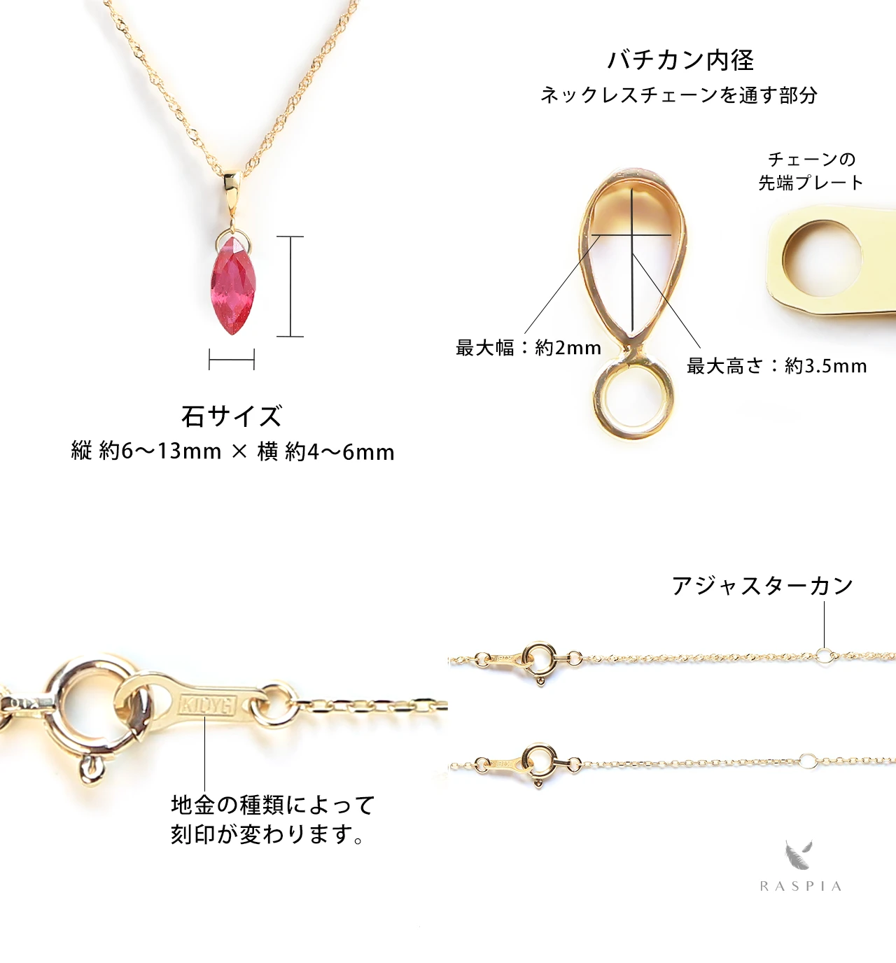| サイズ | ルビー:縦 約6〜13mm × 横 約4〜6mm バチカン内径:高さ 最大(約)3.5mm/幅 最大(約)2mm チェーン全長は40cm・45cm・50cmよりお選びいただけます。 | ||