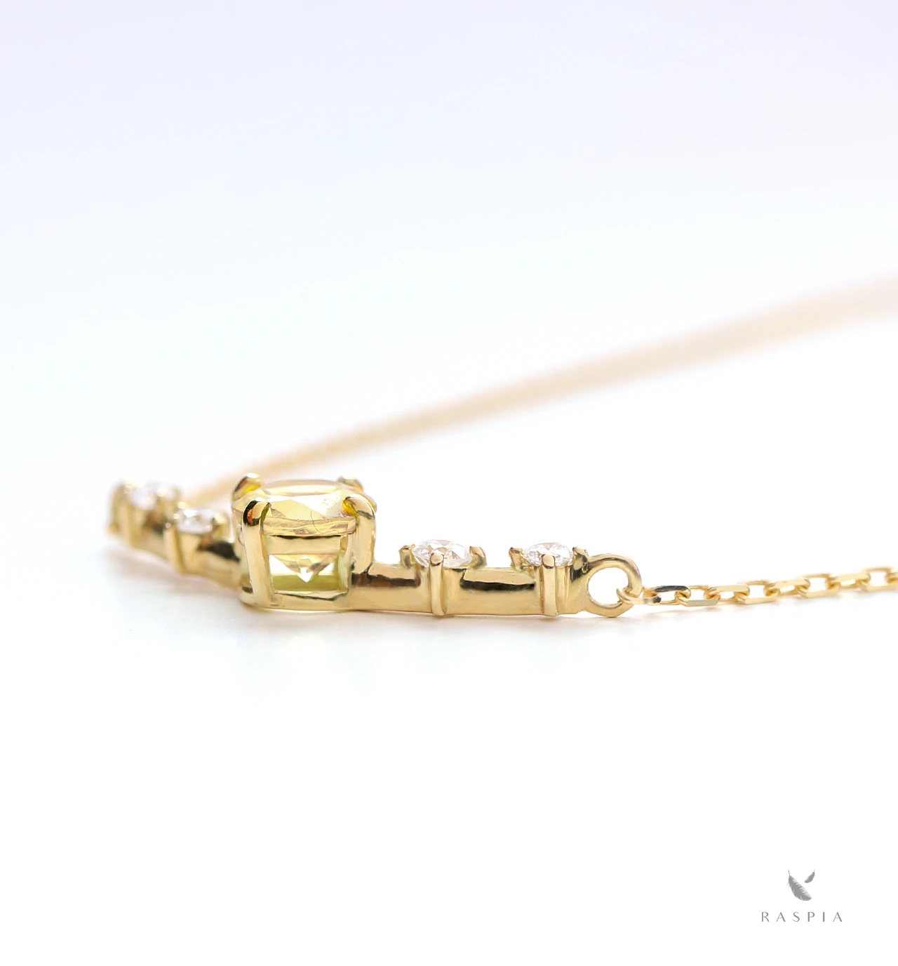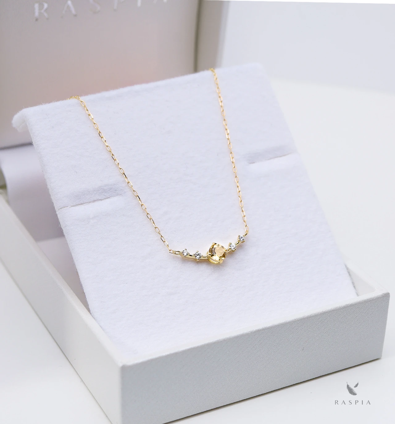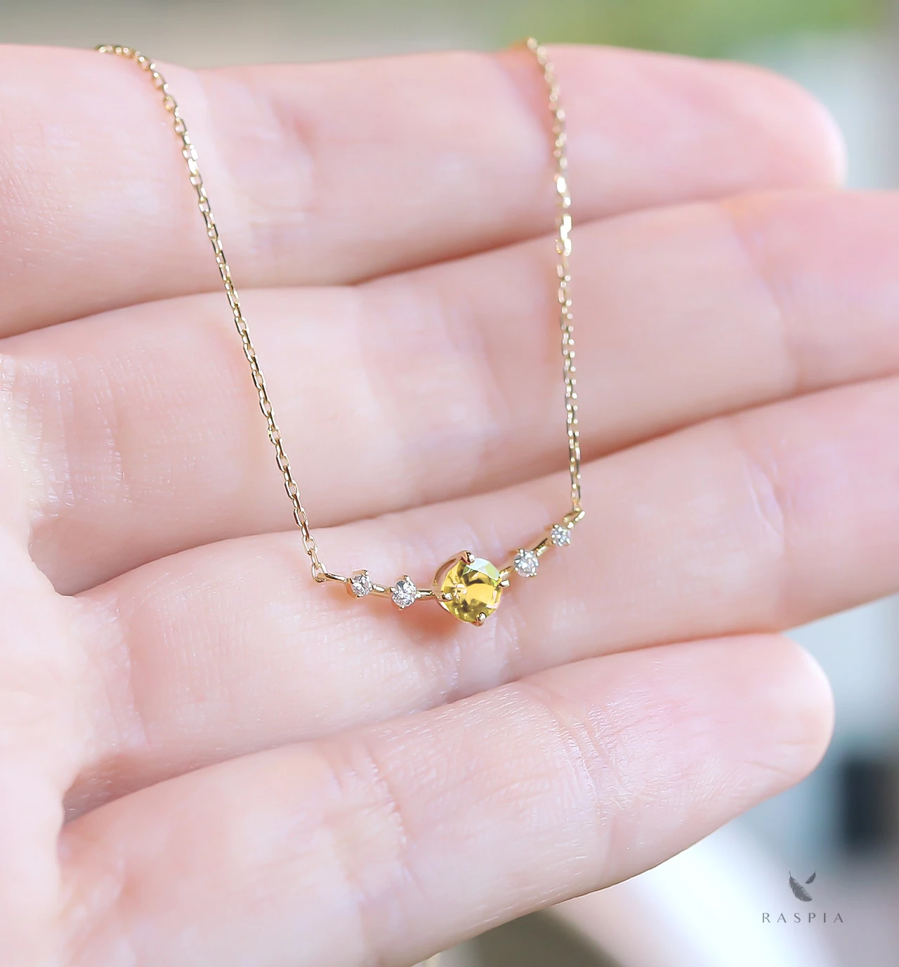 シトリンのラウンドカットをメインに、4つのメレダイヤを配したK18ネックレスです。 黄金の光をまとったような美しいイエローカラーのシトリン。ダイヤモンドとゴールドの調和が上品で美しいアイテムです。