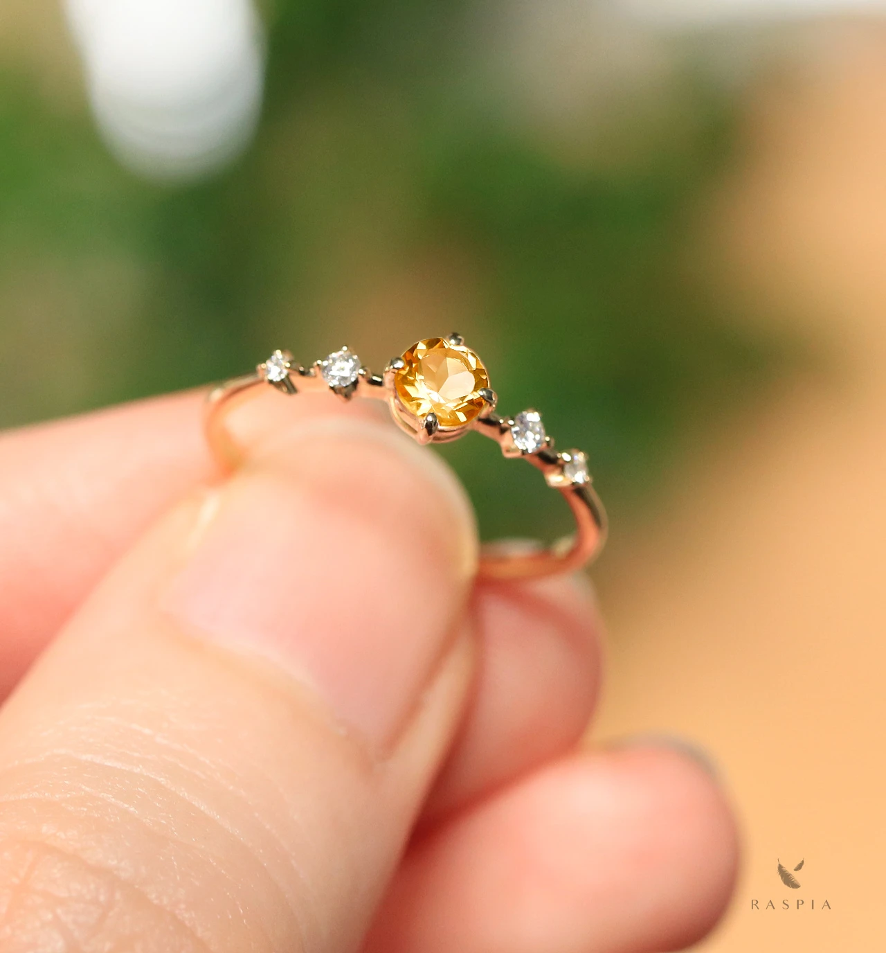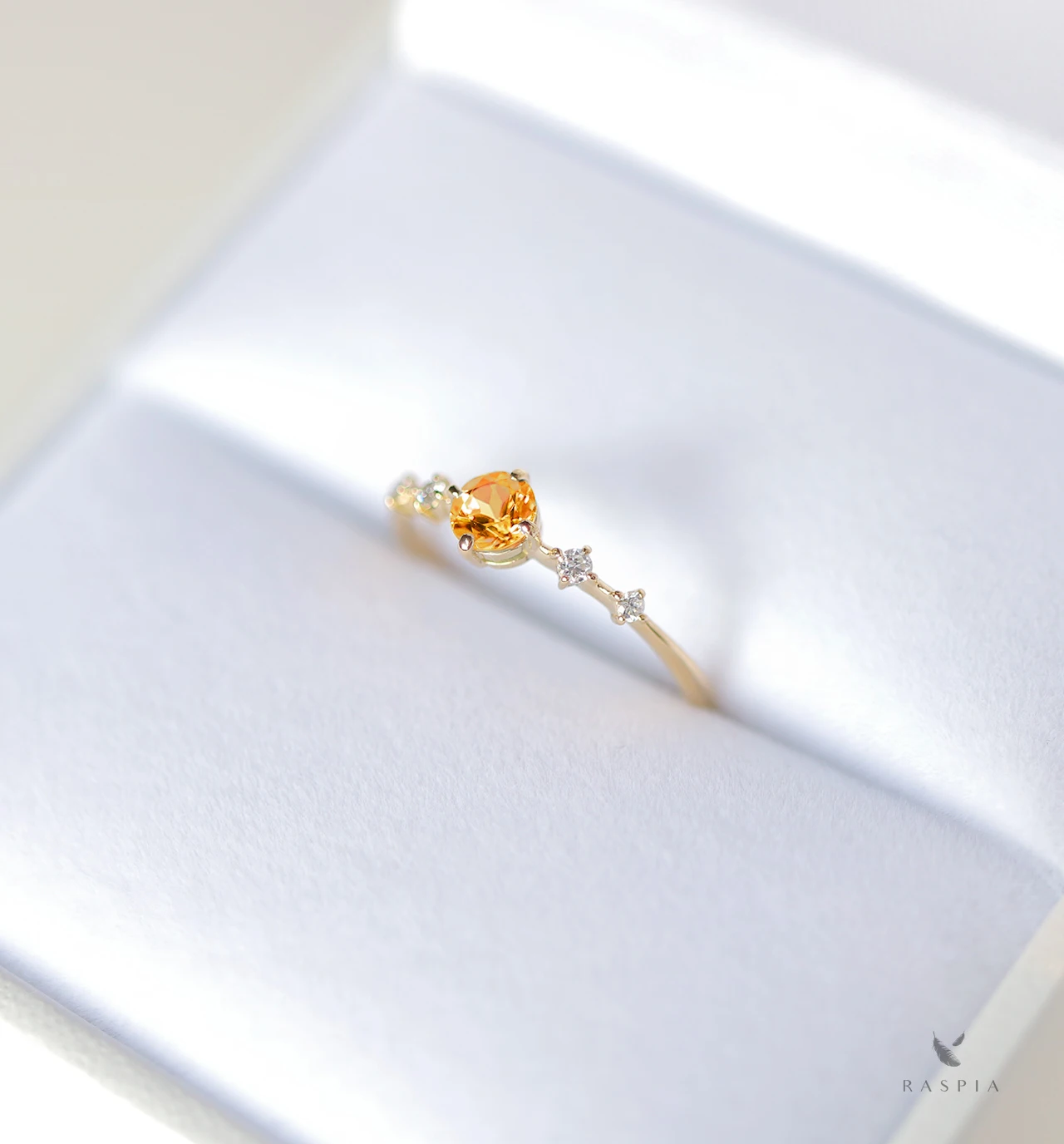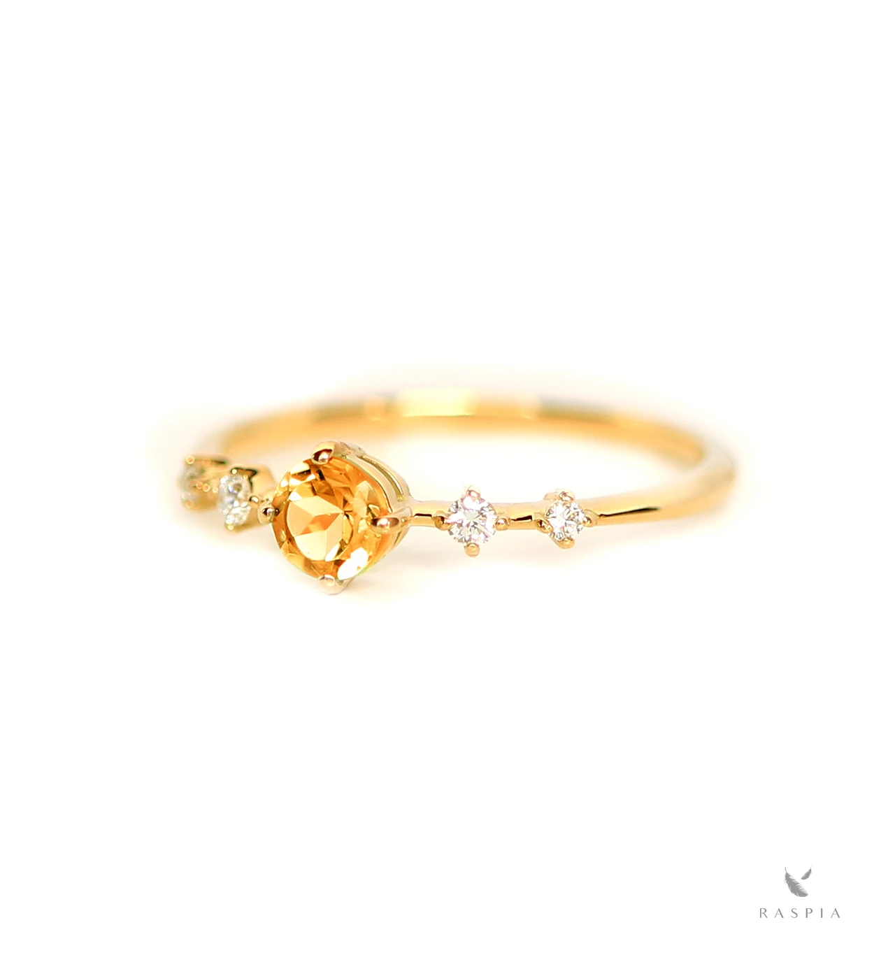 スペサルティンガーネットのラウンドカットをメインに、4つのメレダイヤを配したK18リングです。瑞々しい鮮やかなオレンジとダイヤモンドの輝きが美しく調和するアイテム。
