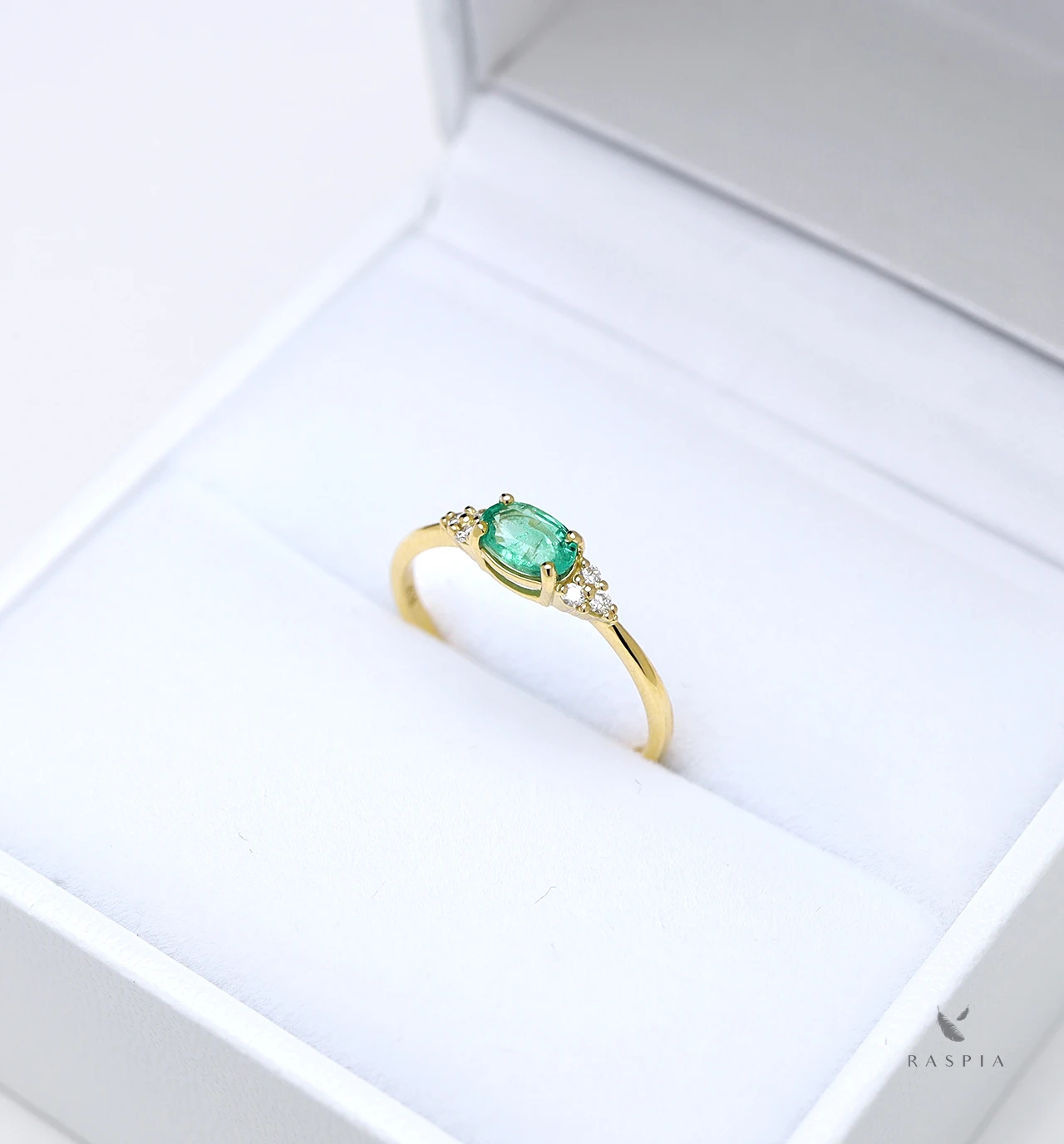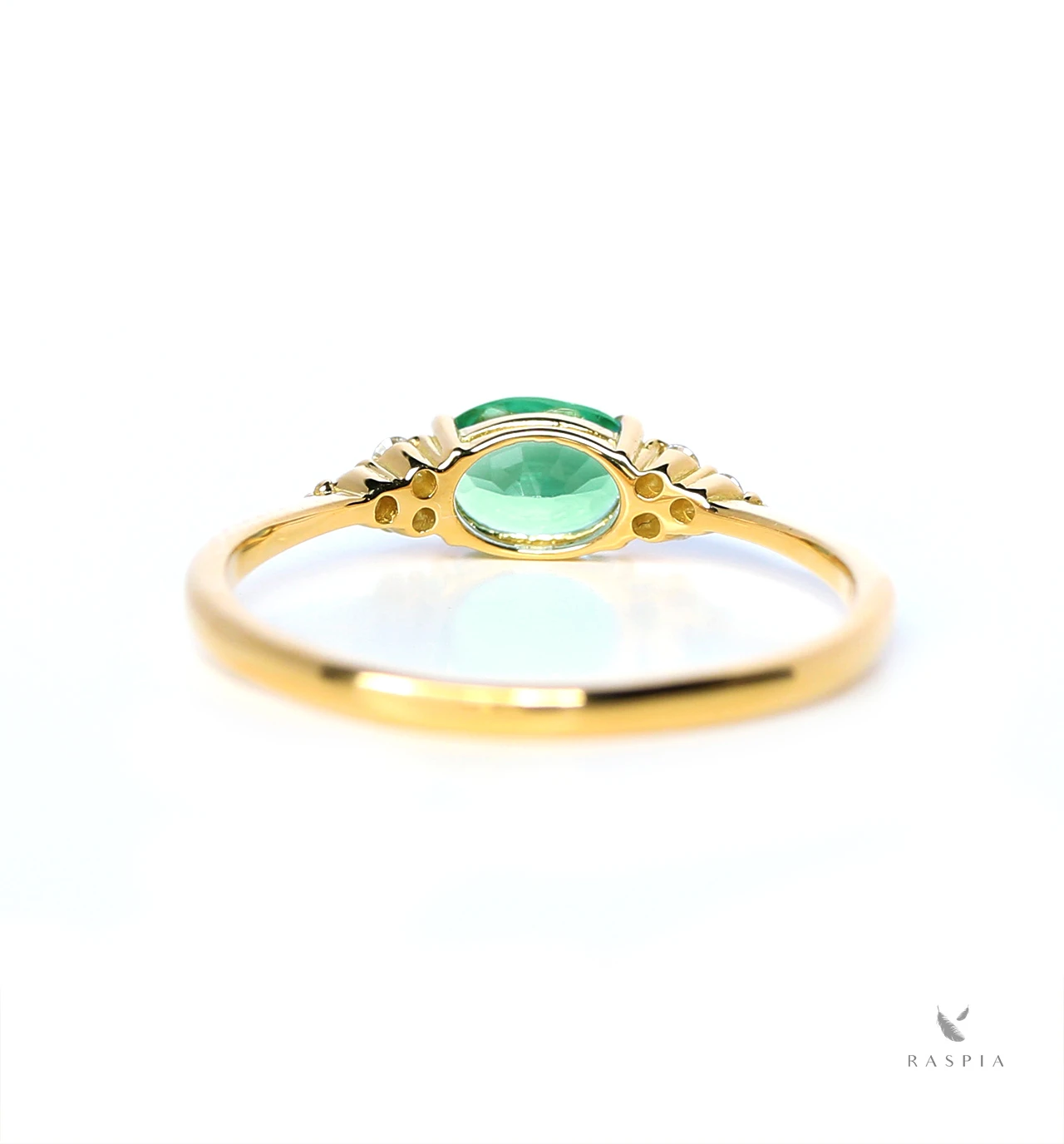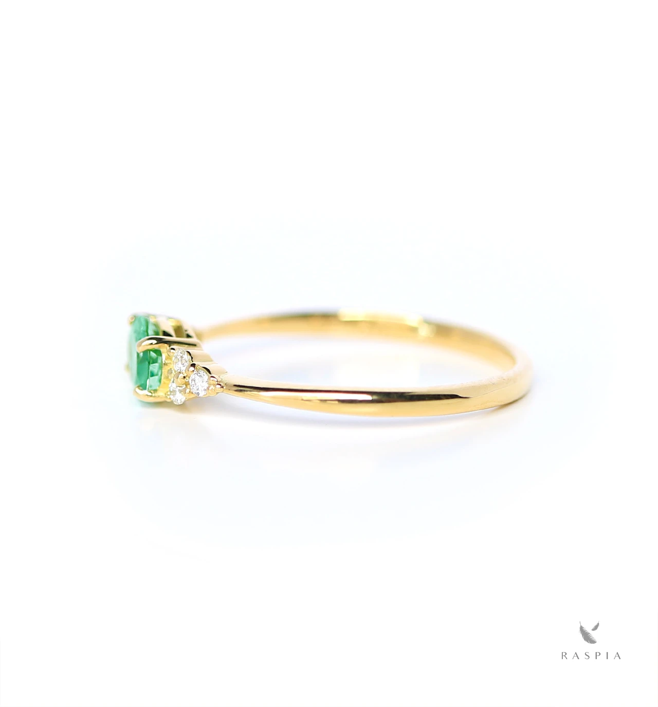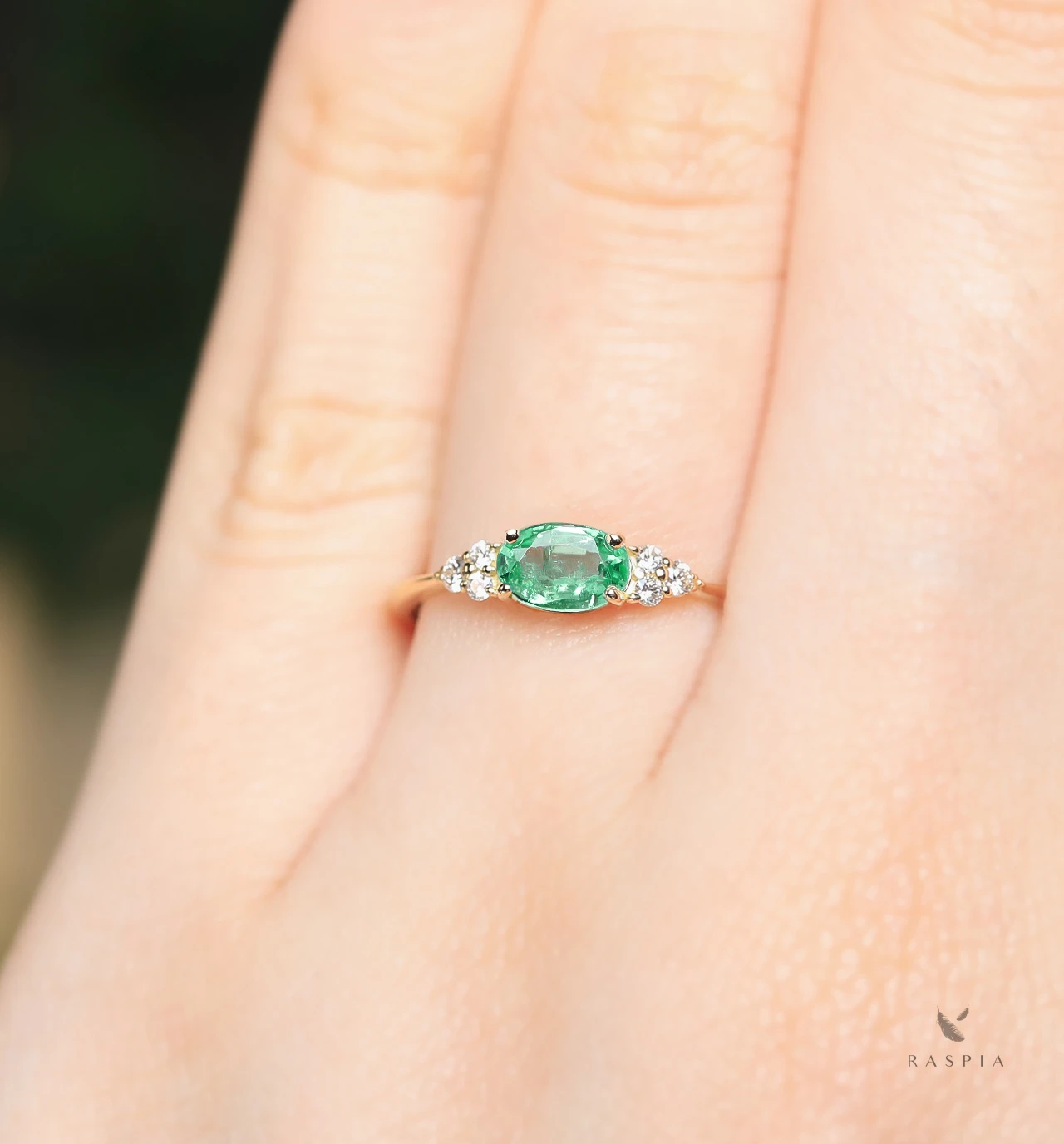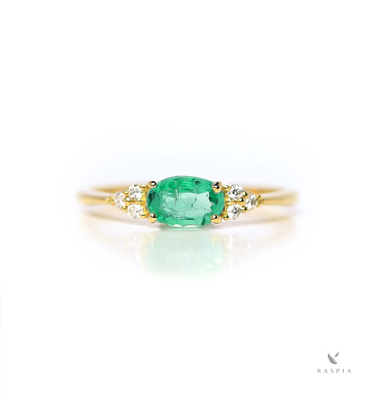 エメラルドのオーバルカットをメインに、6つのメレダイヤを左右にセットしたK18リングです。ずっと見続けていても飽きることがない、深く豊かなグリーンカラーが美しい宝石。エメラルドは5月の誕生石です。