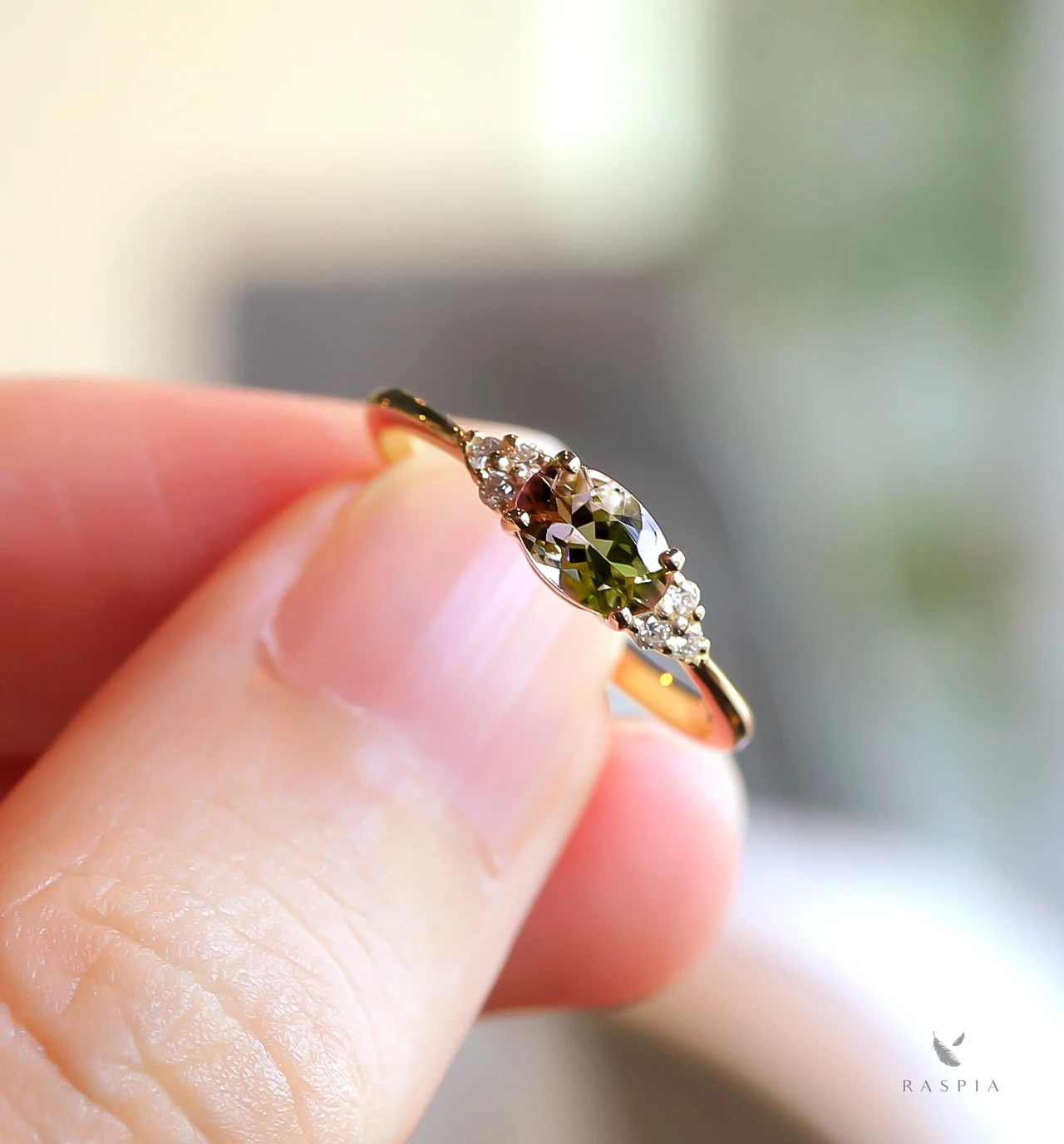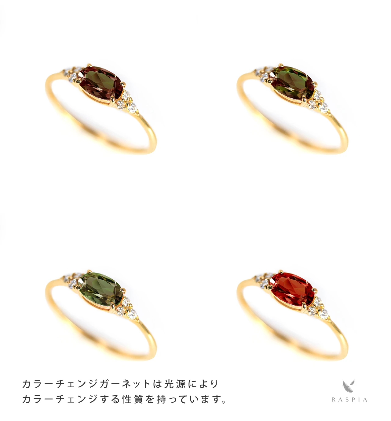カラーチェンジガーネットのオーバルカットをメインに、6つのメレダイヤを左右にセットしたK18リングです。 カラーチェンジガーネットは、白熱灯のもとでは深いブラウン、蛍光灯下では鮮やかなレッドカラーに色彩が変化する石です。