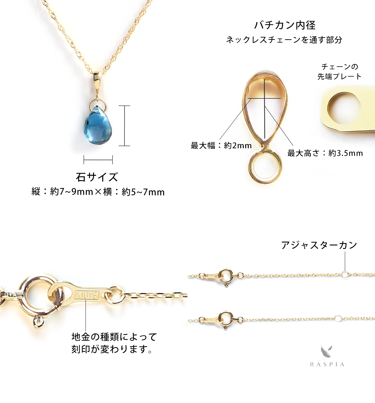 | サイズ | ロンドンブルートパーズ:約6mm×8mm バチカン内径:高さ 最大(約)3.5mm/幅 最大(約)2mm チェーン全長は40cm・45cm・50cmよりお選びいただけます。 | ||
