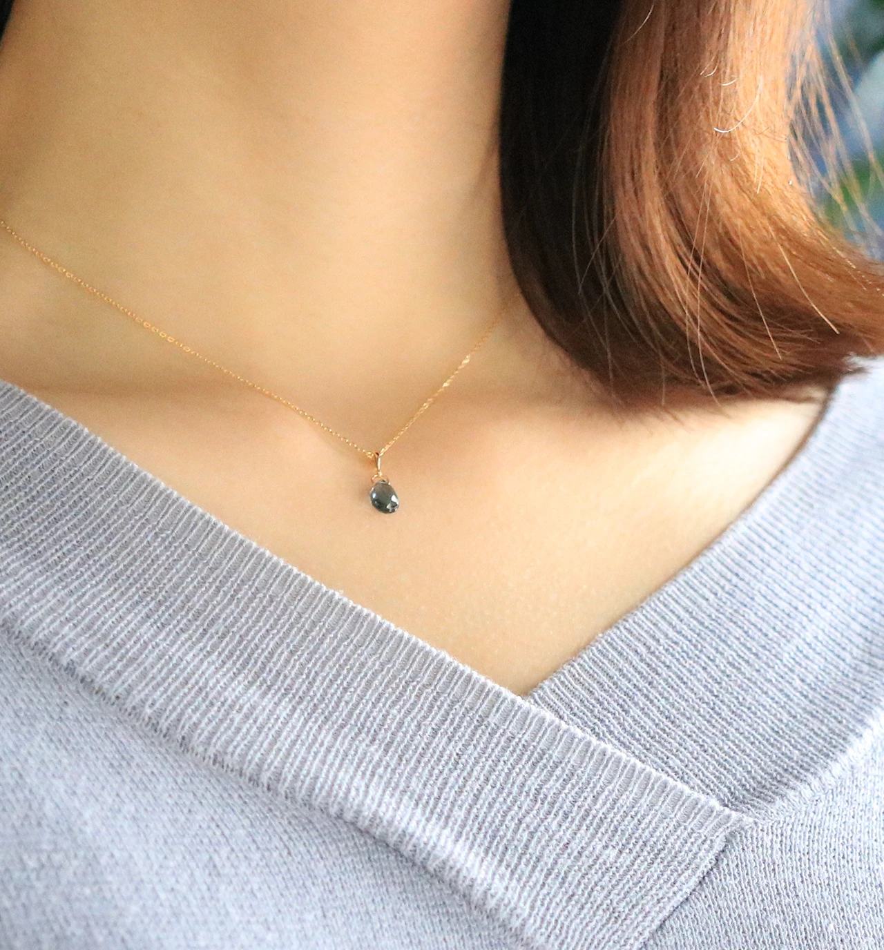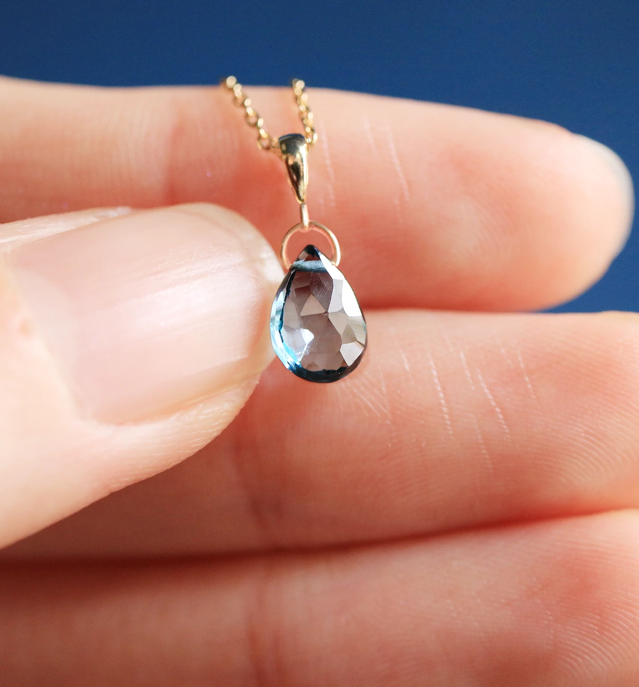 平ドロップのロンドンブルートパーズが胸元で確かな存在感を放ちます。金具は石の存在を引き立てるサイズ感にこだわりました。また、身体の動きに合わせ石が揺れてきらめき、それでいて石がいつも正面を向くように絶妙なバランス調整を施しています。
