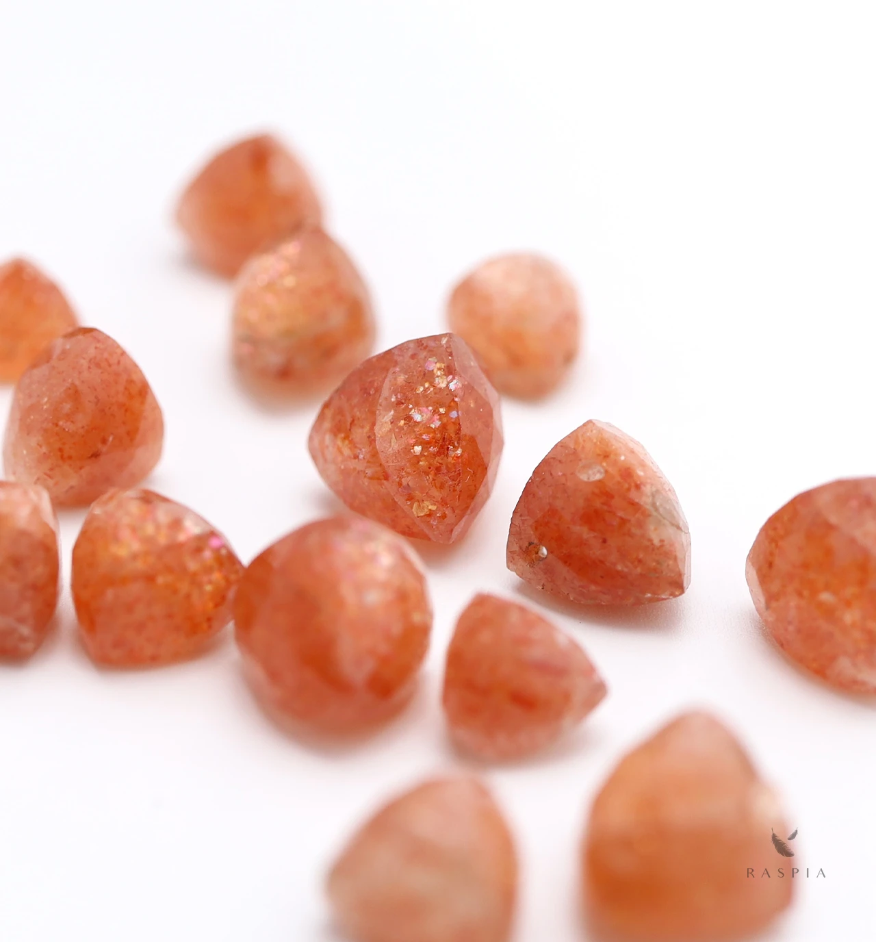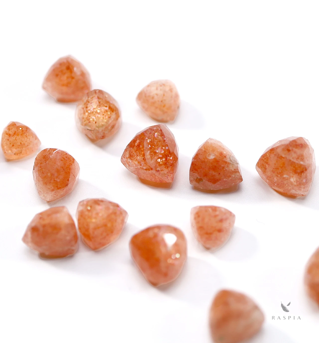 一般的なサンストーンの地色は透明無色から淡い黄色で、インクルージョン(内包物) により、赤色やオレンジ、茶系の色味を帯びた針のような光沢を出すものもあります。