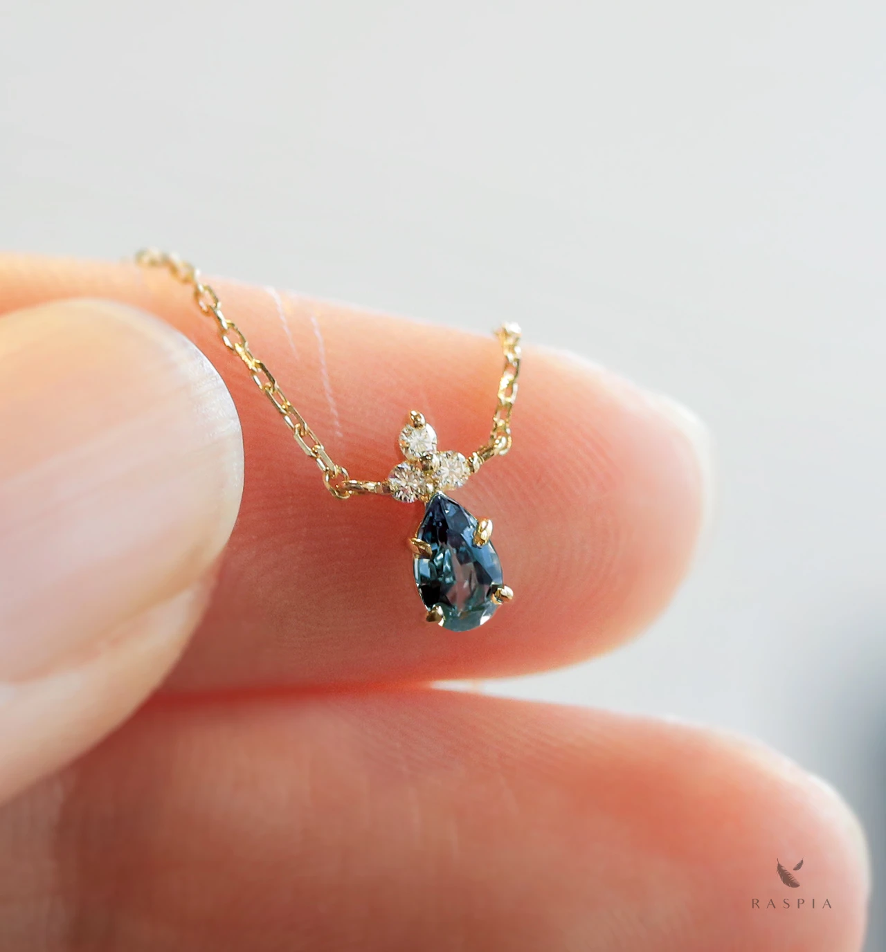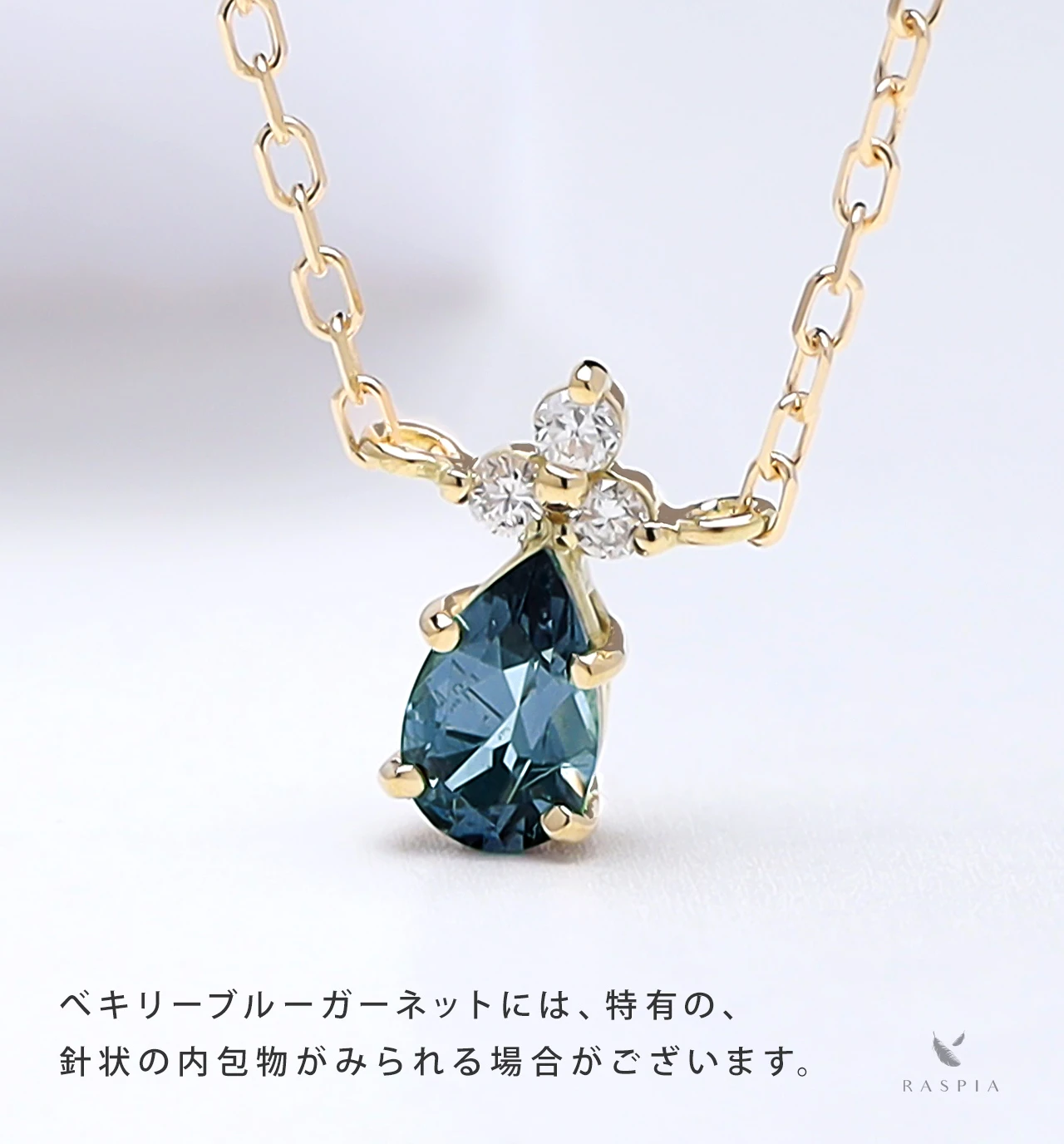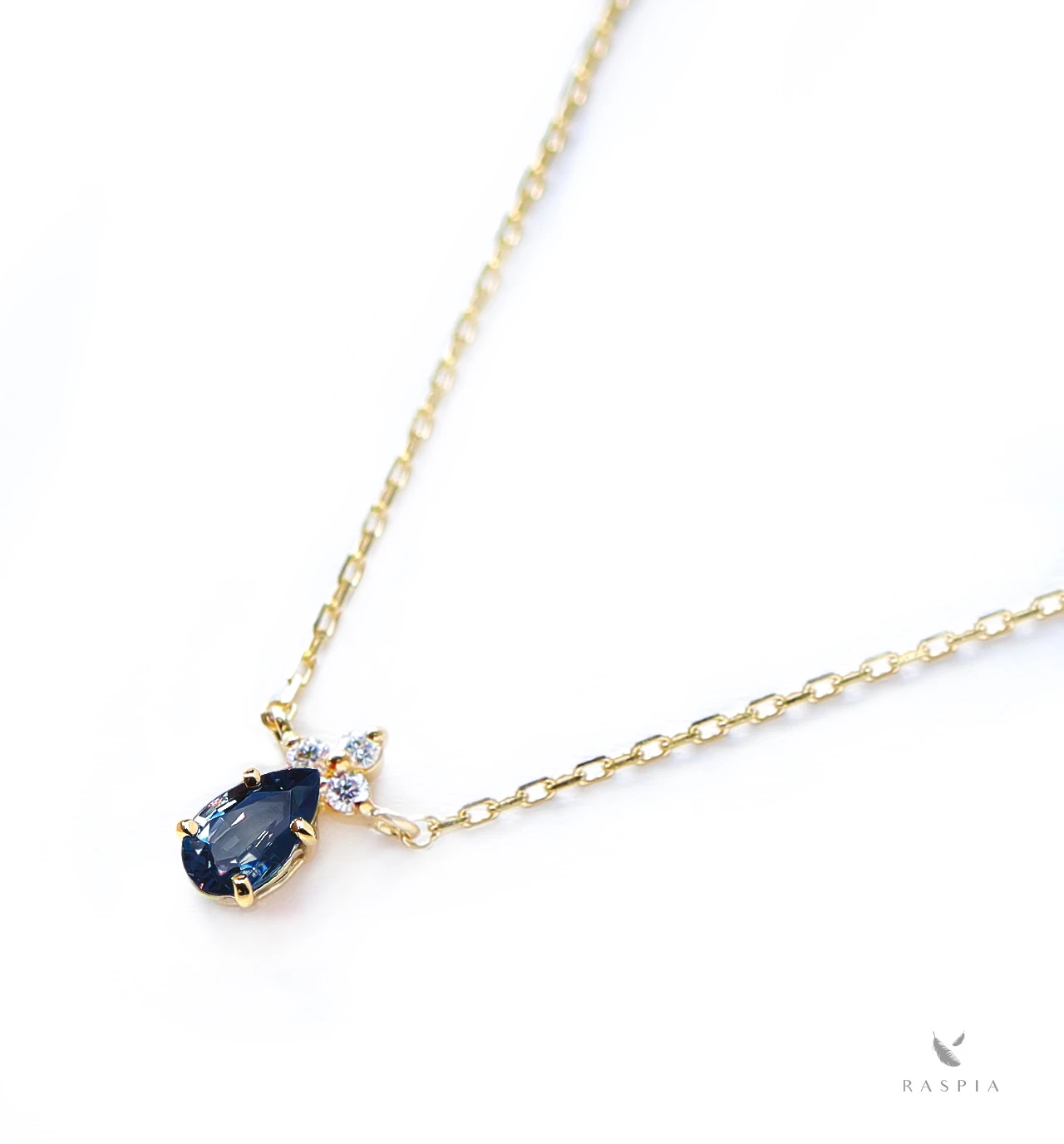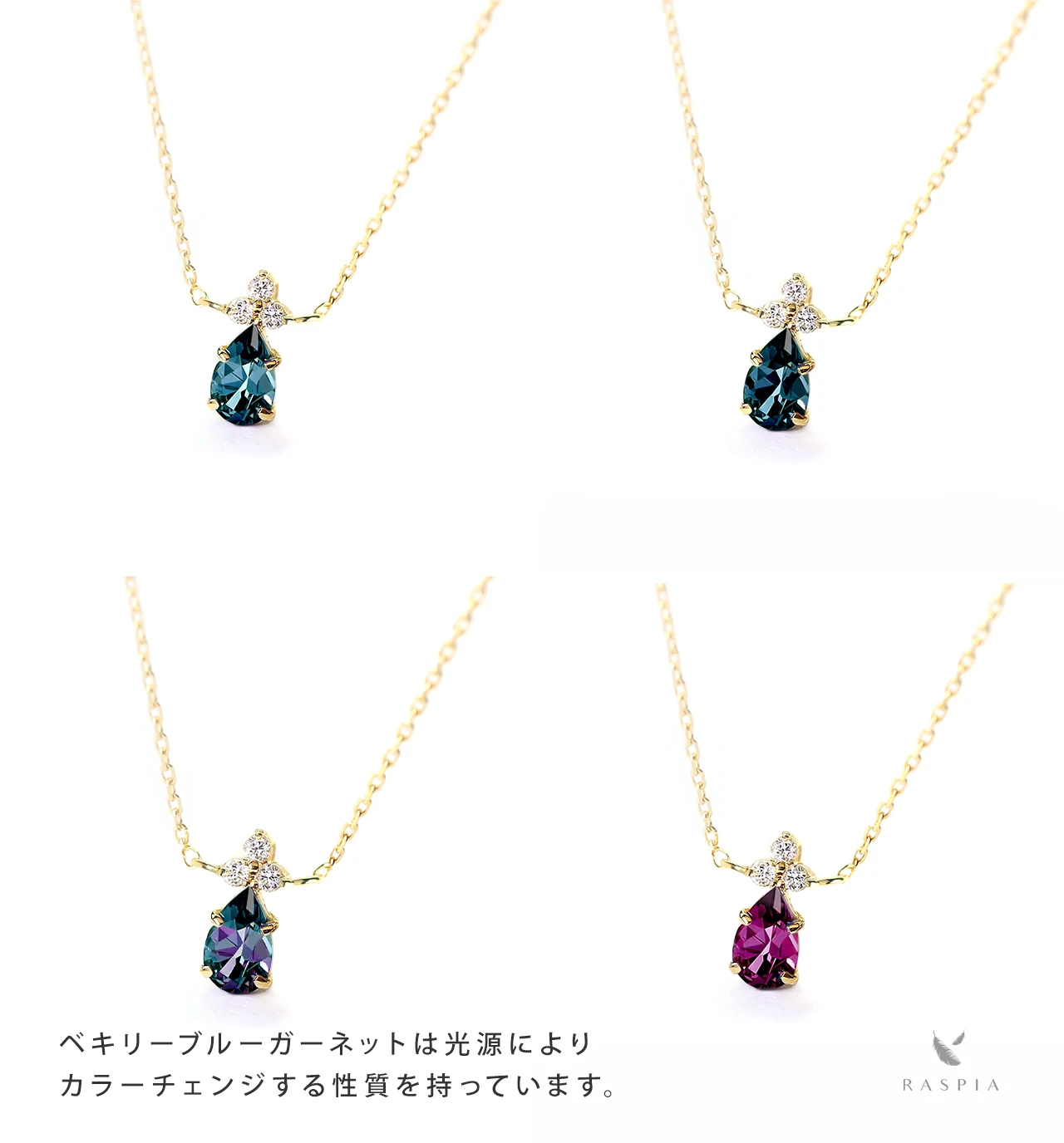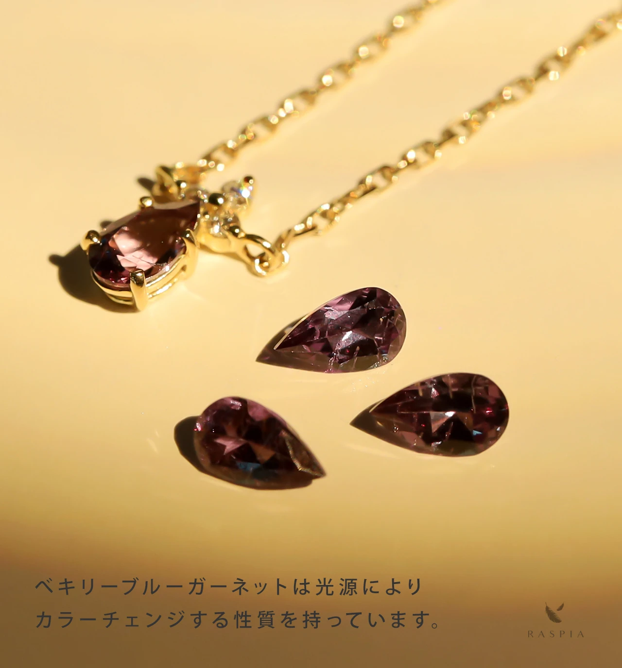 カラーチェンジ効果を持つブルーカラーのガーネットとダイヤモンドを使用したネックレス。太陽の光の下では深いブルー、ろうそくのような白熱灯などの元では赤い色合いへと表情を変えます。その美しい輝きは大人の女性の魅力をより引き立たせます。その魅力を楽しめるよう、カラー、カット・研磨の質、透明度など、美しいルースを1粒ずつ厳選して買付しております。