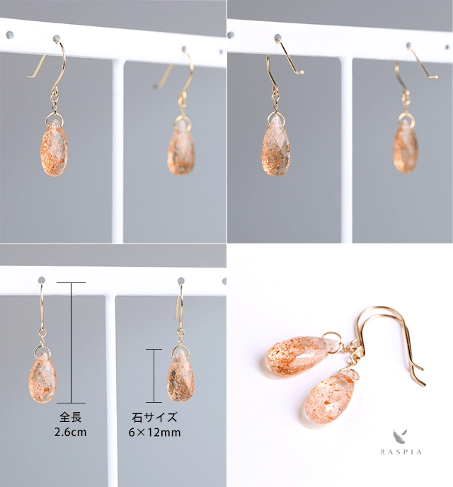| サイズ | 【ピアス】サイズ:縦 約14mm×横 約10mm フックの太さ 0.5mm【石】サンストーン:約5〜6mm×10〜12mm | ||
