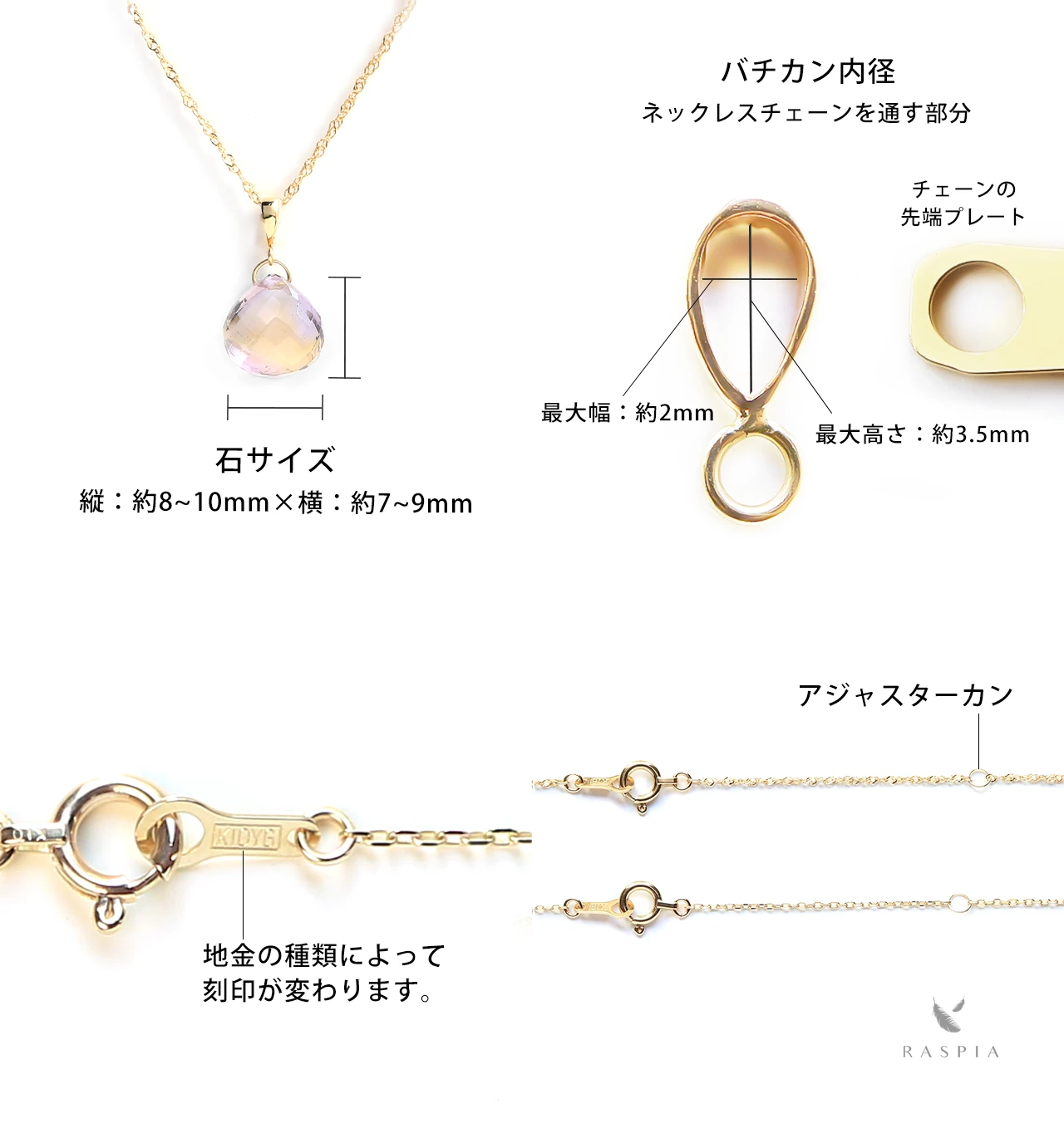 | サイズ | アメトリン:縦 約8~10mm × 横 約7~9mm バチカン内径:高さ 最大(約)3.5mm/幅 最大(約)2mm チェーン全長は40cm・45cm・50cmよりお選びいただけます。 | ||