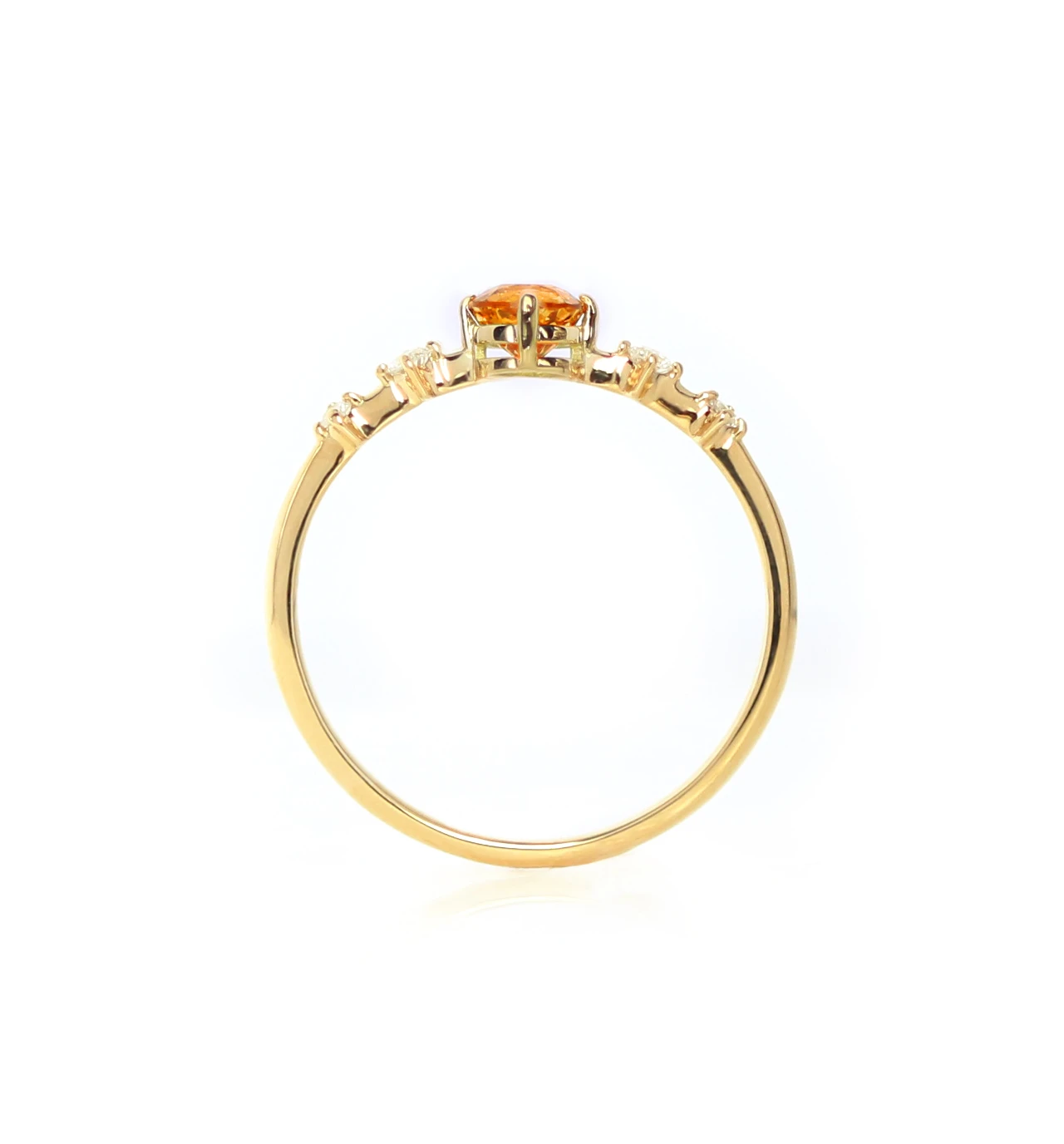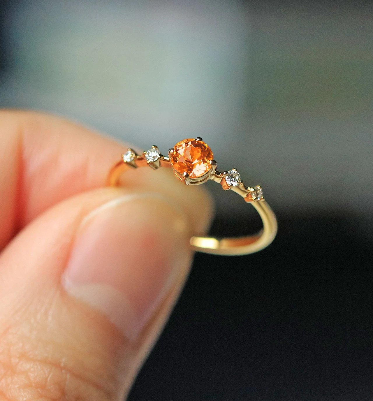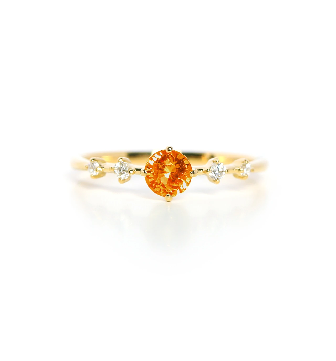 オレンジサファイアのラウンドカットをメインに、4つのメレダイヤを配したK18リングです。鮮やかなオレンジカラーとダイヤモンドの繊細な輝きが、上品に調和したデザインです。