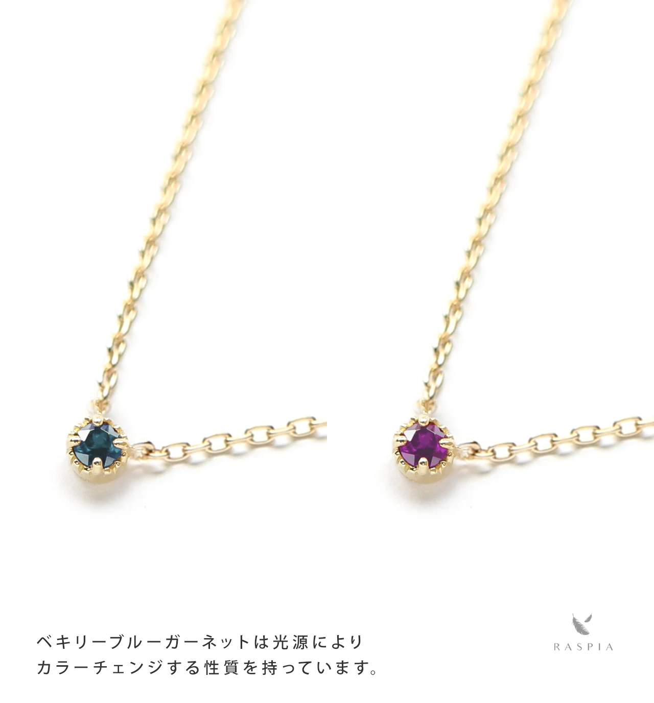神秘的なブルーカラーの輝きが魅力的な、ベキリーブルーガーネットを使用したシンプルな一粒ネックレスです。これまで存在しないと言われていた「青色」のガーネット。1990年後半に発見され、さらにはカラーチェンジの特性を持つ宝石です。魅惑的なブルーカラーは、ろうそくや白熱灯の下では上品なレッドカラーに変化します。ベキリーブルーガーネットは1月の誕生石です。