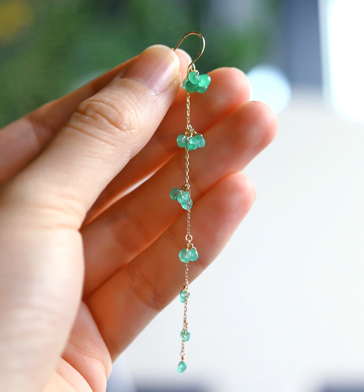 エメラルドを贅沢に使用した、ロングチェーンのK10フックピアスです。