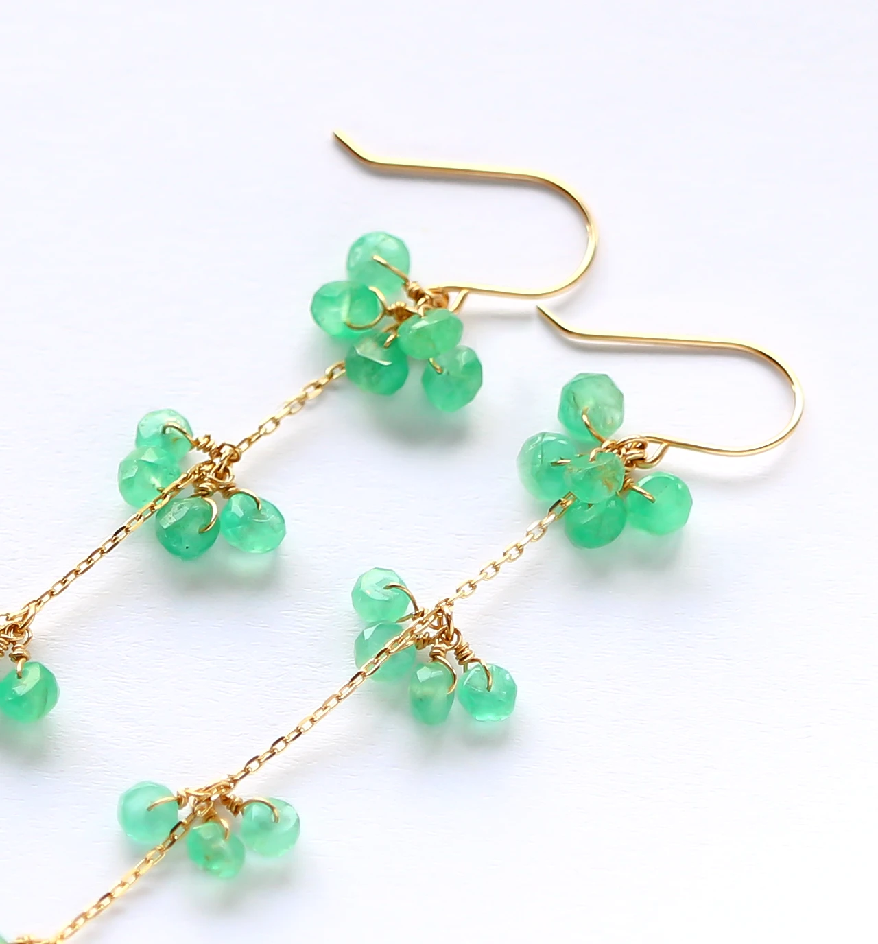 ロングチェーンに多くの美しいエメラルドがついたデザインは、顔まわりを華やかにしつつも、縦のラインが強調されフェイスラインをすっきりと見せてくれます。