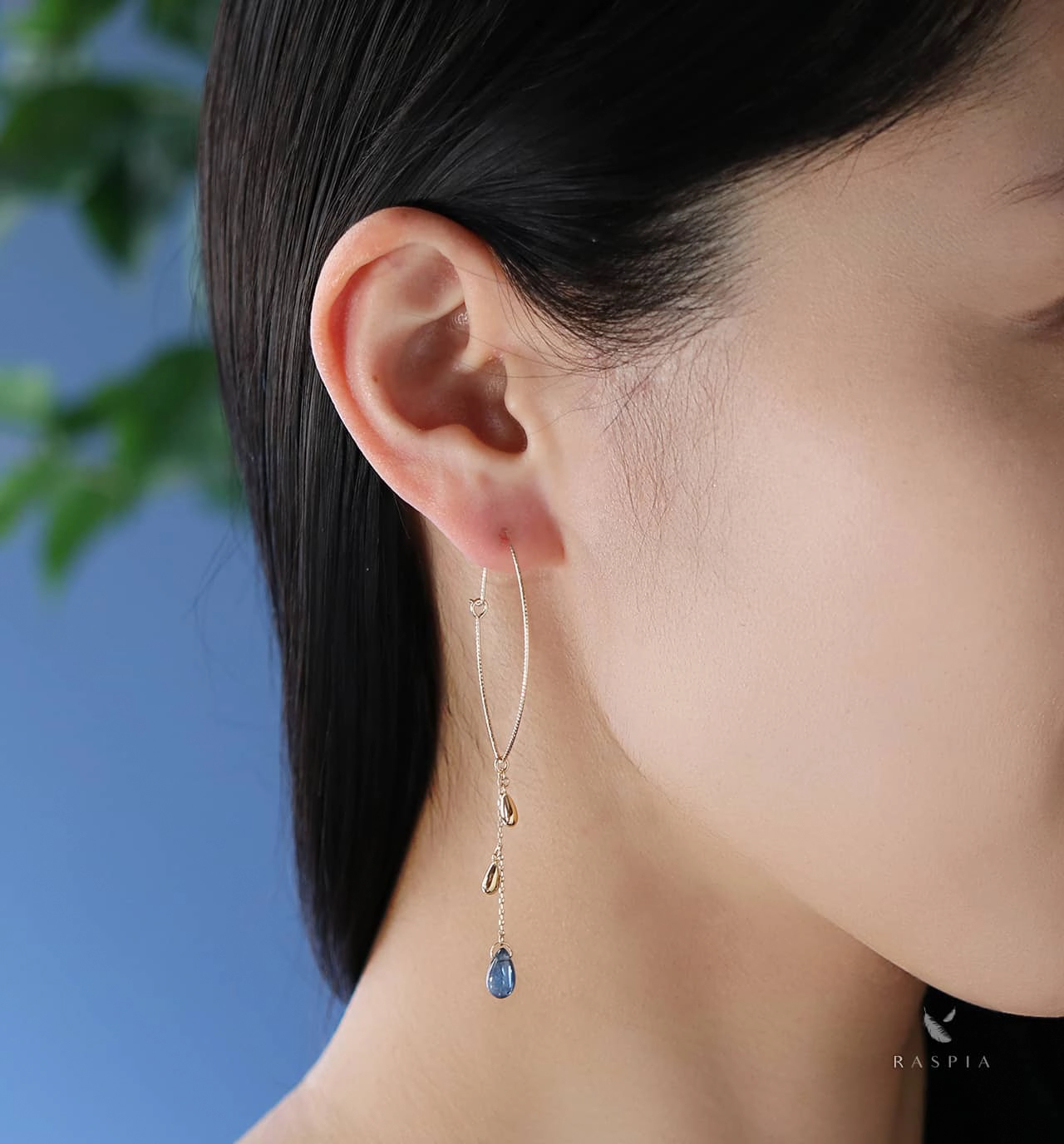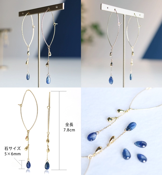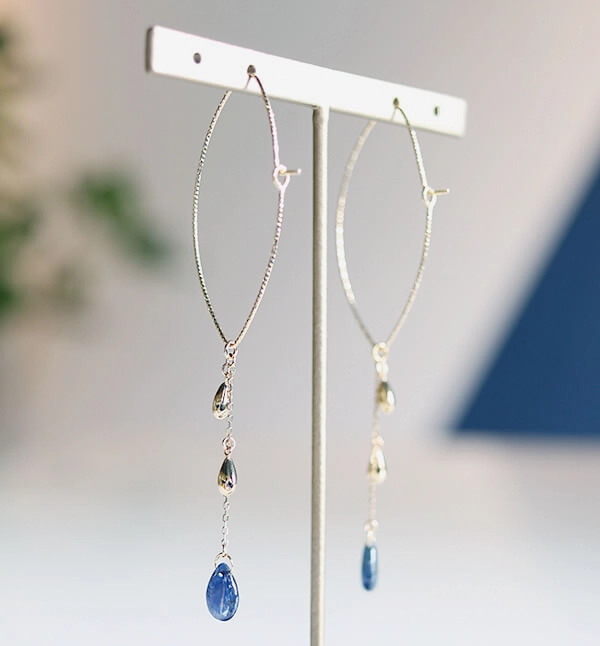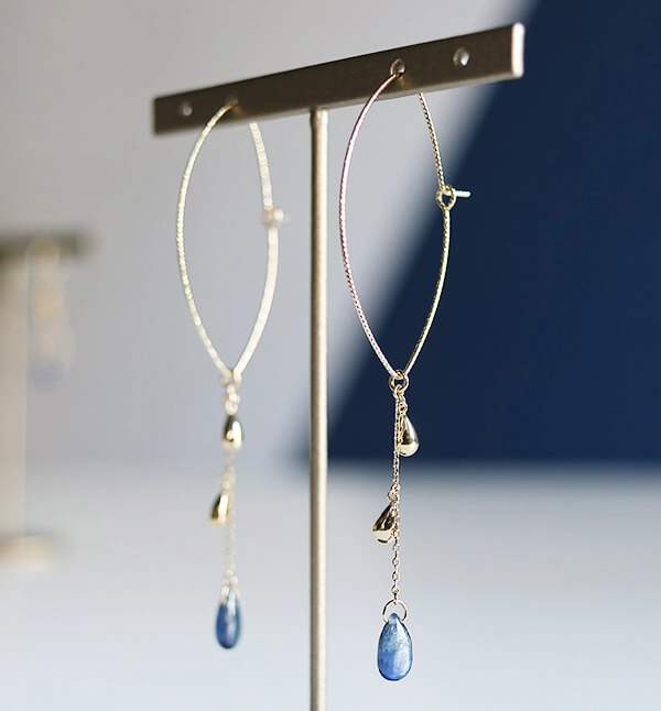イエローゴールドの雫が伝い落ちた先に揺れて光るサファイアの青をより際立たせてくれます。 キラキラのフープはマーキスシェイプに仕上げてあり、流れるような一体感と美しさを感じさせます。