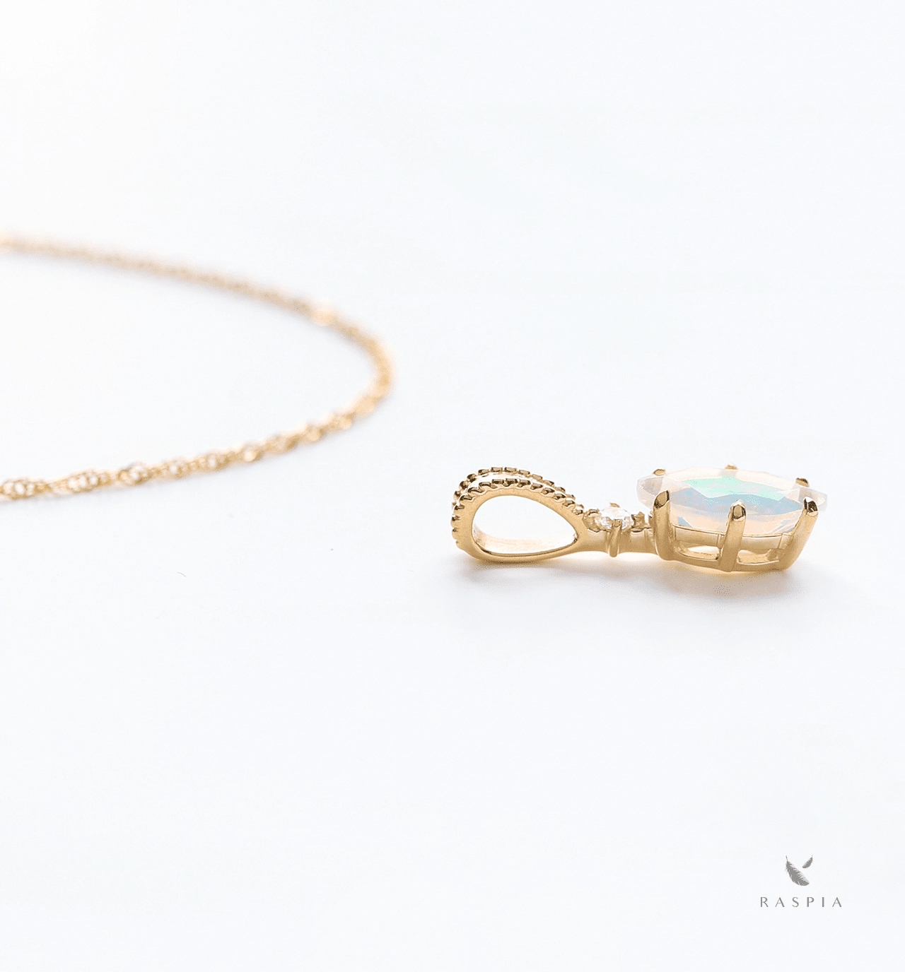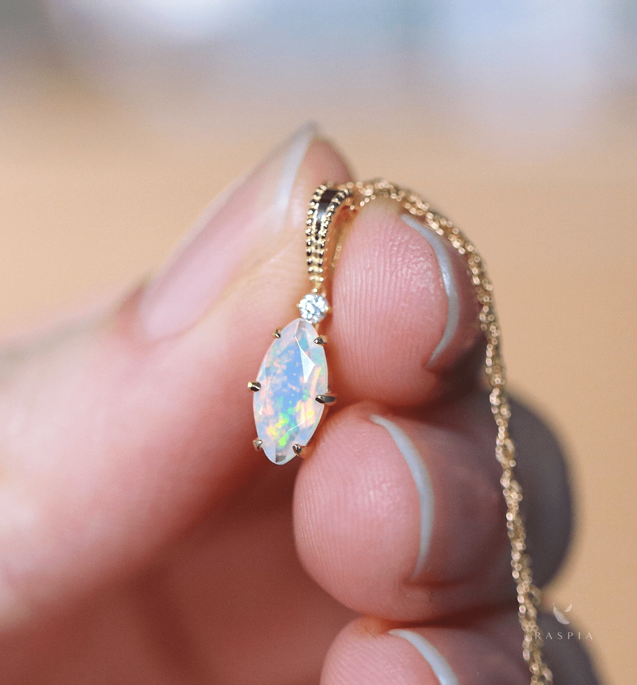 エチオピア産の高品質なオパールは、虹のような多色の色彩を示す現象「遊色効果」が高く魅力的です。使用しているオパールの表面はファセットカットを施し、熟練のカット職人による研磨が更に独特の美しさを演出してくれます。