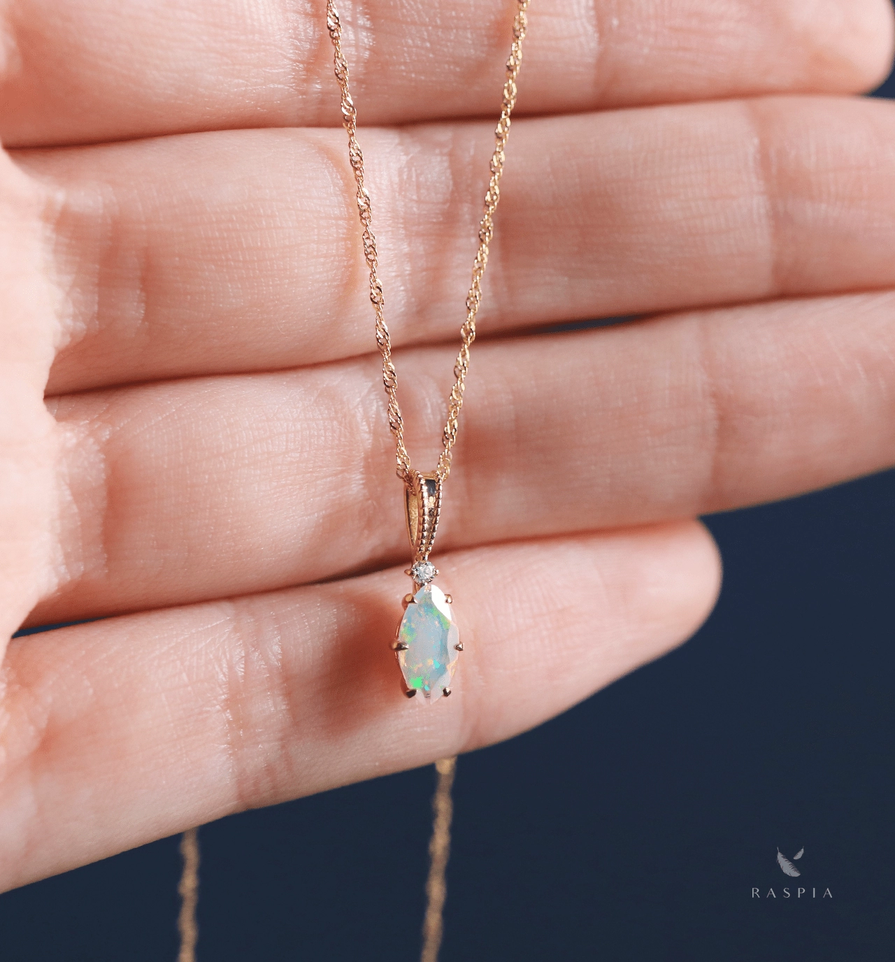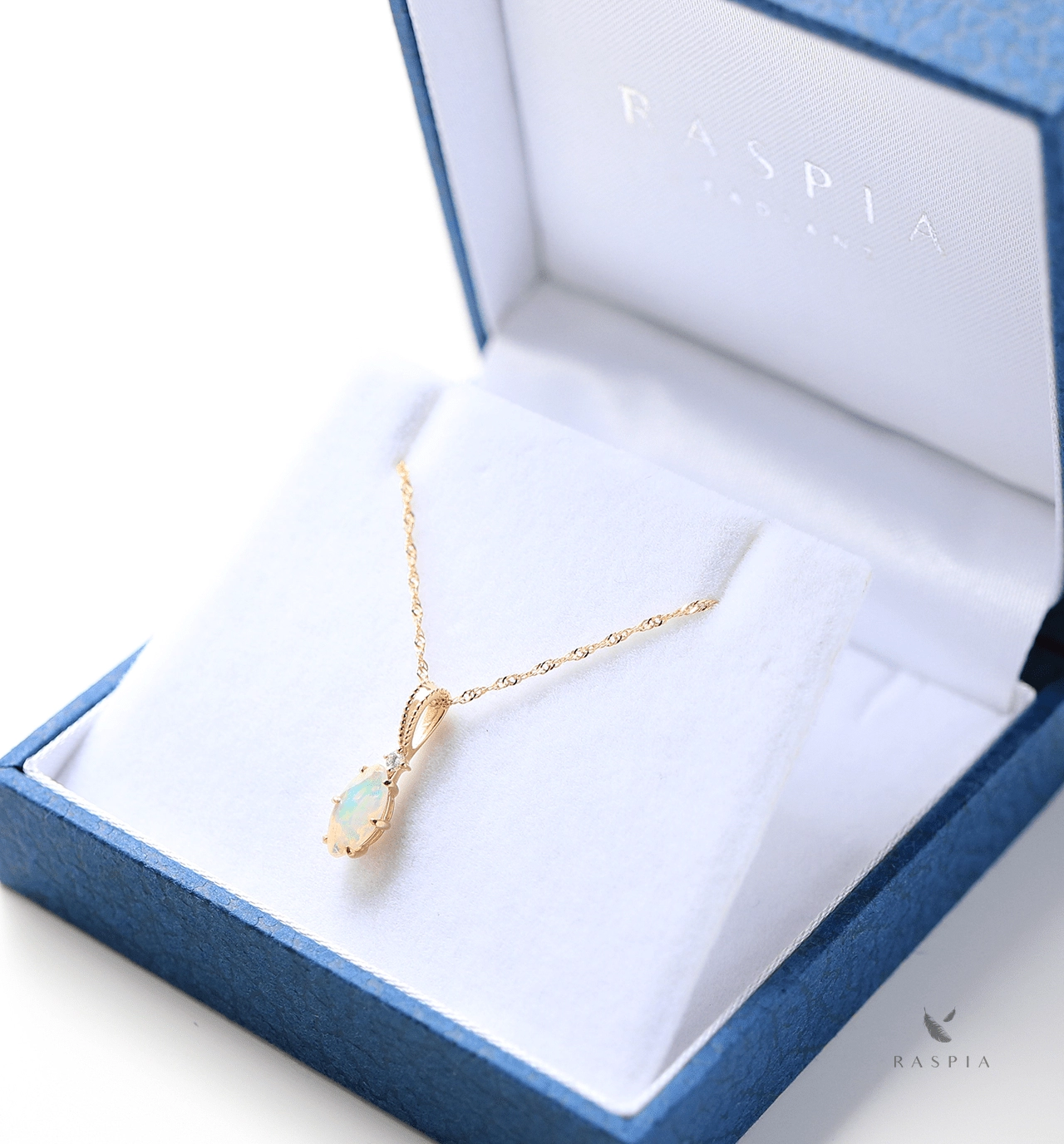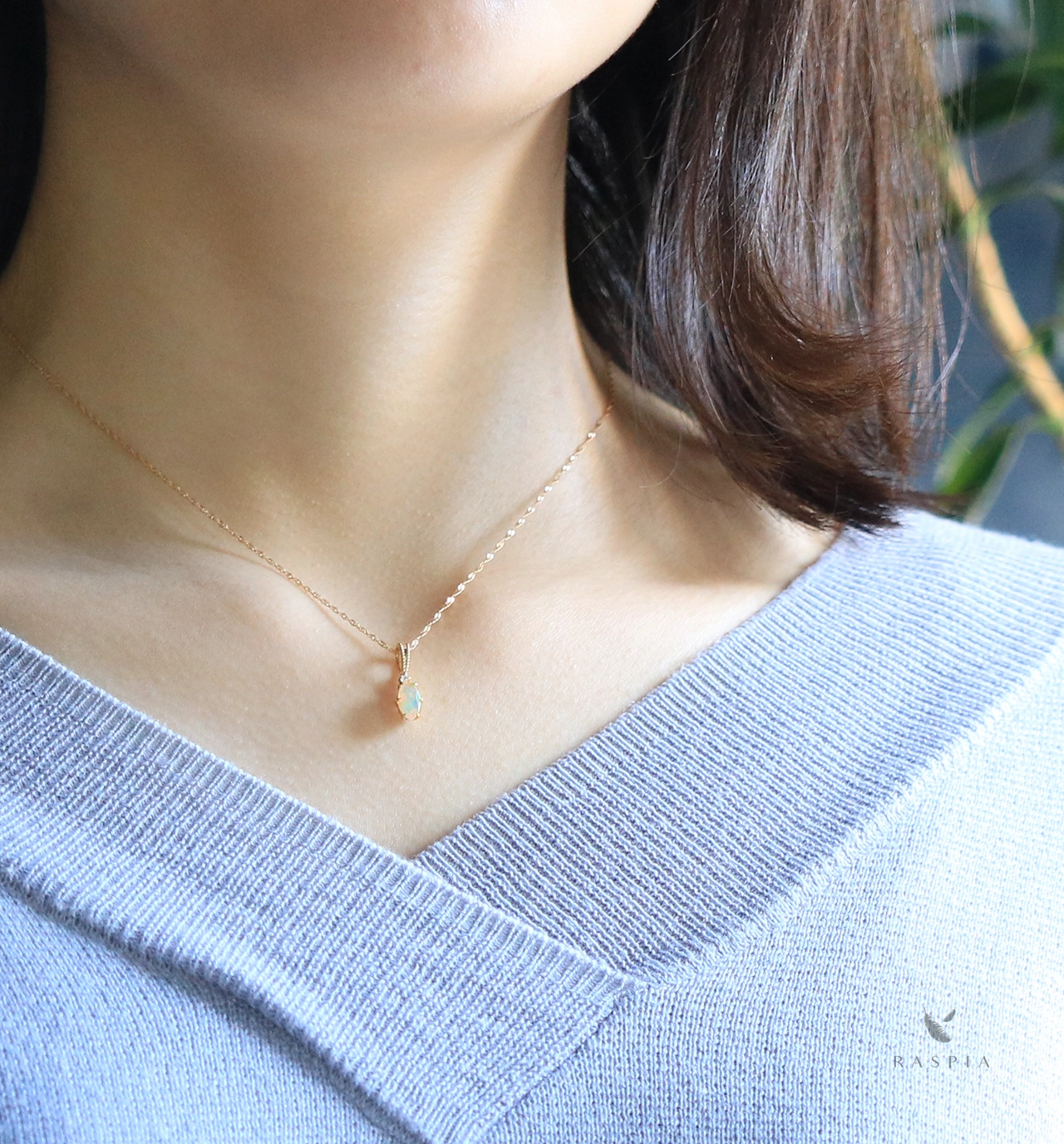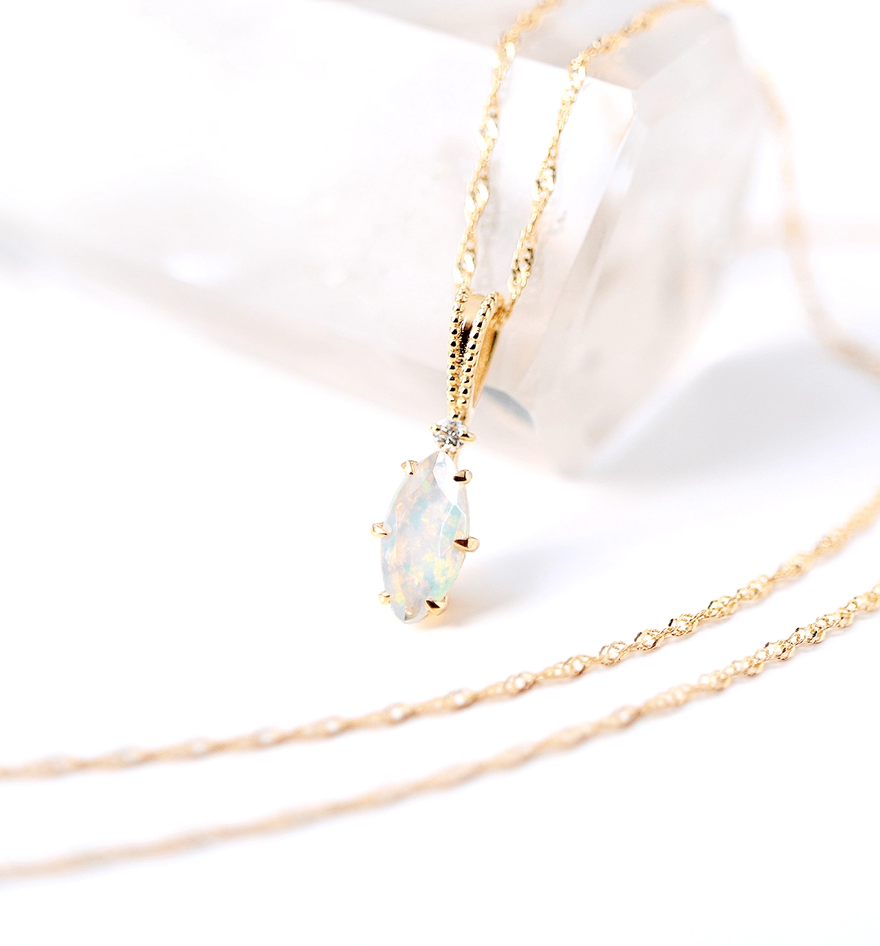 プレシャスオパールの鮮やかな遊色の美しさを最大限に引き立てる設計。金具~ダイヤ~メイン石と繋がりのある華奢で繊細なデザイン。その洗練されたシャープなペンダントトップが、優美な大人の品格を与えます。
